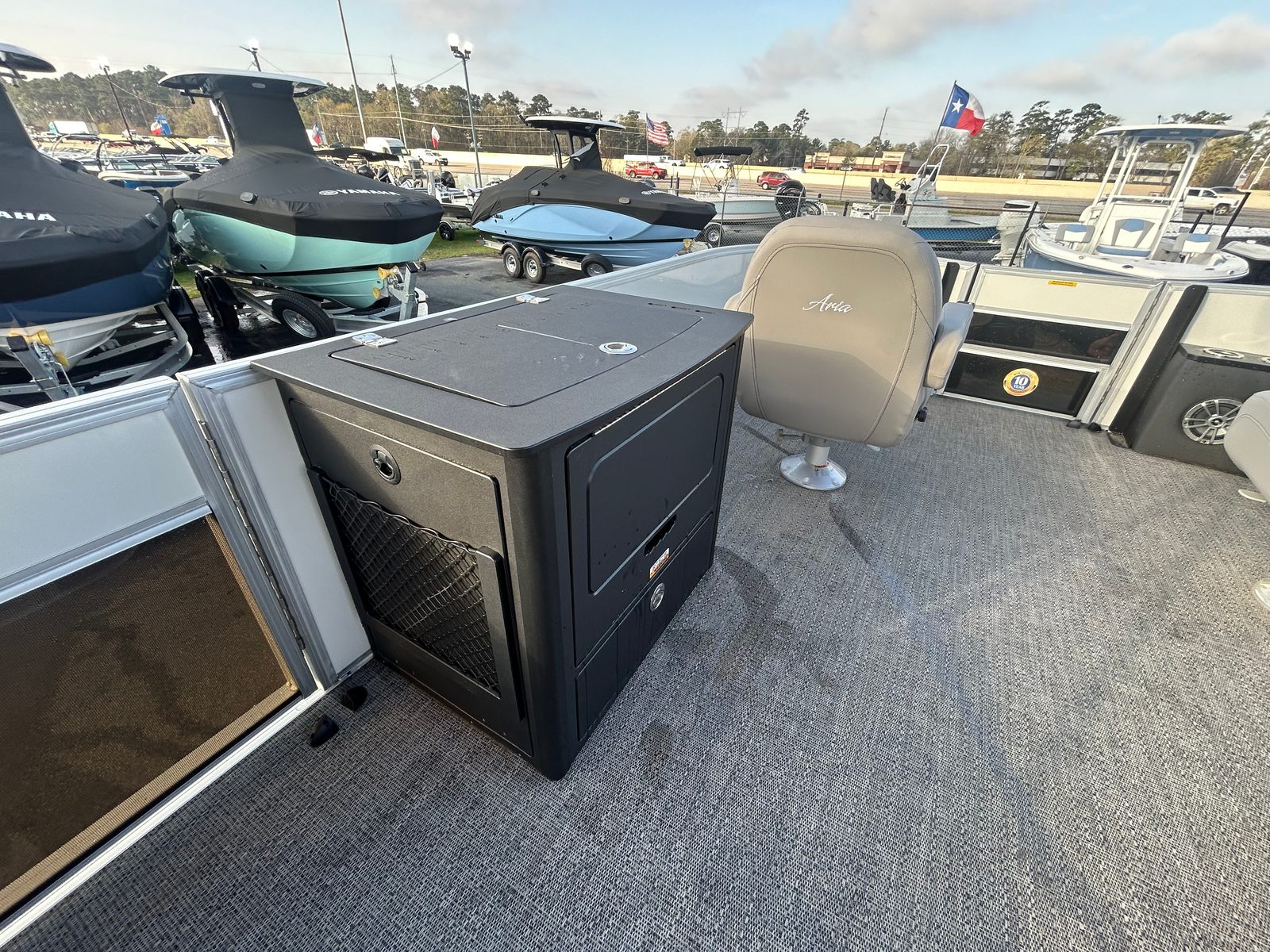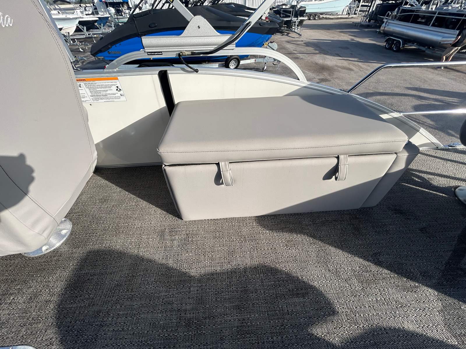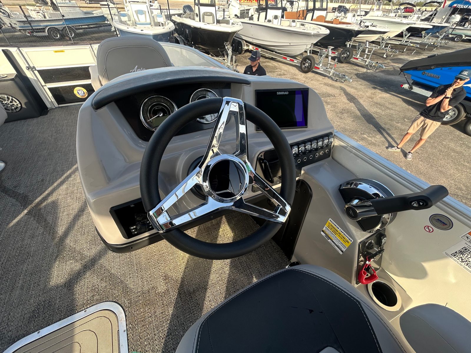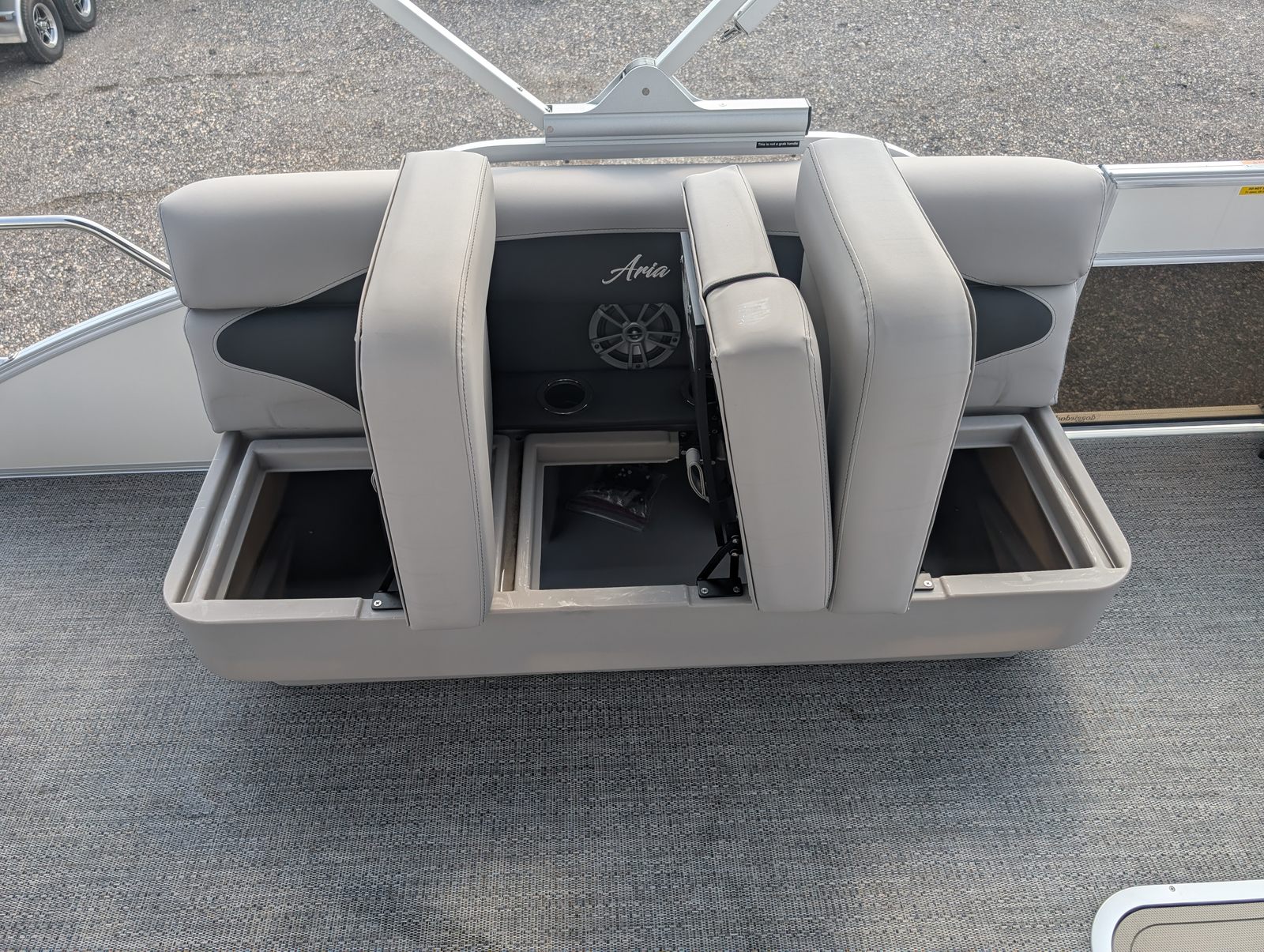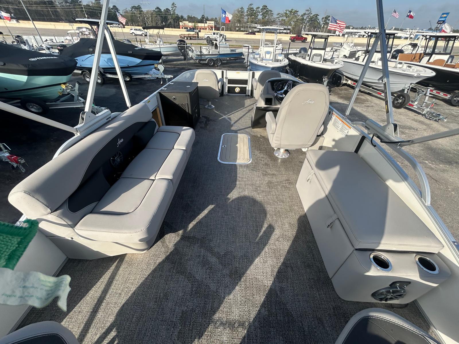 The Barletta Aria A22F is packed with premium features that set it apart in the world of pontoon boats. The Railskin Color Aria in White Opal gives the exterior a crisp, clean look, while the Tempest Gray furniture offers both comfort and visual appeal. The Amore Gray flooring is not only stylish but also practical, providing a durable and easy-to-clean surface for all your on-board activities.One of the standout features is the in-floor midship storage, which is made possible by the Triple Toon configuration. This spacious storage compartment is perfect for stowing away water toys, life jackets, and other essentials, keeping the deck clutter-free and organized. At the helm, you’ll find the advanced Simrad 7 G07 XSE, a state-of-the-art navigation and fish-finding system that enhances your boating experience with intuitive controls and clear displays.The exterior is further enhanced by a stainless steel flag pole adorned with an American flag, adding a patriotic touch to your adventures. The rigging includes a stainless steel prop, ensuring optimal performance and longevity. Every detail of the Aria A22F is thoughtfully designed to maximize your enjoyment and convenience on the water.