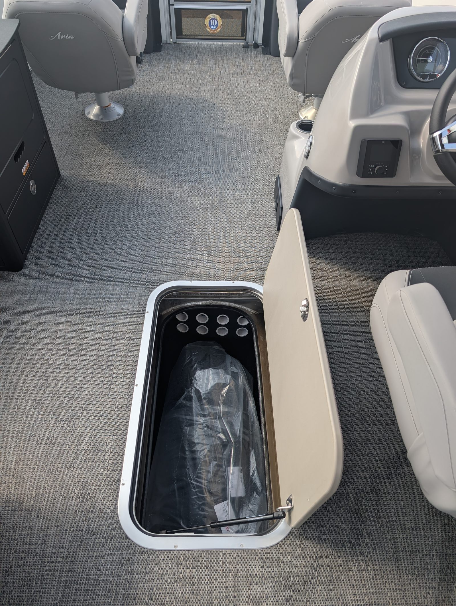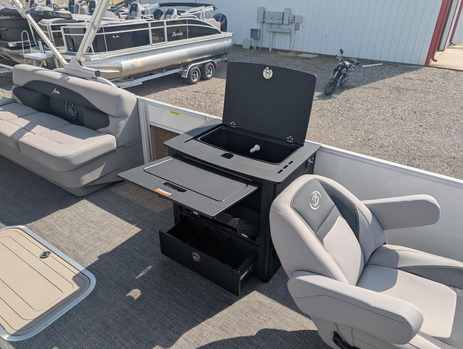 Owning the Barletta Aria A22F means embracing a lifestyle of fun, relaxation, and social connection. The spacious deck layout provides ample room for family and friends to gather, lounge, and enjoy the sunshine. The plush Tempest Gray furniture invites you to sit back and unwind, while the open floor plan encourages easy movement and interaction.The Triple Toon Package not only enhances performance but also contributes to a smoother, more stable ride, reducing the impact of waves and making it comfortable for passengers of all ages. The in-floor midship storage ensures that your gear is always within reach yet out of the way, allowing you to focus on making memories rather than managing clutter.With the Simrad 7 G07 XSE at the helm, navigation becomes effortless, whether you’re exploring new waters or returning to your favorite spots. The combination of advanced technology, premium materials, and thoughtful design makes every outing on the Aria A22F a truly enjoyable experience.