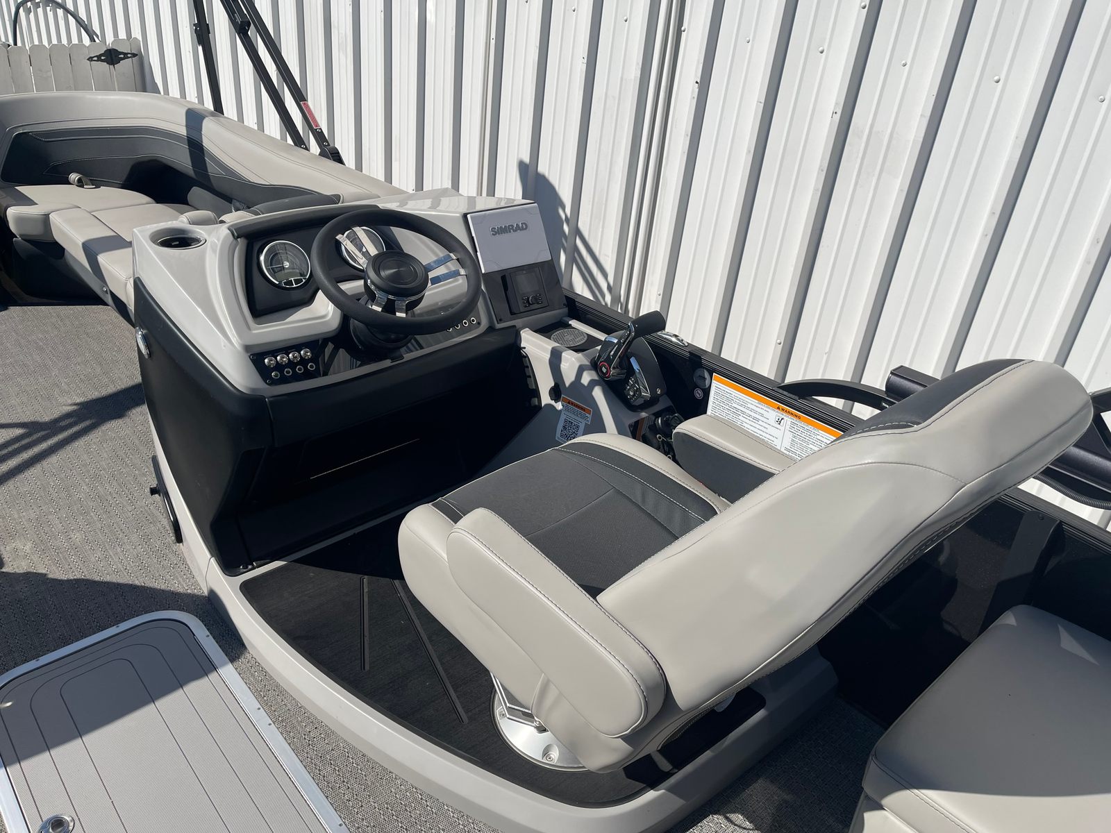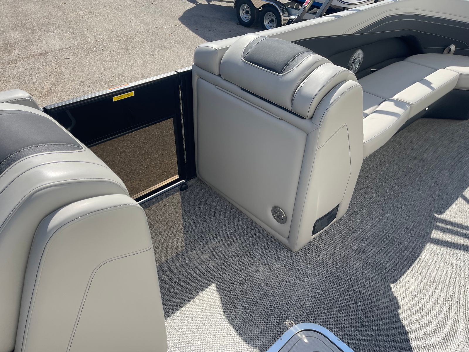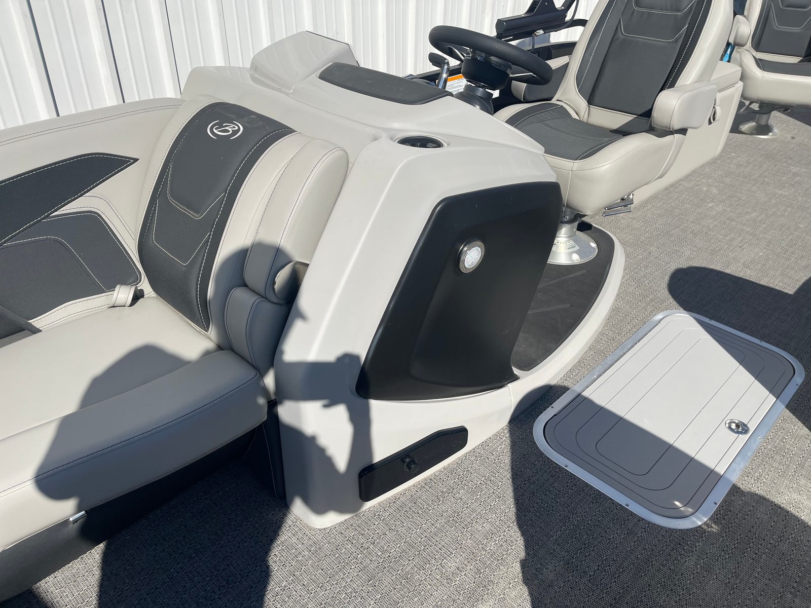 This Barletta pontoon boat is loaded with features designed to elevate your time on the water. The Blackout Package Cabrio adds a bold and contemporary aesthetic, while the adjustable pedestal on the captain’s chair ensures optimal comfort and visibility for the driver. The double bimini canvas provides generous shade, allowing you and your guests to stay cool and protected during sunny days.Digital gauges offer clear and accurate readouts, keeping you informed of all vital systems at a glance. The rigged engine with a stainless steel prop ensures durability and efficient performance, while the triple toon package with midship storage not only boosts stability but also provides convenient space for stowing gear and water toys.