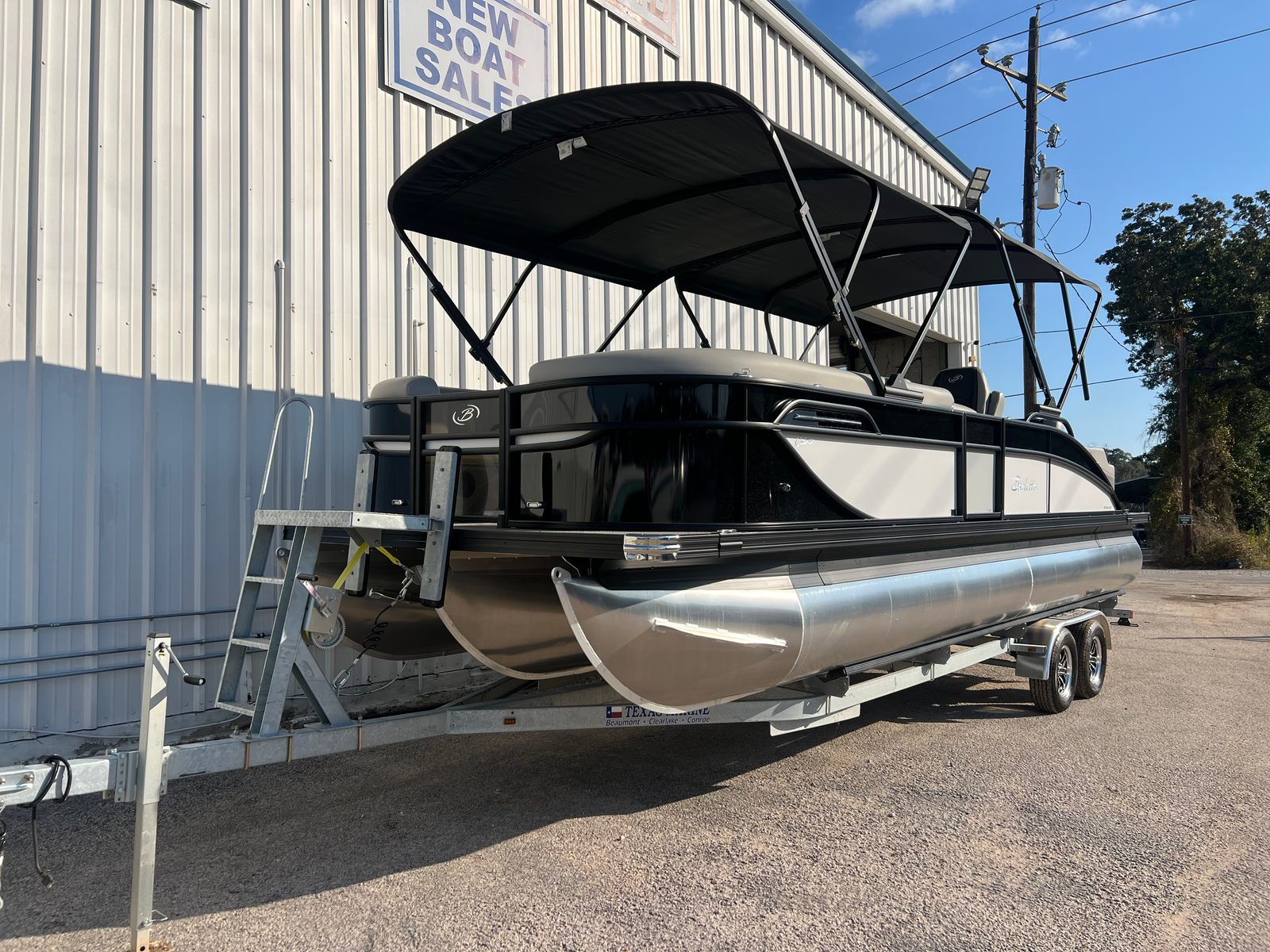 The 2026 Barletta Cabrio C24UC is a pontoon boat that measures an impressive 25.17 feet in length, offering ample space for passengers and gear. Its sleek profile is enhanced by the striking Railskin Color in Black Diamond, accented with Winter White, and complemented by the Blackout Package Cabrio. The furniture features a sophisticated Marquesan Gray/Onyx palette, while the Amore Gray flooring adds a touch of elegance and durability. With its triple toon package and midship storage, this Barletta boat for sale is designed for both comfort and practicality, making it an ideal choice for boaters who demand the best.