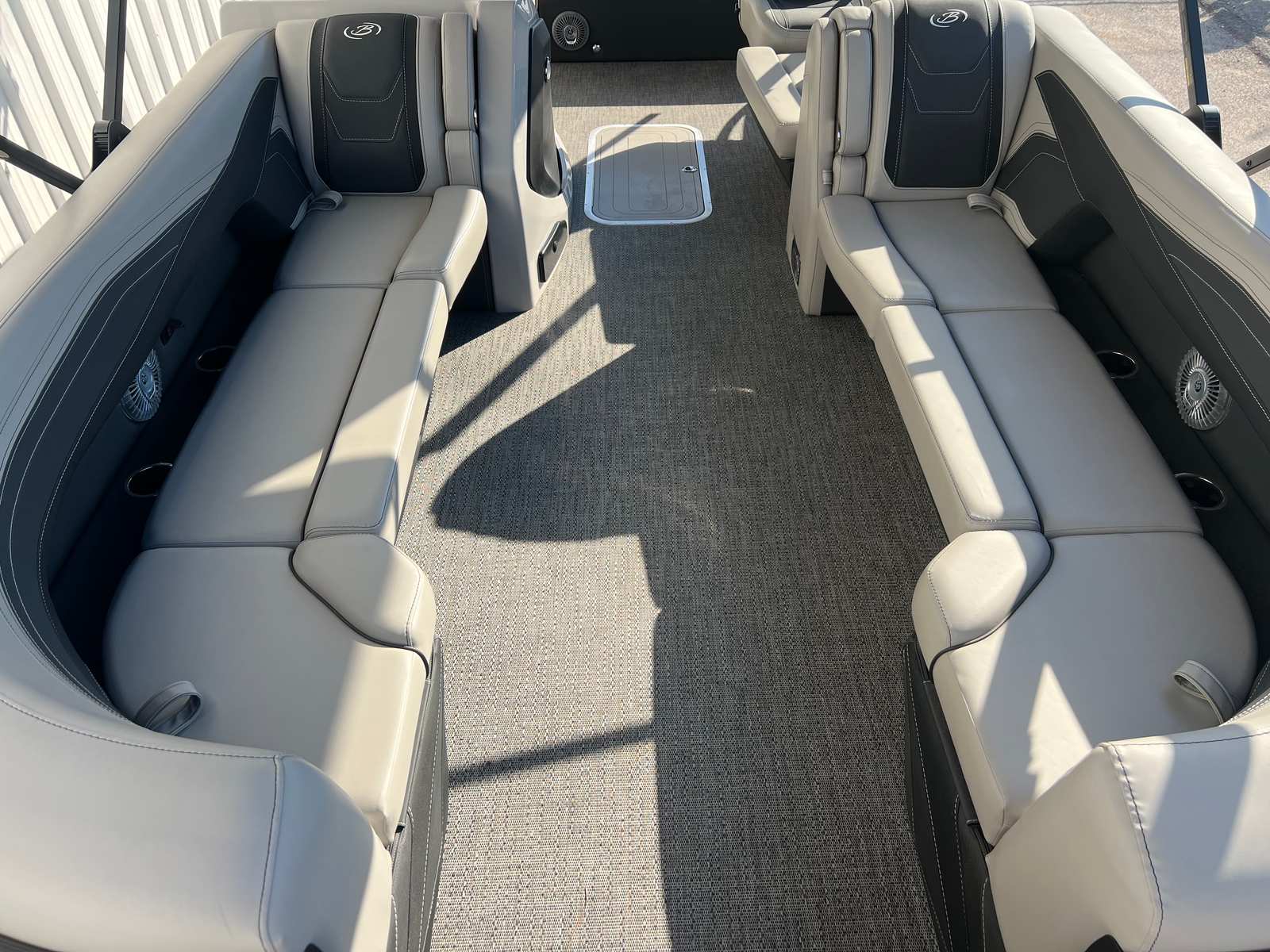 Powering the Cabrio C24UC is a Mercury (D) 250L Verado V8 engine, delivering a robust 250 horsepower with only one engine hour. This powerhouse ensures smooth acceleration, impressive top speeds, and reliable performance for all your adventures. The Mercury Digital DTS Pre-Rig for VERADO engines with Vessel Link provides seamless digital control, while hydraulic and power assist steering make maneuvering effortless. Digital gauges offer precise monitoring of engine metrics, and the rigging includes a stainless steel prop for enhanced durability and efficiency. Whether you’re cruising, towing water toys, or exploring new waters, this pontoon boat is engineered to perform.