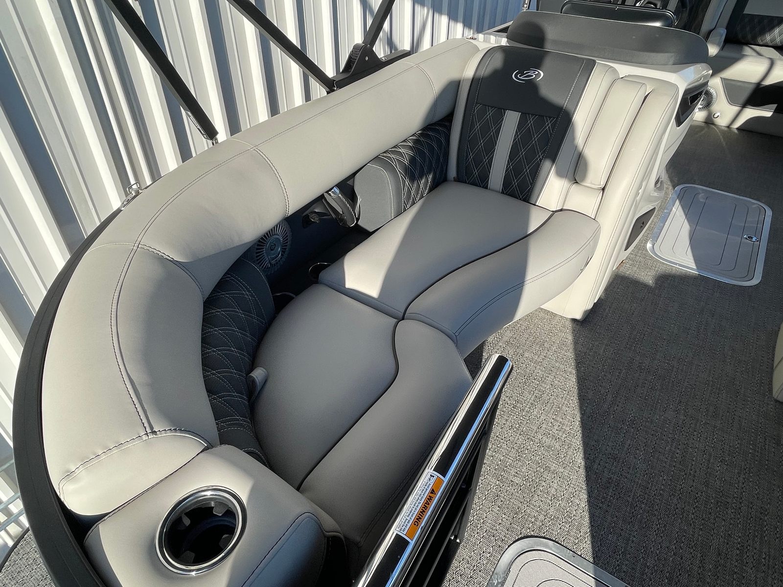 Step aboard the Barletta Lusso L23U and discover a world of luxury and innovation. The Marquesan Gray with Onyx furniture creates a refined and inviting atmosphere, perfectly complemented by the Amore Gray flooring that is both stylish and easy to maintain. The double bimini canvas provides ample shade, ensuring comfort during sunny days on the water. The exterior is protected by a Metal Jacket Protectant, preserving the boat’s pristine appearance and enhancing longevity. Every detail, from the railskin packages to the digital controls, has been selected to elevate your boating experience and make every outing memorable.