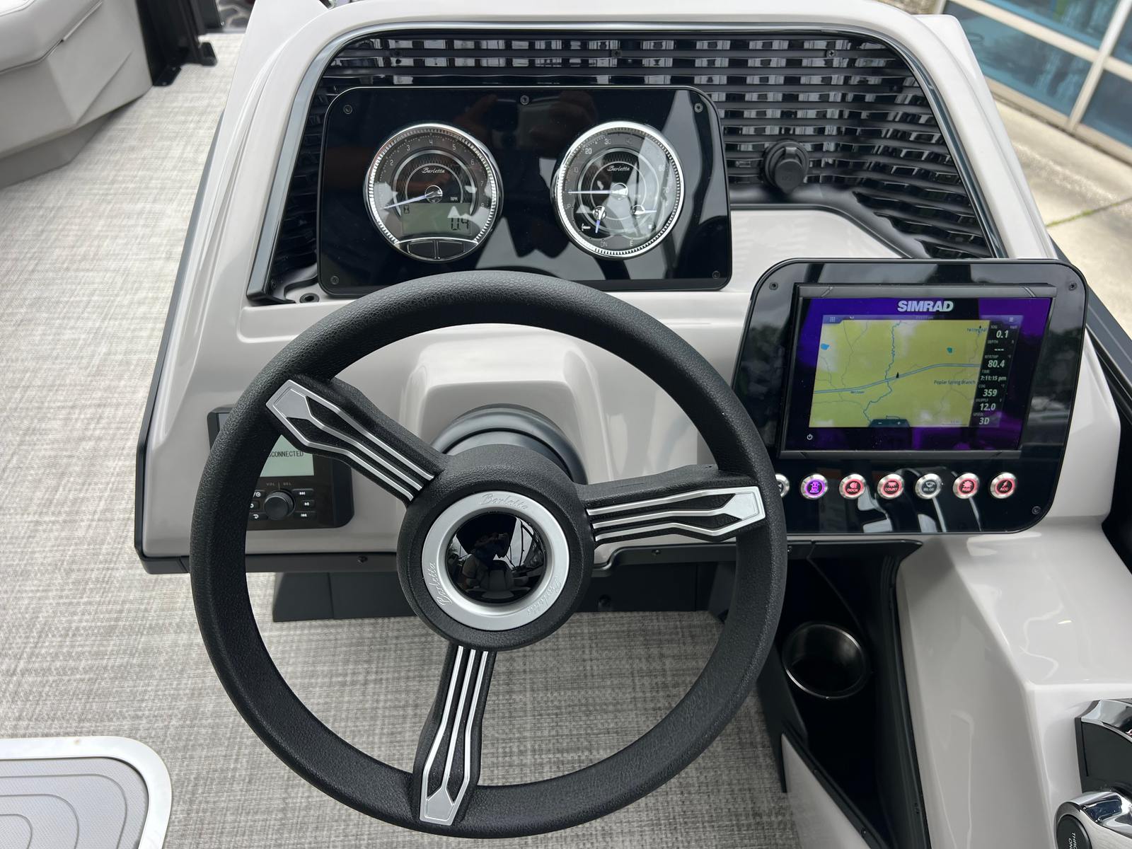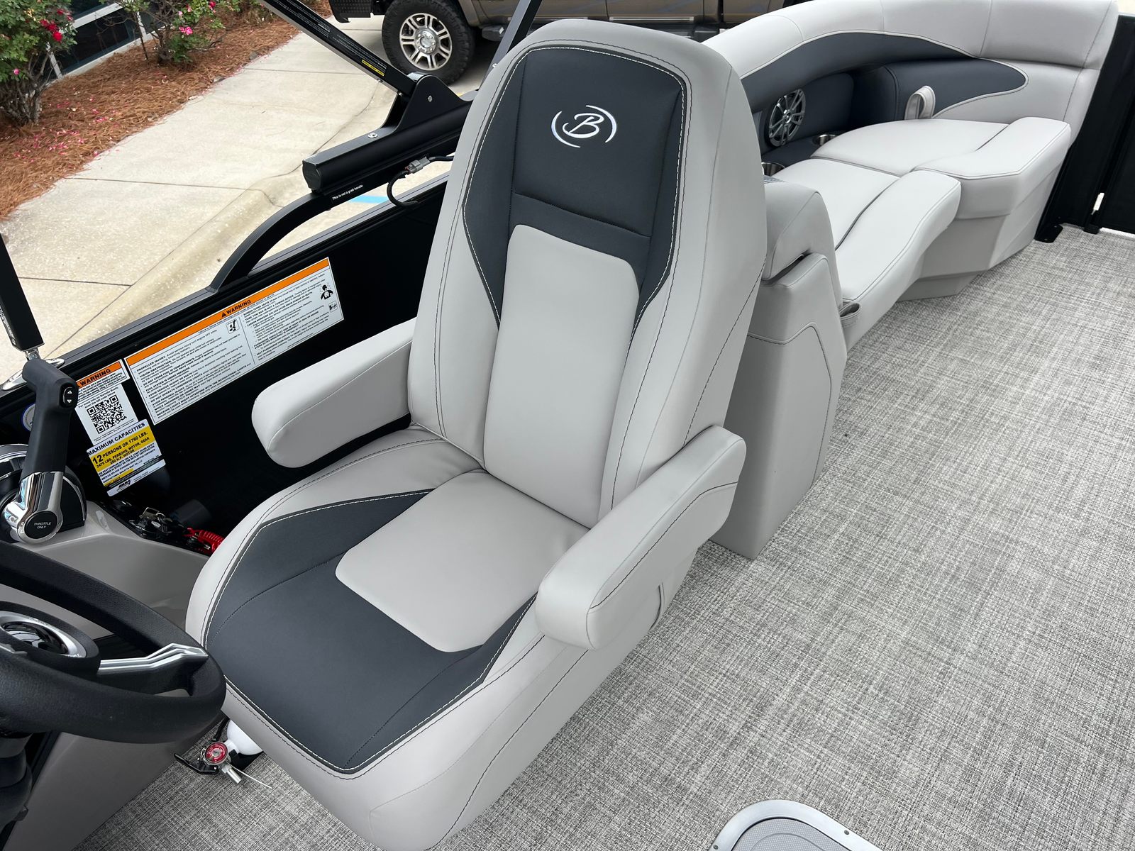 This Barletta pontoon boat is loaded with premium features designed to elevate your time on the water. The Aria Triple Toon Package provides enhanced stability and performance, making it ideal for a variety of activities. The railskin color in Black Diamond, paired with the Aria Blackout Package, creates a striking visual statement, while the Tempest Gray furniture and Alpine Gray flooring offer a sophisticated and comfortable interior.Practicality meets style with the clipped playpen cover and poles, ensuring your boat stays protected from the elements when not in use. The in-floor midship storage is a standout feature, providing ample space to stow away gear, water toys, or picnic supplies, keeping the deck clutter-free and organized.