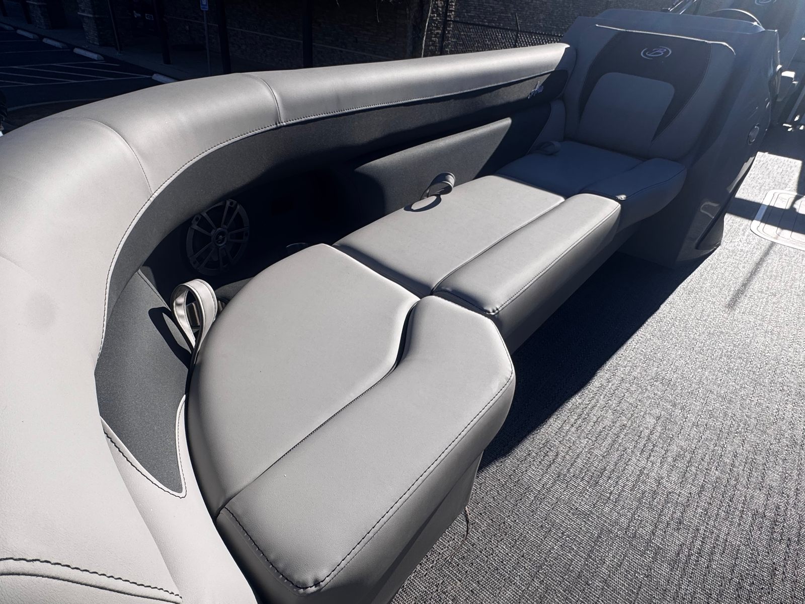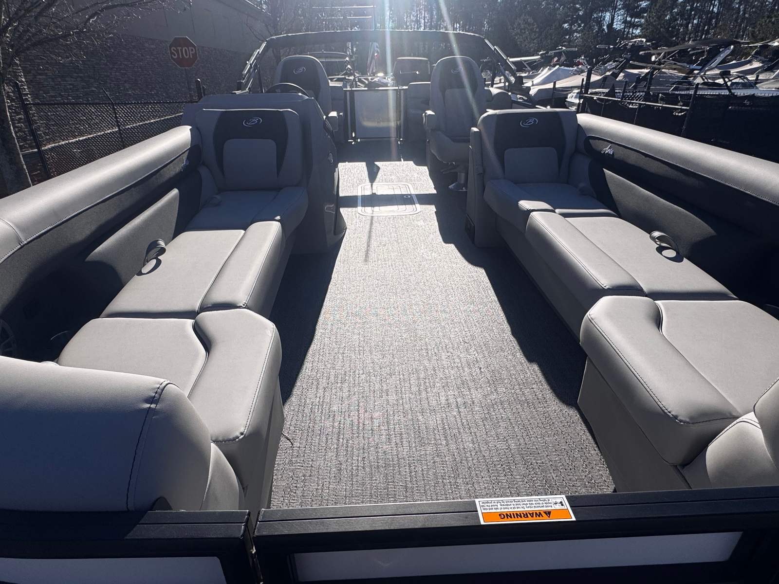 The Barletta Aria A24QC pontoon boat for sale is packed with premium features designed to maximize your enjoyment and convenience. The Blackout Package Aria adds a bold and modern touch to the exterior, while the Winter White Railskin provides a clean and timeless appeal. Inside, the Tempest Gray furniture offers plush seating and ergonomic design, perfect for relaxing or socializing with guests. The Amore Gray flooring is both stylish and practical, providing a comfortable surface that’s easy to maintain.One of the standout features is the in-floor midship storage, offering ample space to stow your gear, water toys, and essentials without cluttering the deck. The stainless steel flag pole with an American flag adds a patriotic flair and a touch of elegance to the boat’s exterior. The Triple Toon Package Aria not only boosts performance but also increases passenger capacity and stability, making it ideal for larger groups and active days on the water.