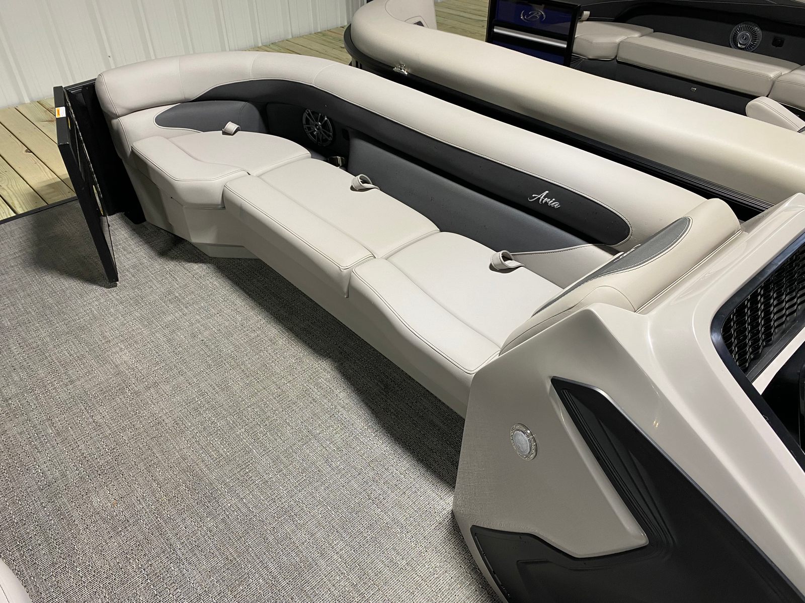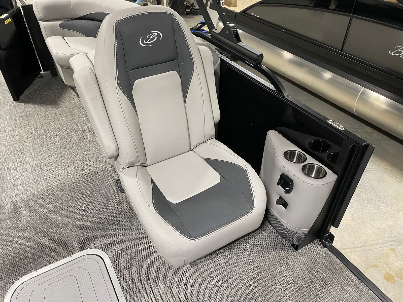 The 2026 Barletta Aria A24QC is packed with special features that set it apart in the world of pontoon boats. The striking Railskin Color Aria in Black Diamond, paired with the Blackout Package Aria, gives this pontoon a sleek and modern appearance that is sure to turn heads at the marina. The Tempest Gray furniture offers a sophisticated and inviting atmosphere, while the Amore Gray flooring provides both durability and style underfoot. The Triple Toon Package Aria enhances the boat's stability and handling, making it perfect for a variety of water activities. The stainless steel flag pole with an American flag adds a patriotic touch, making every outing feel like a celebration. With a length of just over 23 feet, the Aria A24QC offers ample space for friends and family to relax, socialize, and enjoy the water in comfort.