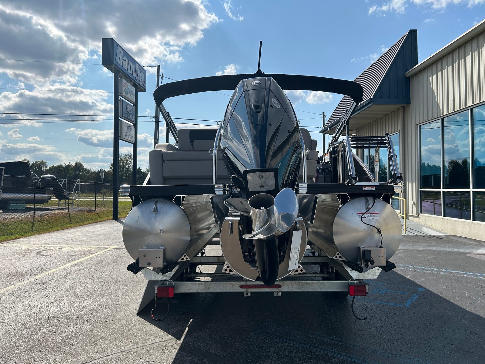 The 2026 Barletta Aria A24UC is loaded with features that set it apart from other pontoon boats for sale. The exterior showcases a stainless steel flag pole adorned with an American flag, adding a touch of patriotic flair to your boating experience. The Black Diamond railskin color, complemented by the Gray Moonstone accent and Blackout Package Aria, creates a striking visual appeal. Inside, the Tempest Gray furniture offers plush comfort and a modern look, while the Amore Gray flooring provides a stylish and easy-to-clean surface underfoot. The Triple Toon Package Aria enhances stability and performance, ensuring a smooth and enjoyable ride even in choppier waters.