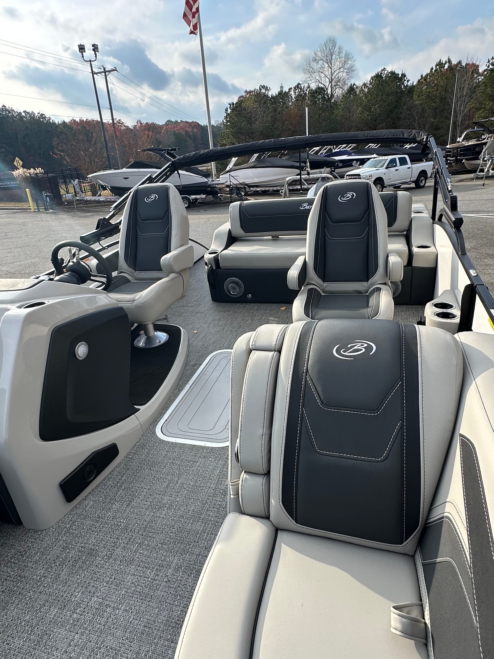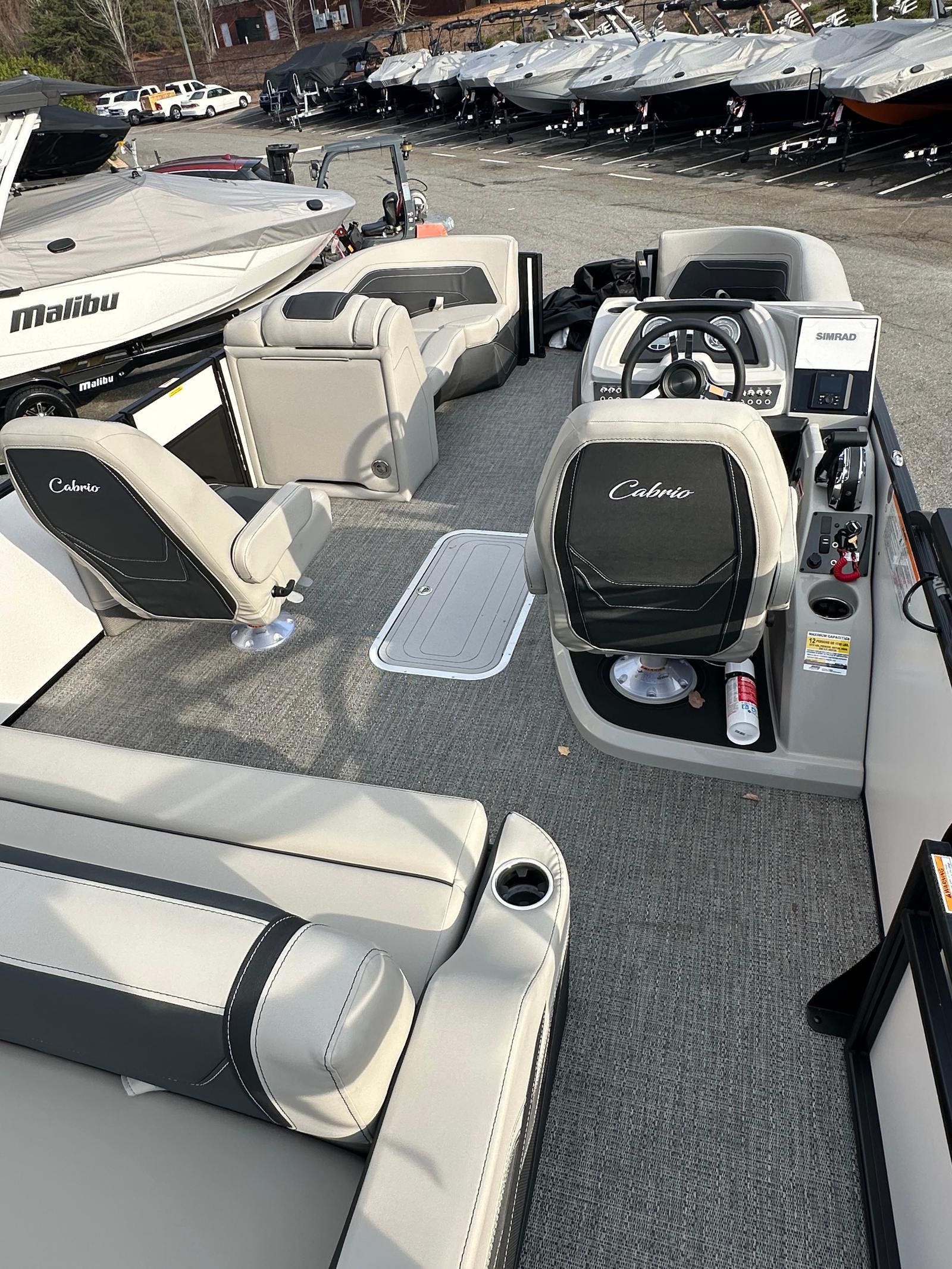The Barletta Cabrio C22UC is packed with thoughtful features and high-end finishes that set it apart from other pontoon boats for sale. The Railskin Color in Champagne, accented by Winter White, creates a sophisticated and timeless look, while the Blackout Package Cabrio adds a bold, modern edge. Inside, the Marquesan Gray furniture with Onyx accents offers plush comfort and contemporary style, perfectly complemented by the Amore Gray flooring that is both attractive and easy to maintain.For those who value storage and convenience, the Triple Toon Package with Midship Storage - Cabrio provides ample space for all your gear, water toys, and essentials. The onboard battery charger with two batteries ensures you have reliable power for all your electronics and accessories, so you can stay connected and enjoy extended days on the water without worry.