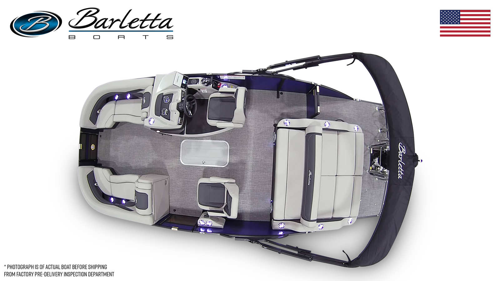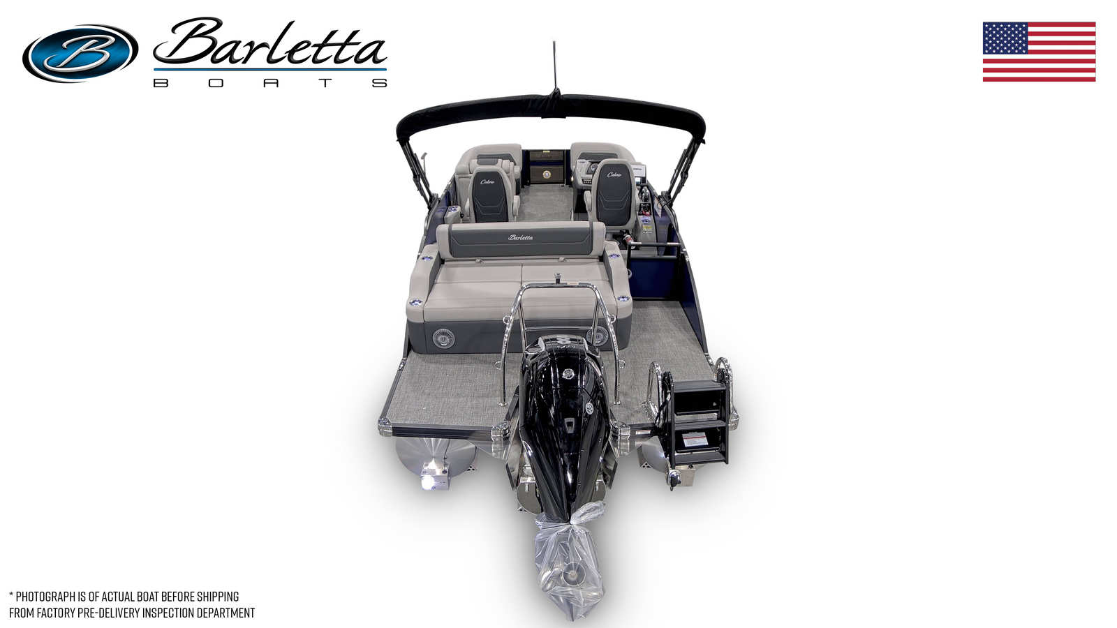Step aboard the Barletta Cabrio C22UC and discover a world of premium features designed to elevate your boating experience. The Triple Toon Package with Midship Storage – Cabrio provides enhanced stability, buoyancy, and storage capacity, making it ideal for extended outings and accommodating all your gear. The furniture is finished in Marquesan Gray with Onyx accents, offering plush seating and a sophisticated ambiance that invites relaxation and socializing. The Amore Gray flooring adds a touch of elegance while providing durability and easy maintenance, perfect for busy days on the water.The exterior is adorned with a stainless steel flag pole and an American flag, showcasing your pride and adding a classic touch to the boat’s profile. The Railskin Packages, including the Blackout Package Cabrio, not only enhance the boat’s aesthetic appeal but also provide added protection and durability. Every detail, from the color accents to the high-quality rigging, reflects Barletta’s dedication to excellence and innovation.