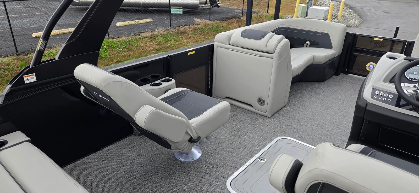 The 2026 Barletta Cabrio C22UC pontoon stretches to an impressive length of 23.17 feet, providing ample space for entertaining, relaxing, and enjoying the open water. As a new model, it showcases the latest advancements in pontoon design and technology, ensuring you benefit from modern amenities and superior build quality. The sleek Railskin Color in Gray Moonstone, accented by Black Diamond, gives this pontoon a sophisticated and contemporary look, while the Blackout Package Cabrio adds a touch of boldness and exclusivity. The Marquesan Gray with Onyx furniture and Amore Gray flooring create a refined and inviting atmosphere, making every outing feel like a luxury escape.