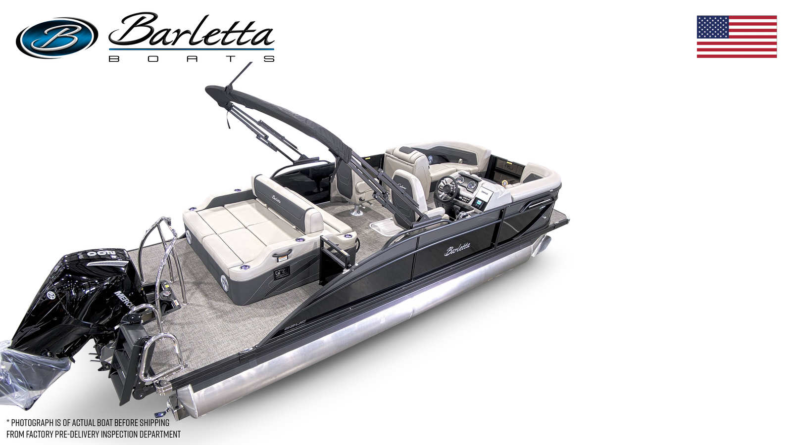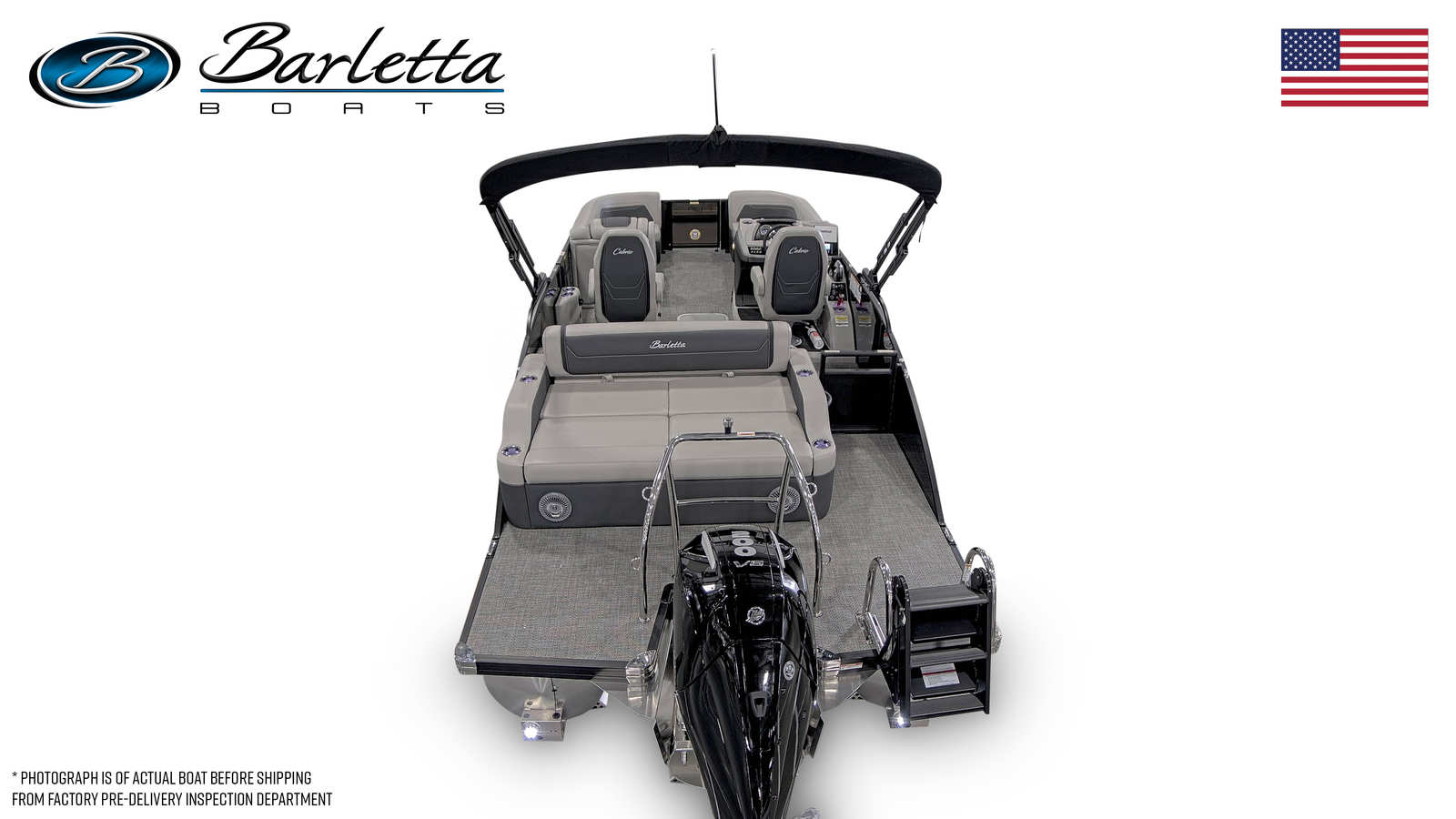 Step aboard the Barletta Cabrio C22UC and discover a world of comfort and convenience. The Marquesan Gray/Onyx furniture offers plush seating and a refined aesthetic, perfectly complemented by the Amore Gray flooring that’s both stylish and easy to maintain. The Triple Toon Package with midship storage provides enhanced stability, smoother rides, and generous space for stowing your essentials. The Blackout Package Cabrio adds a touch of elegance, while the stainless steel flag pole with an American flag showcases your pride and adds a unique finishing touch.