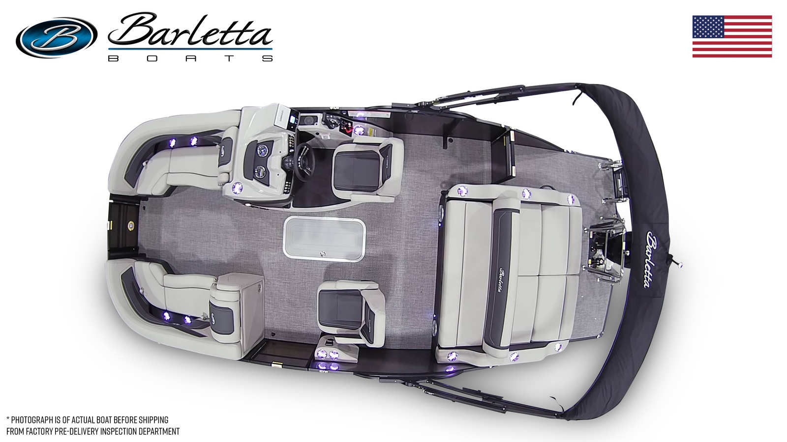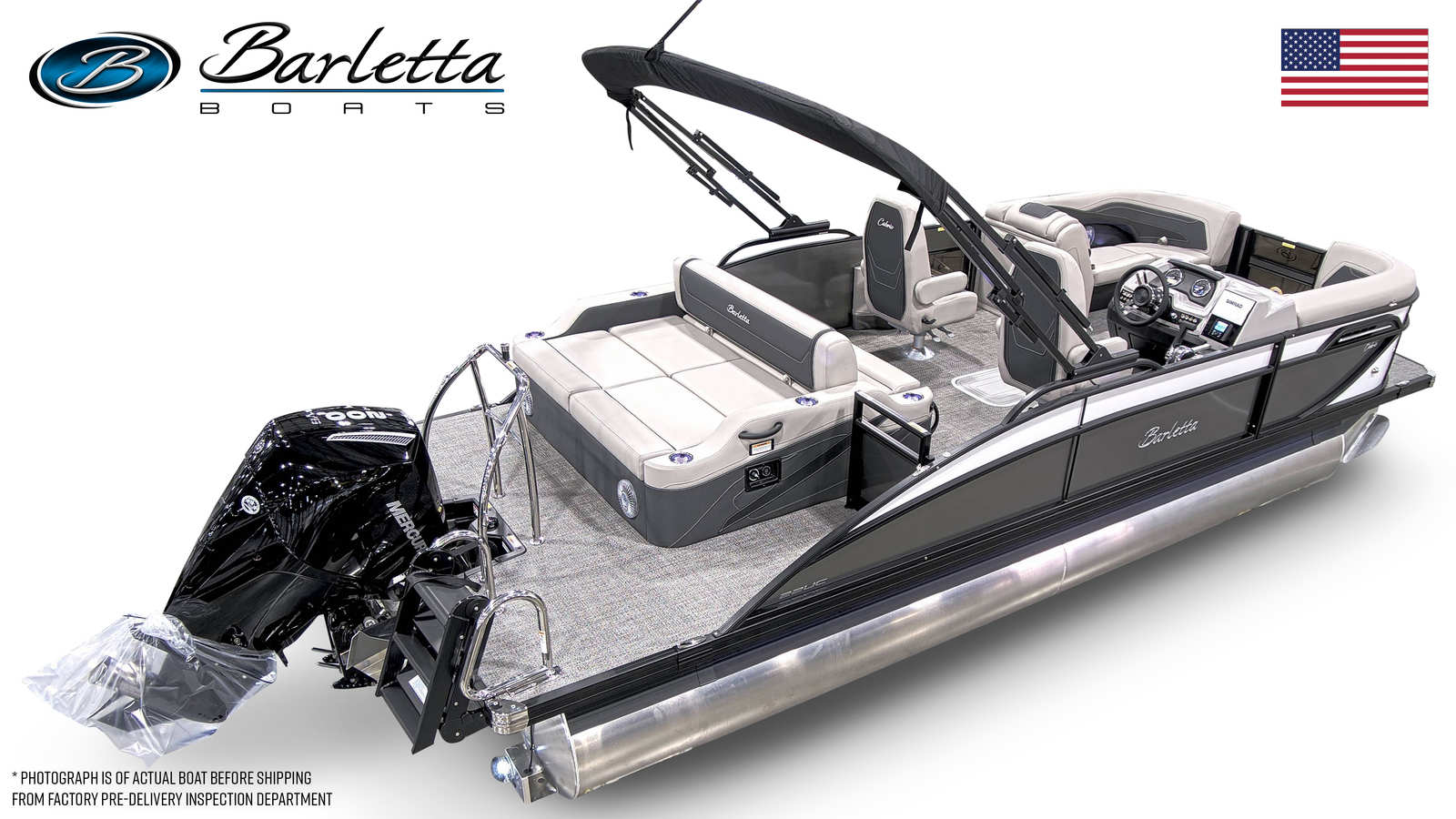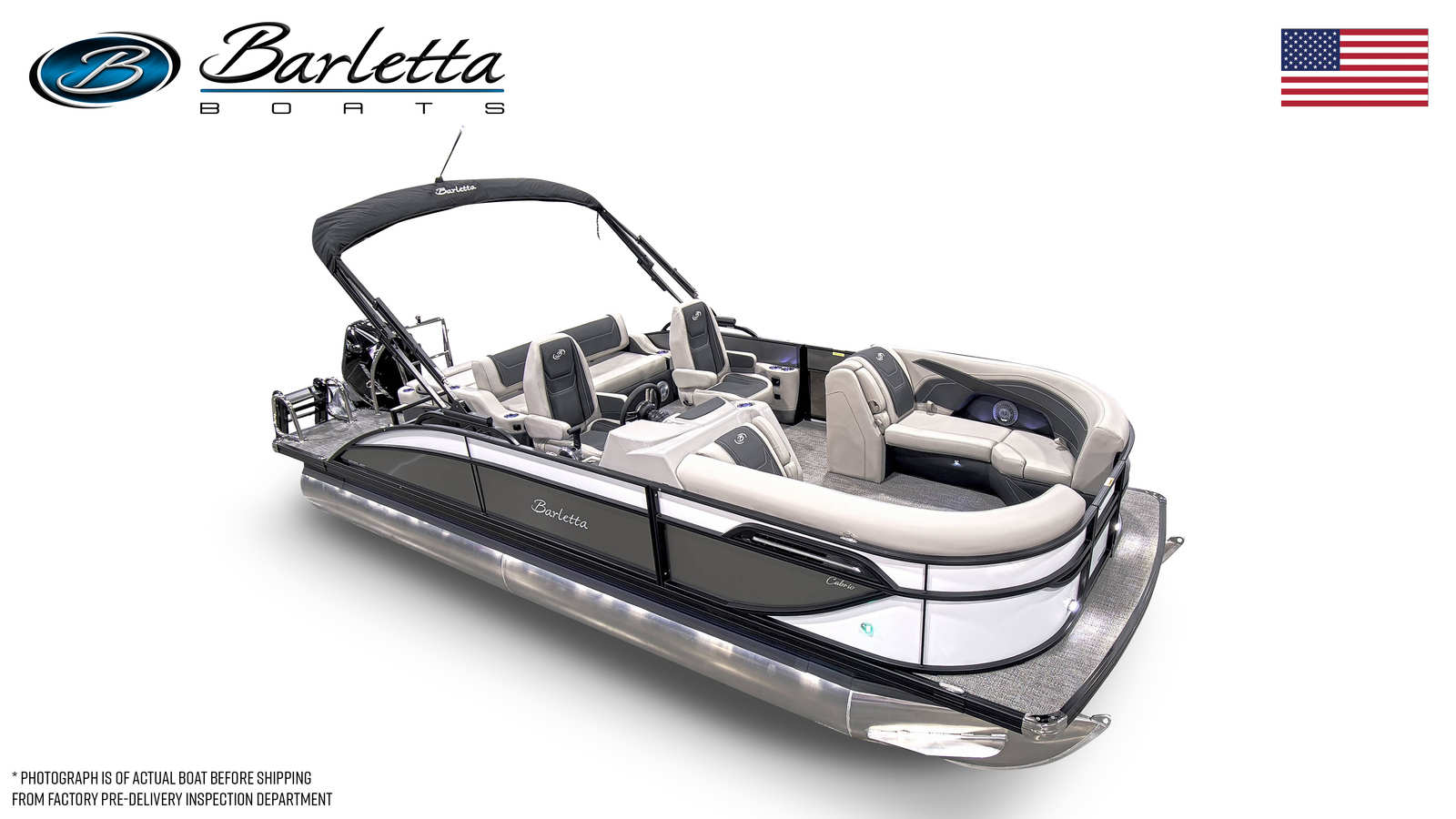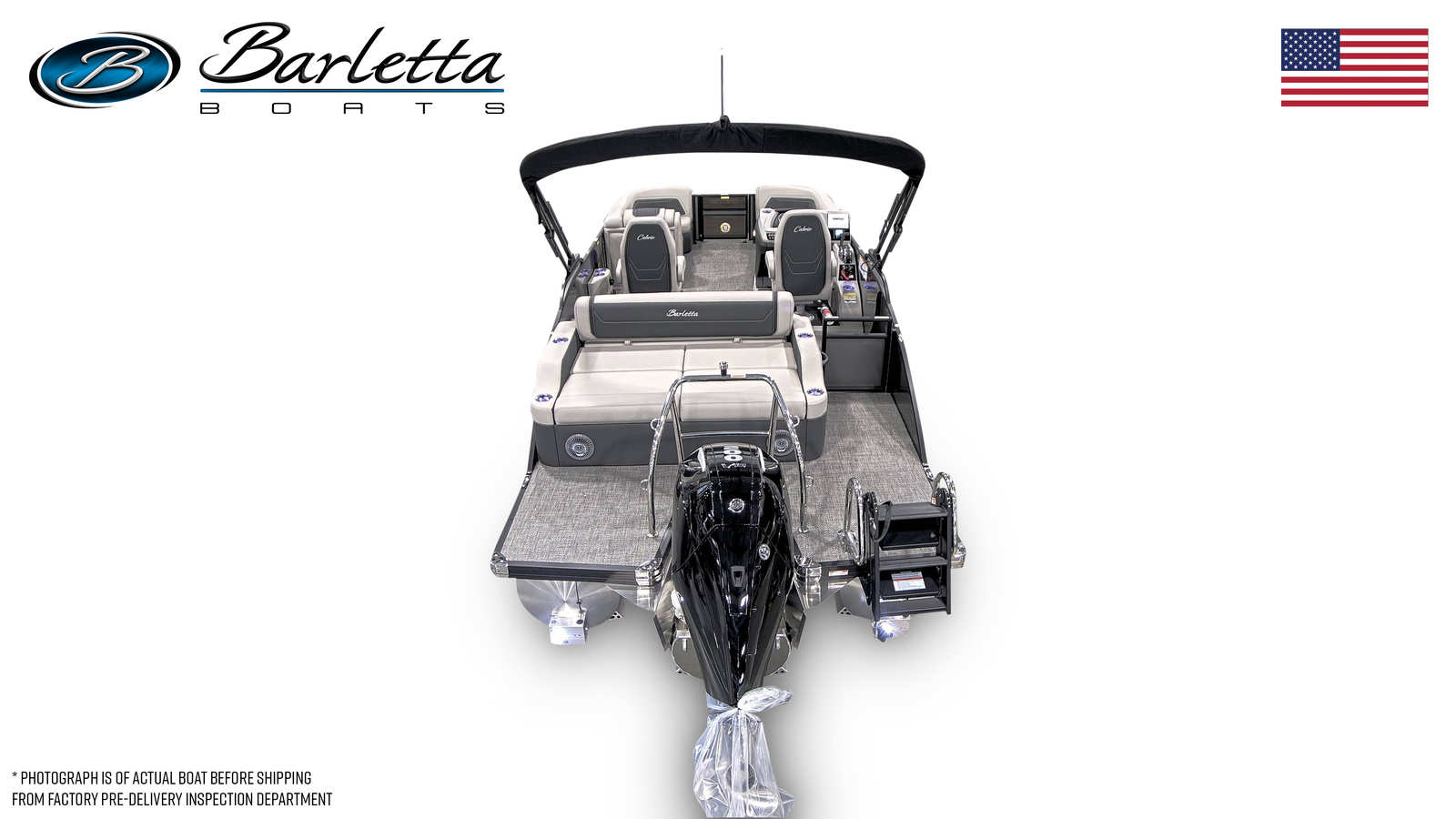 The Barletta Cabrio C22UC is loaded with features that elevate comfort, convenience, and style. The triple toon package with midship storage provides enhanced stability and additional space for gear, making it easy to keep the deck clutter-free and organized. The furniture is finished in elegant Marquesan Gray with Onyx accents, offering plush seating and a refined atmosphere for you and your guests. The Amore Gray flooring is both stylish and practical, providing a durable, easy-to-clean surface that stands up to the demands of active days on the water.The railskin color combination of Winter White and Gray Moonstone, along with the Blackout Package Cabrio, gives the boat a contemporary edge that is sure to turn heads. The stainless steel flag pole with an American flag adds a patriotic touch, perfect for celebrating holidays or simply showing your pride while out on the water.