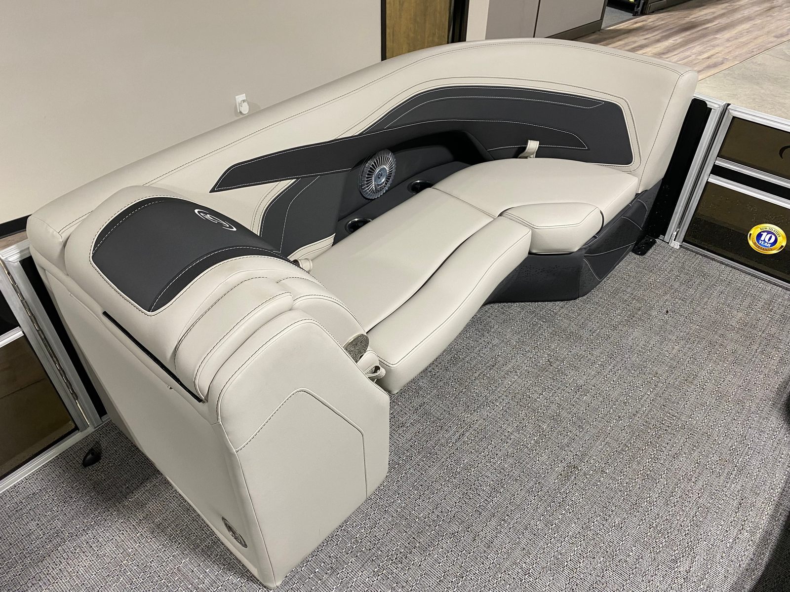 The Barletta Cabrio C22UC is loaded with features that set it apart from other pontoon boats for sale. The Black Diamond Railskin color gives the boat a modern and striking appearance, while the Marquesan Gray with Onyx furniture provides a plush and inviting seating area for all your guests. The Amore Gray flooring is both attractive and practical, designed to withstand the elements and provide a comfortable surface underfoot.The Triple Toon Package with Midship Storage not only improves the boat’s performance but also offers convenient storage solutions for your gear and essentials. The Mercury (M) 150L Four Stroke engine ensures reliable power, and the Mercury - Mechanical controls make operation straightforward and enjoyable. The Drop Ship Engine - NO PROP configuration allows for customization based on your preferences.For those who appreciate the finer details, the Barletta Cabrio C22UC includes a stainless steel flag pole with an American flag, adding a patriotic touch to your boating experience. The exterior lighting features white underdeck and underwater lights, creating a captivating ambiance during evening cruises. Inside, the RGB Lighting Package allows you to set the mood with customizable colors, making every outing unique and memorable.