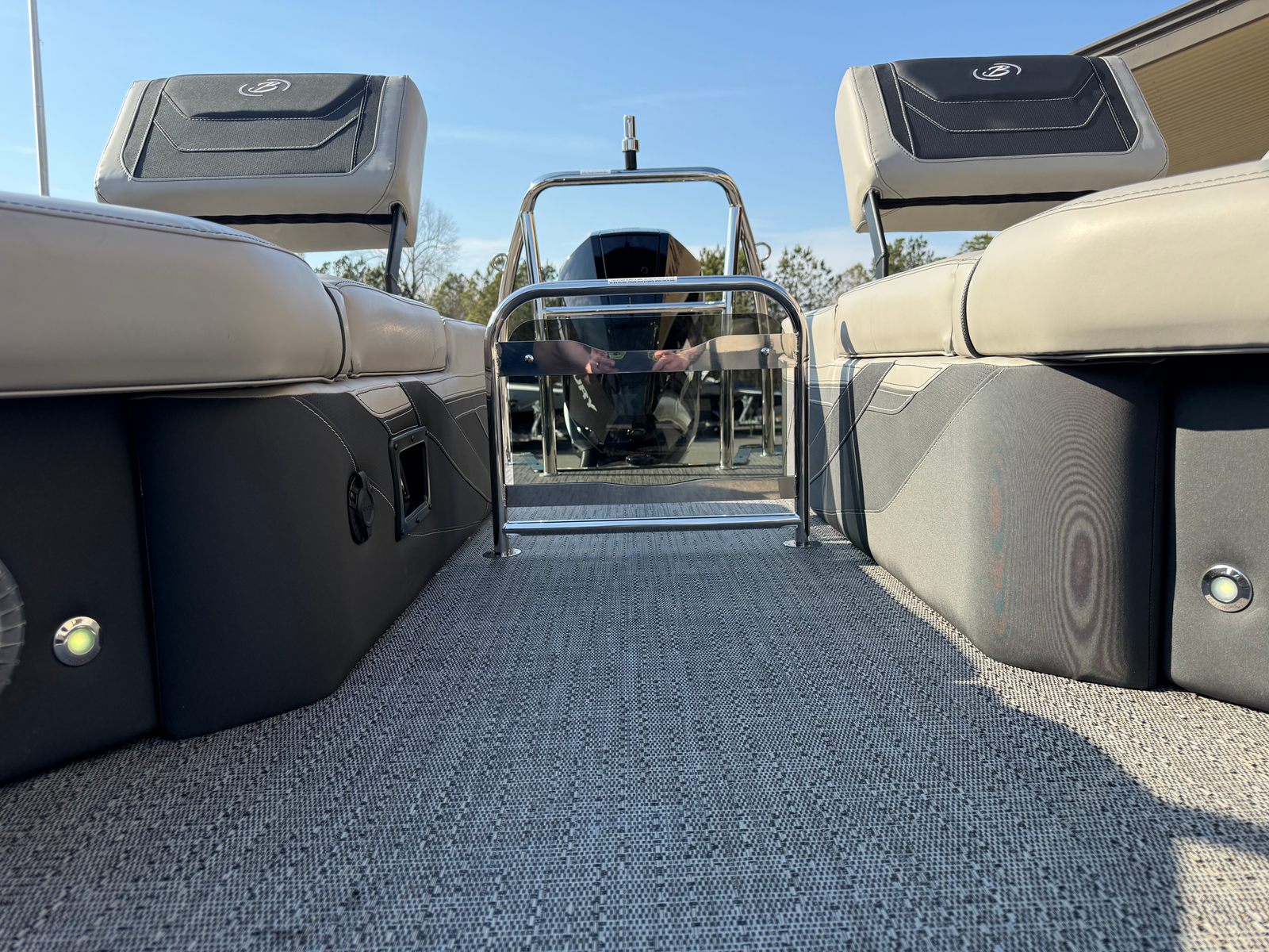 The 2026 Barletta Cabrio C24M is a stunning pontoon boat measuring just over 25 feet in length, offering ample space for relaxation, entertainment, and adventure. As a new model, it showcases the latest advancements in pontoon design and technology, ensuring a modern and enjoyable boating experience. The sleek Railskin Color in Gray Moonstone, complemented by a Champagne accent and the Blackout Package Cabrio, gives this vessel a sophisticated and eye-catching appearance. Whether you’re cruising with family or hosting a gathering with friends, the Cabrio C24M delivers both style and substance.