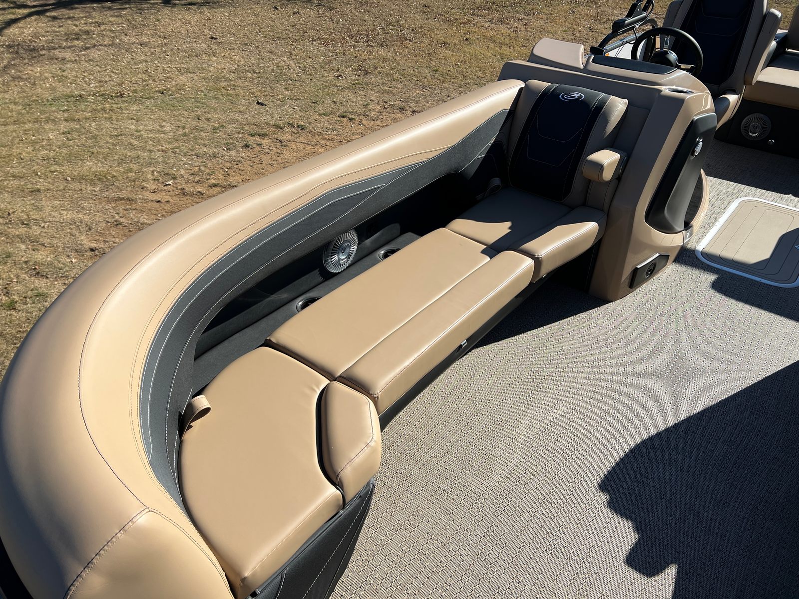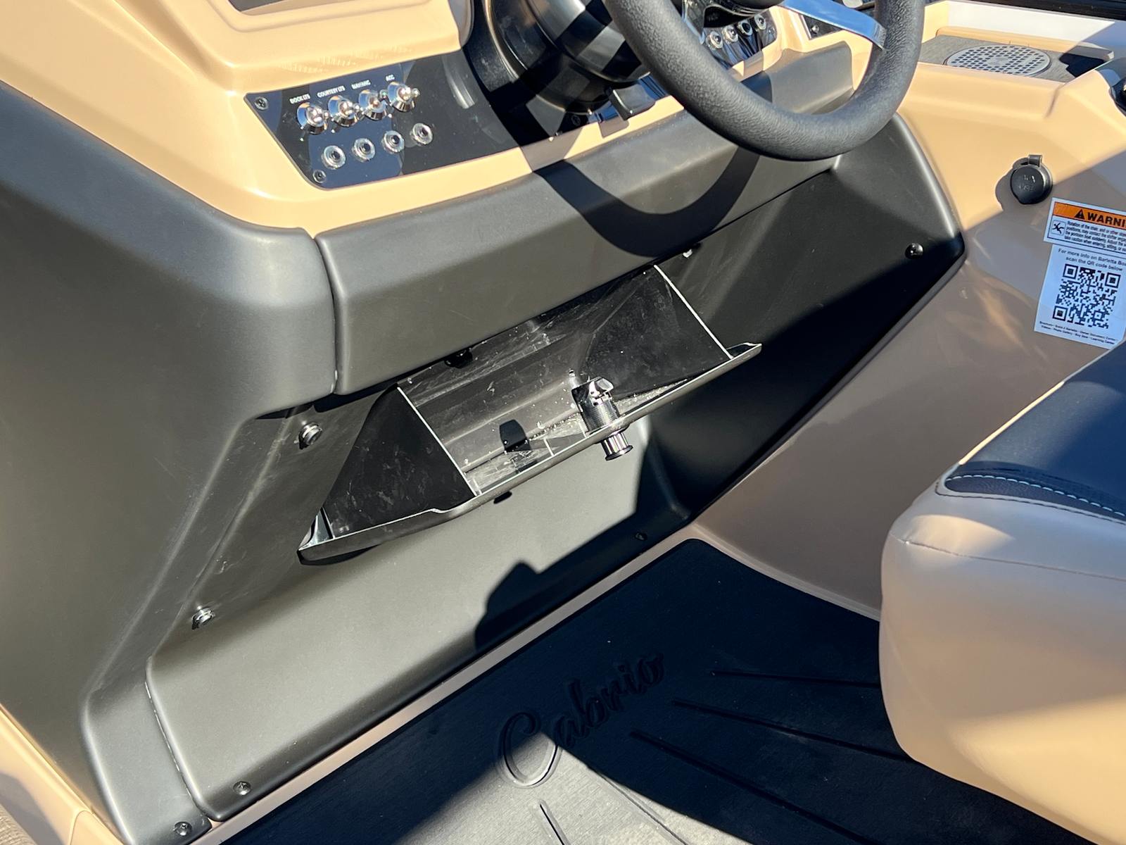 Step aboard the Barletta Cabrio C24U and you are greeted by a luxurious interior featuring Carmella Tan furniture with Onyx accents, creating an inviting and upscale atmosphere. The Amore Tan flooring not only adds to the visual appeal but also provides a comfortable and slip-resistant surface underfoot. The Blackout Package Cabrio, combined with the Black Diamond railskin and Winter White accent, gives this pontoon a distinctive and sophisticated look. The Triple Toon Package with midship storage offers ample space for stowing gear, water toys, and other essentials, keeping the deck uncluttered and organized. The boat is protected with Metal Jacket Protectant, ensuring its finish remains pristine and resistant to the elements.