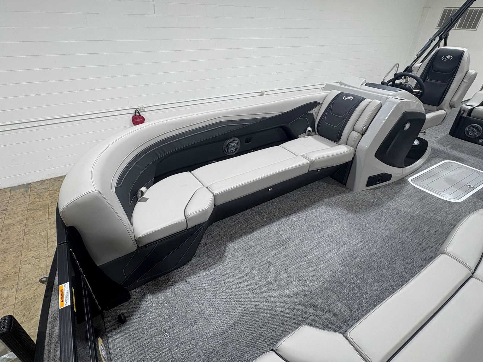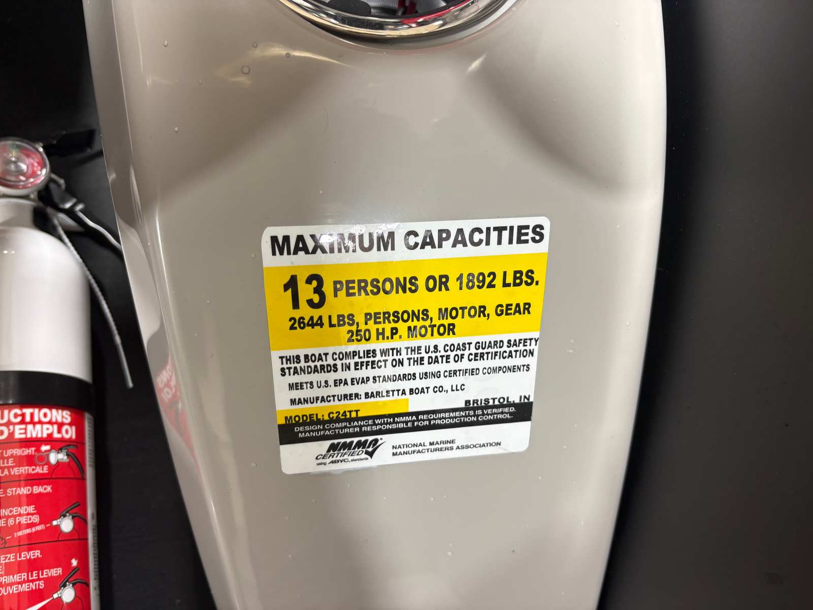The Barletta Cabrio C24UC is packed with special features that elevate your boating experience. The Matte Black Railskin and Blackout Package Cabrio give the boat a striking, contemporary look, while the Marquesan Gray with Onyx furniture offers plush seating and superior comfort. The Amore Gray flooring is both stylish and practical, providing a non-slip surface that’s easy to clean and maintain. The Triple Toon Package with midship storage adds extra buoyancy and space for gear, ensuring you’re always prepared for a day on the water.Rigging is expertly handled with the Mercury mechanical pre-rig and power assist, complemented by a stainless steel prop for optimal performance. The exterior features a stainless steel flag pole with an American flag, adding a patriotic touch to your outings. Inside, the RGB lighting package creates a customizable ambiance, perfect for evening cruises or festive gatherings.