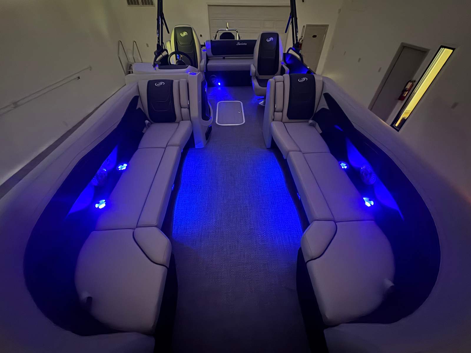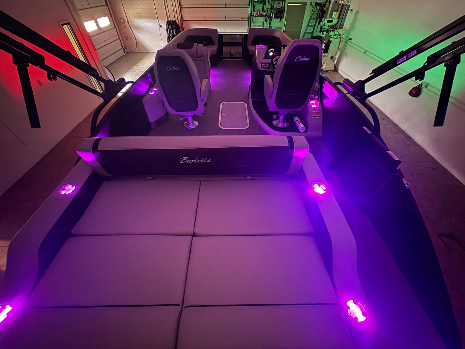 Owning the Barletta Cabrio C24UC pontoon boat means enjoying a host of benefits designed to enhance your time on the water. The spacious layout and comfortable seating make it easy to host family and friends, while the advanced engine and triple toon design ensure a smooth, stable ride in a variety of conditions. The stylish interior and exterior details provide a sense of luxury, while practical features like midship storage and easy-to-clean flooring make every outing more convenient.The interior RGB lighting package lets you set the mood for any occasion, whether you’re celebrating a special event or simply relaxing after sunset. The stainless steel flag pole with American flag adds a sense of pride and tradition to your boating adventures. With the Cabrio C24UC, you’ll enjoy the perfect blend of relaxation, excitement, and social connection every time you hit the water.