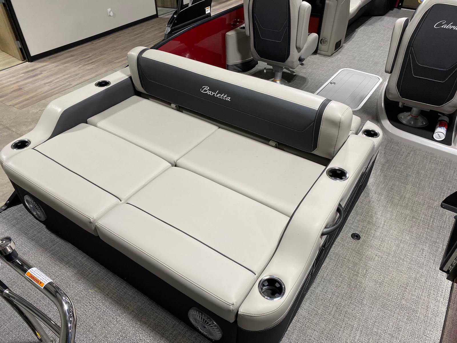 The 2026 Barletta Cabrio C24UC is packed with premium features that elevate your boating experience. The Blackout Package Cabrio adds a sophisticated, modern edge to the boat’s exterior, while the Marquesan Gray with Onyx furniture creates a luxurious and inviting atmosphere onboard. The Amore Gray flooring is not only stylish but also durable and easy to maintain, making it ideal for active days on the water.One of the standout features is the Triple Toon Package with midship storage, providing extra space for gear, water toys, and essentials, so you can keep the deck clutter-free and organized. The Sport Bimini, installed in place of the standard bimini, offers superior sun protection and a sporty look, ensuring comfort during long days under the sun. Every detail, from the railskin color accents to the thoughtfully designed seating, reflects Barletta’s commitment to quality and innovation.
