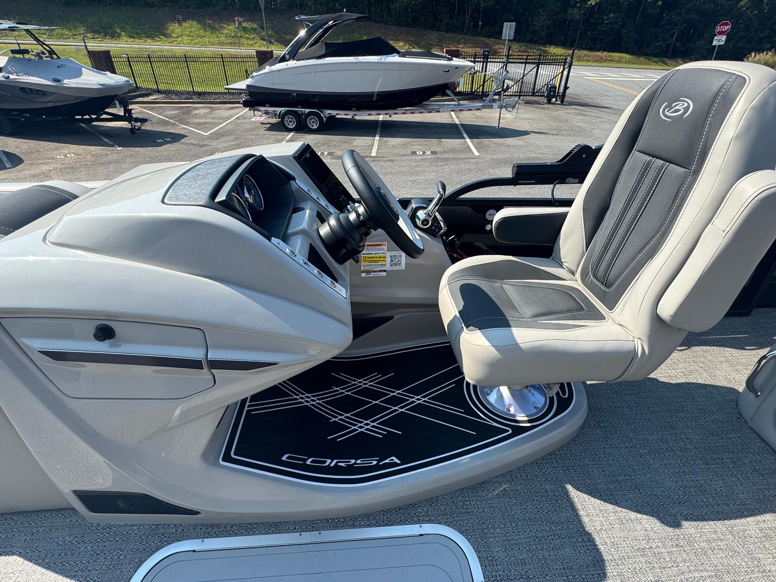 The Barletta Corsa 23U is packed with premium features that set it apart from other pontoon boats for sale. The Black Diamond Railskin and Blackout Package Corsa create a striking exterior, complemented by white underdeck and underwater lighting that enhances evening ambiance and visibility. The Amore Gray flooring provides a durable, stylish foundation, while the Soft Touch Marquesan Gray furniture with Carbon Accent ensures maximum comfort and elegance for all passengers.At the helm, the Corsa Simrad Engine Integration with Digital Motor offers advanced navigation and engine monitoring, keeping you informed and in control throughout your journey. Digital gauges provide accurate, easy-to-read data, and the stainless steel flag pole with an American flag adds a patriotic touch to your vessel. The rigging includes a stainless steel prop for enhanced performance and durability, ensuring that every outing is smooth and enjoyable.