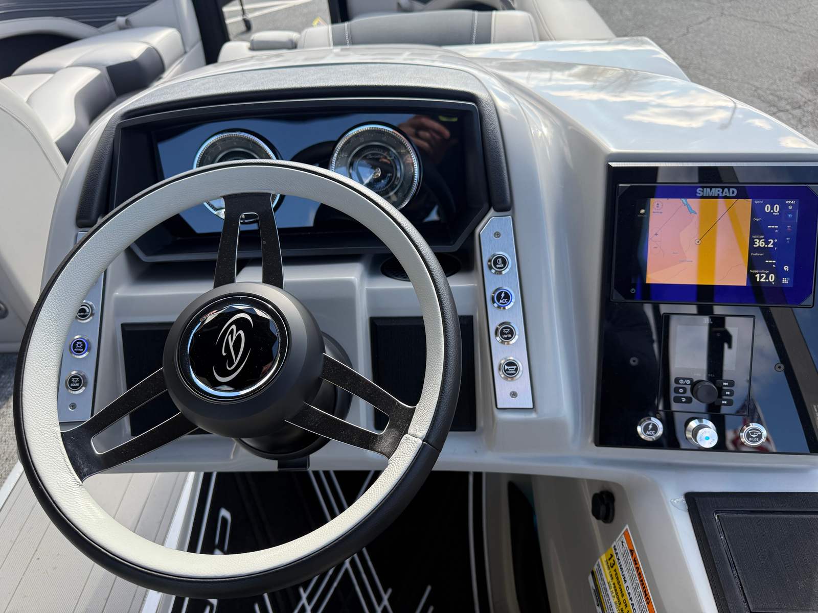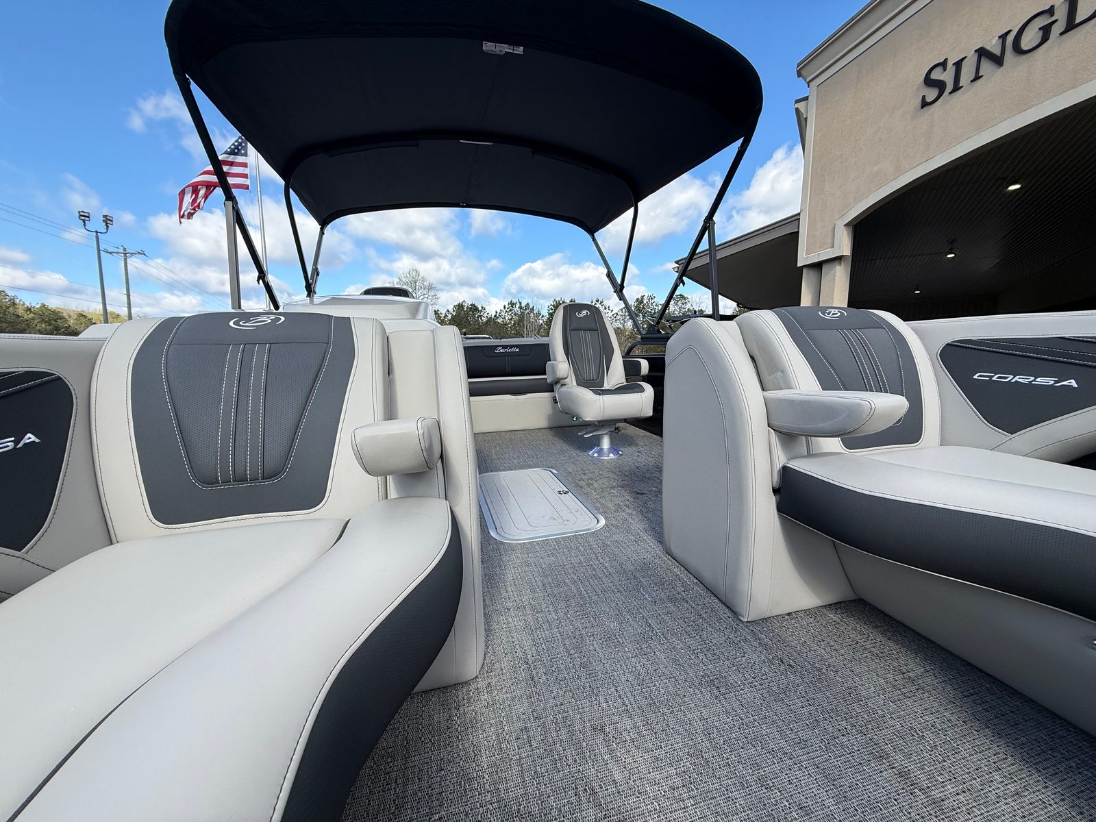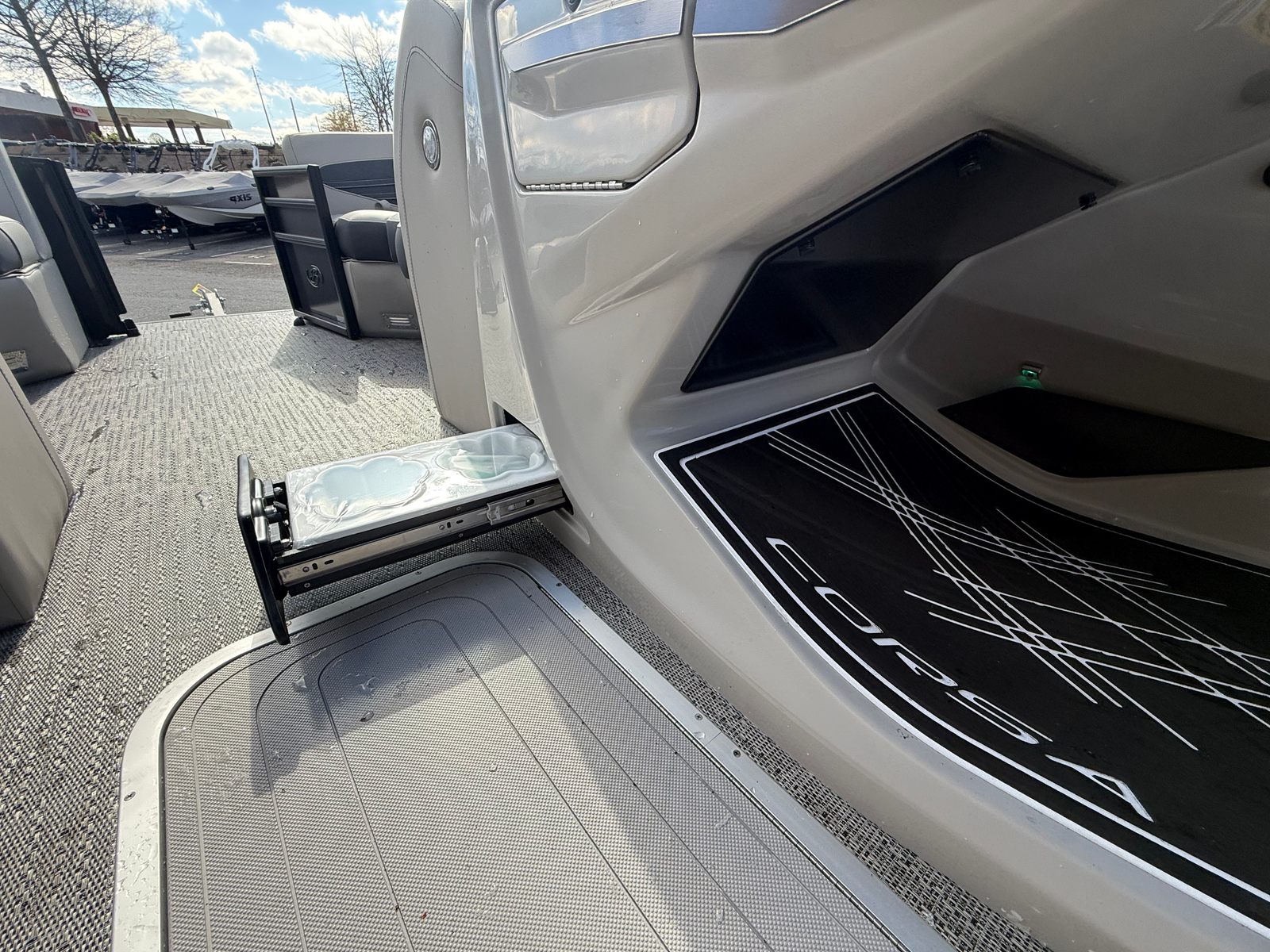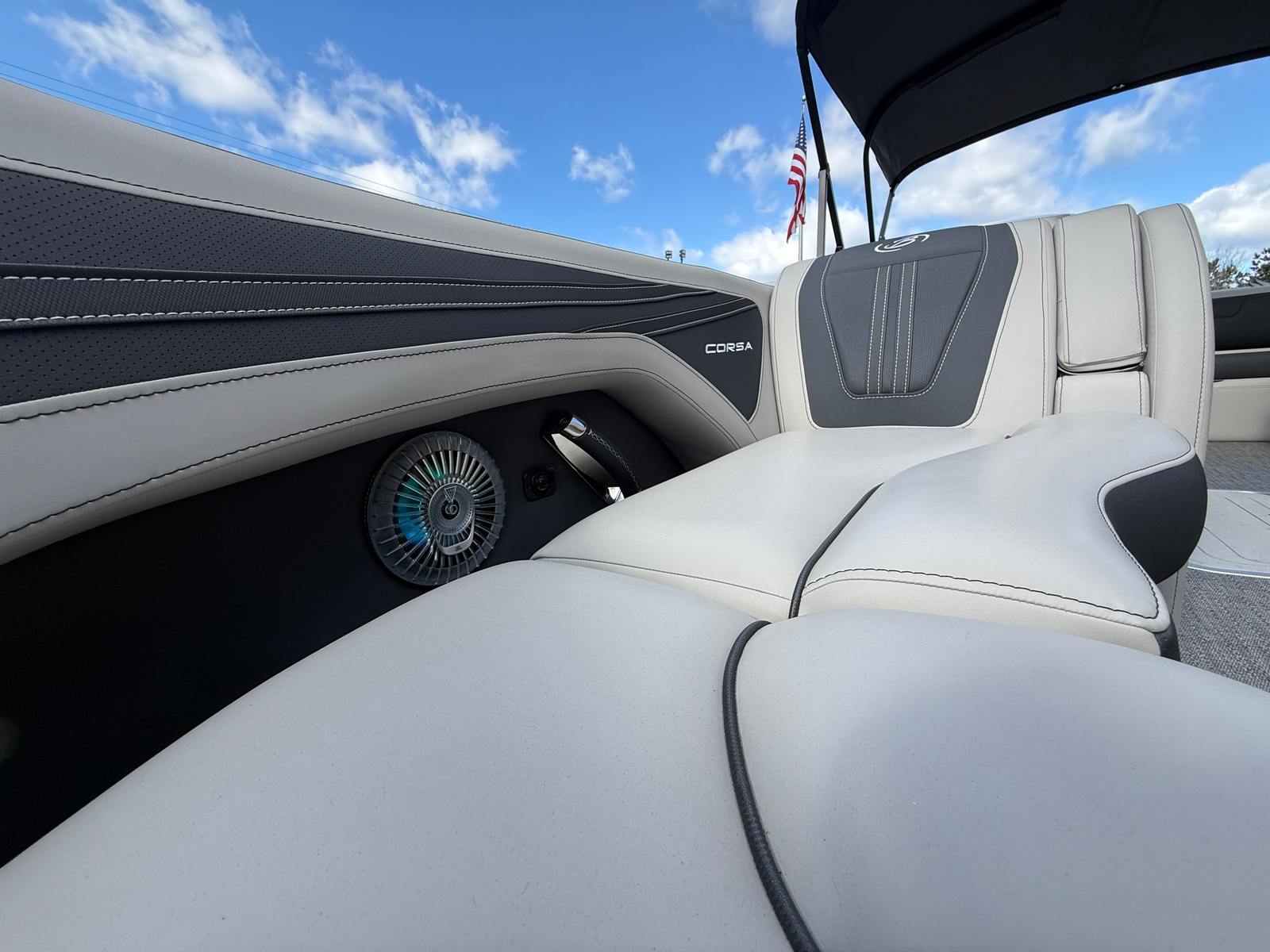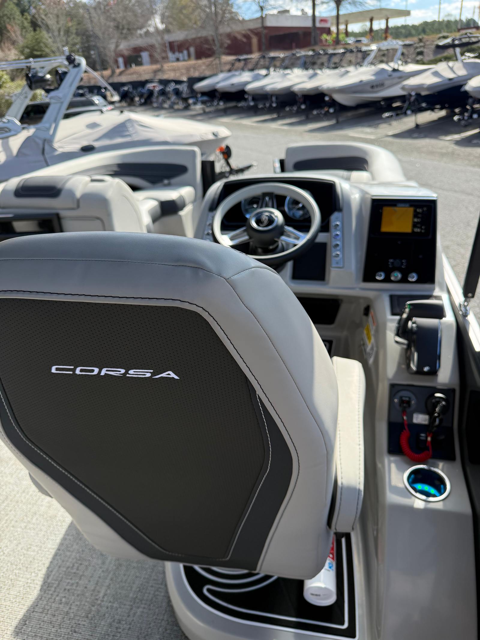 The Barletta Corsa 23UC is loaded with special features that elevate your time on the water. The Black Diamond railskin, complemented by a Matte Black accent and the Blackout Package Corsa, gives this pontoon a bold, modern look. Inside, the Soft Touch Marquesan Gray furniture with Carbon Accent offers plush seating and a sophisticated ambiance, while the Amore Gray flooring provides durability and style underfoot. The Mercury Digital DTS Pre-Rig ensures compatibility with VERADO engines, making engine management intuitive and efficient. Hydraulic and power assist steering, digital gauges, and rigging with a stainless steel prop further enhance performance and reliability. The exterior features a stainless steel flag pole with an American flag, adding a touch of patriotism and elegance. At the helm, the Corsa Simrad engine integration with digital motor control puts advanced navigation and monitoring tools at your command.