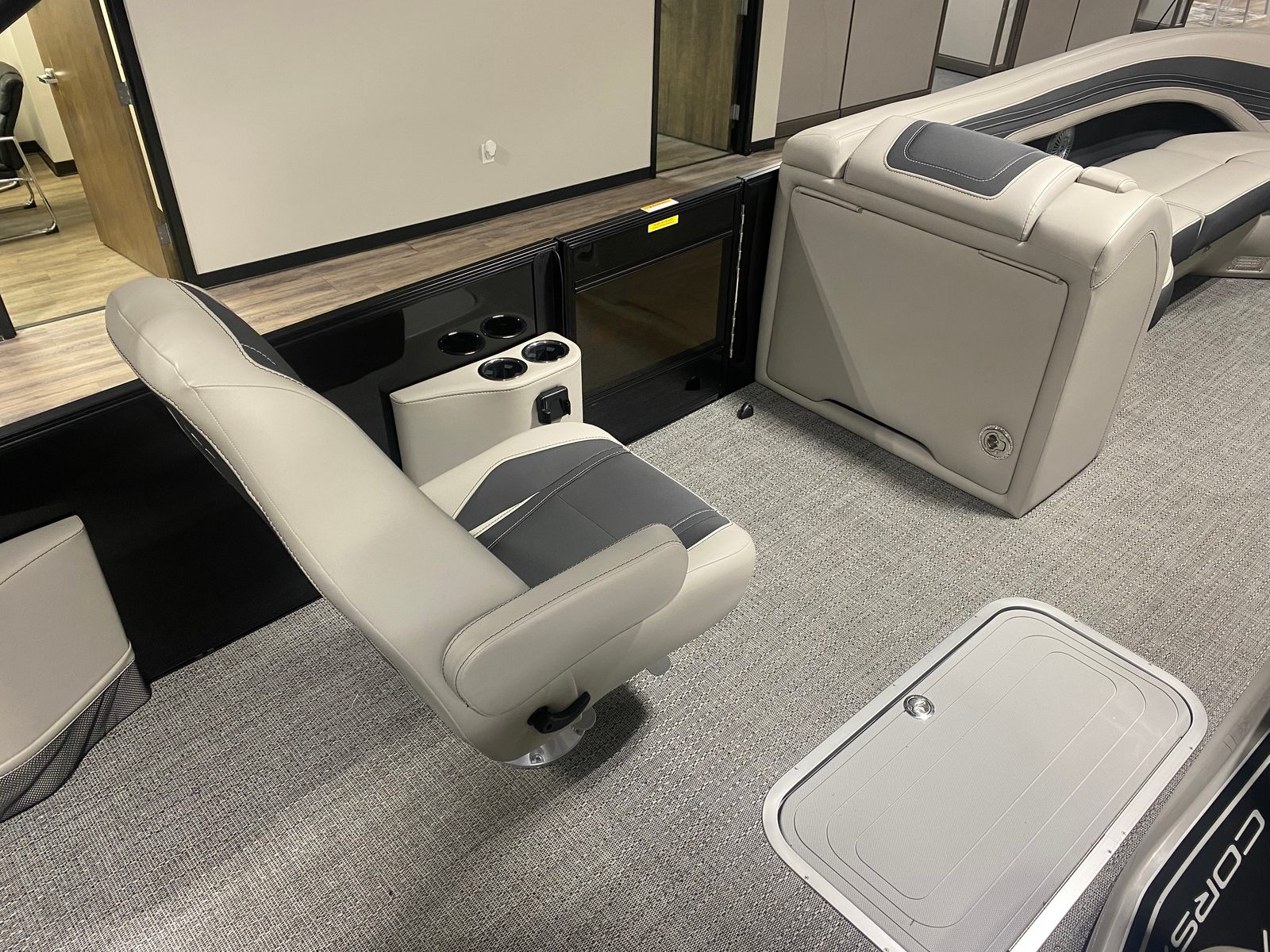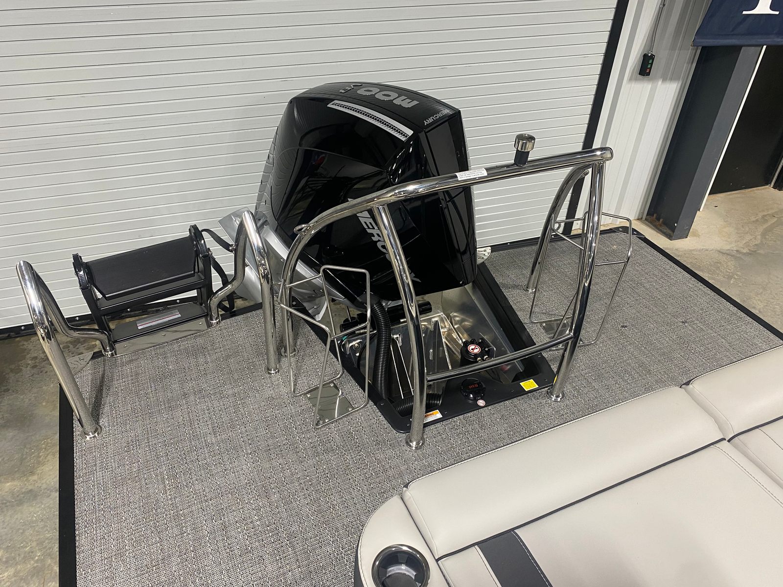 The Barletta Corsa 25UCA is loaded with premium features that elevate your boating experience. The Black Diamond Railskin and Blackout Package Corsa create a striking visual impression, while the stainless steel flag pole with American flag adds a touch of patriotic flair. The exterior lighting, including white underdeck and underwater lights, enhances nighttime ambiance and safety. Inside, the Soft Touch Marquesan Gray furniture with Carbon Accent offers plush comfort, complemented by the stylish Amore Gray flooring. The Mercury Digital DTS Pre-Rig and Vessel Link ensure precise engine control, and the drop ship engine rigging (no prop) allows for customization to suit your preferences. Hydraulic and power assist steering, digital gauges, and the Corsa Simrad engine integration at the helm provide a modern, intuitive boating experience.