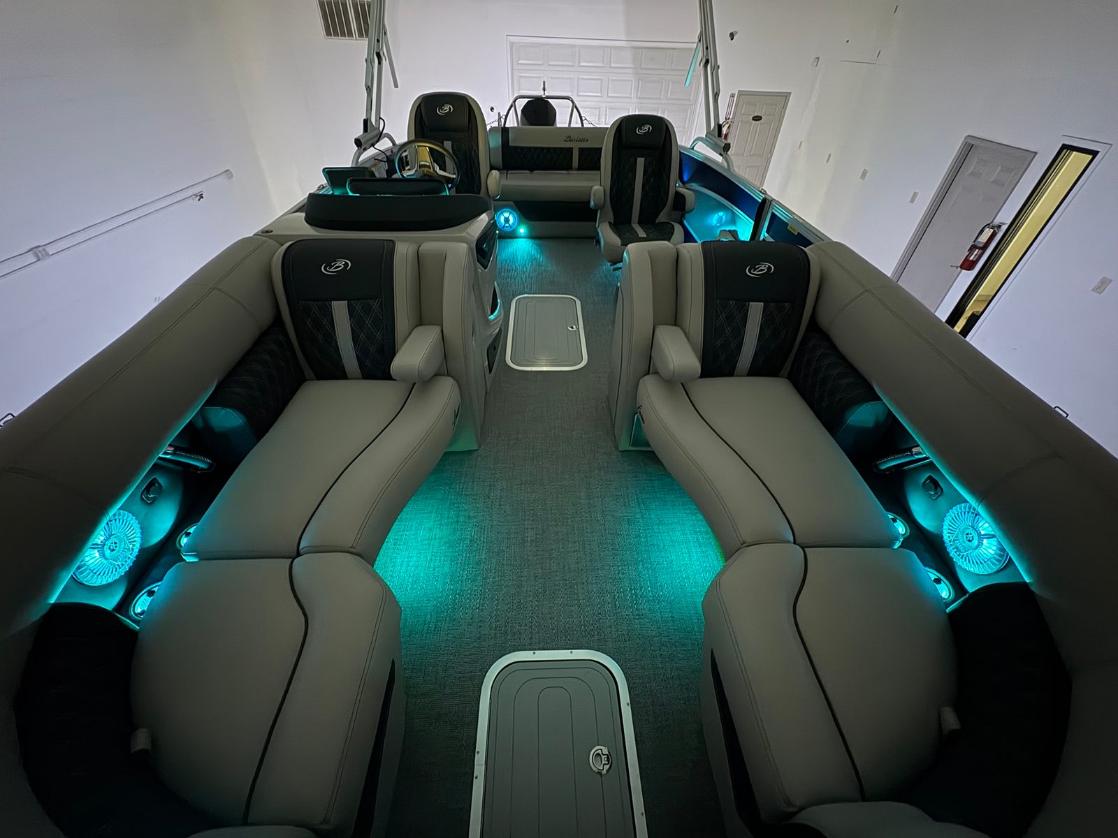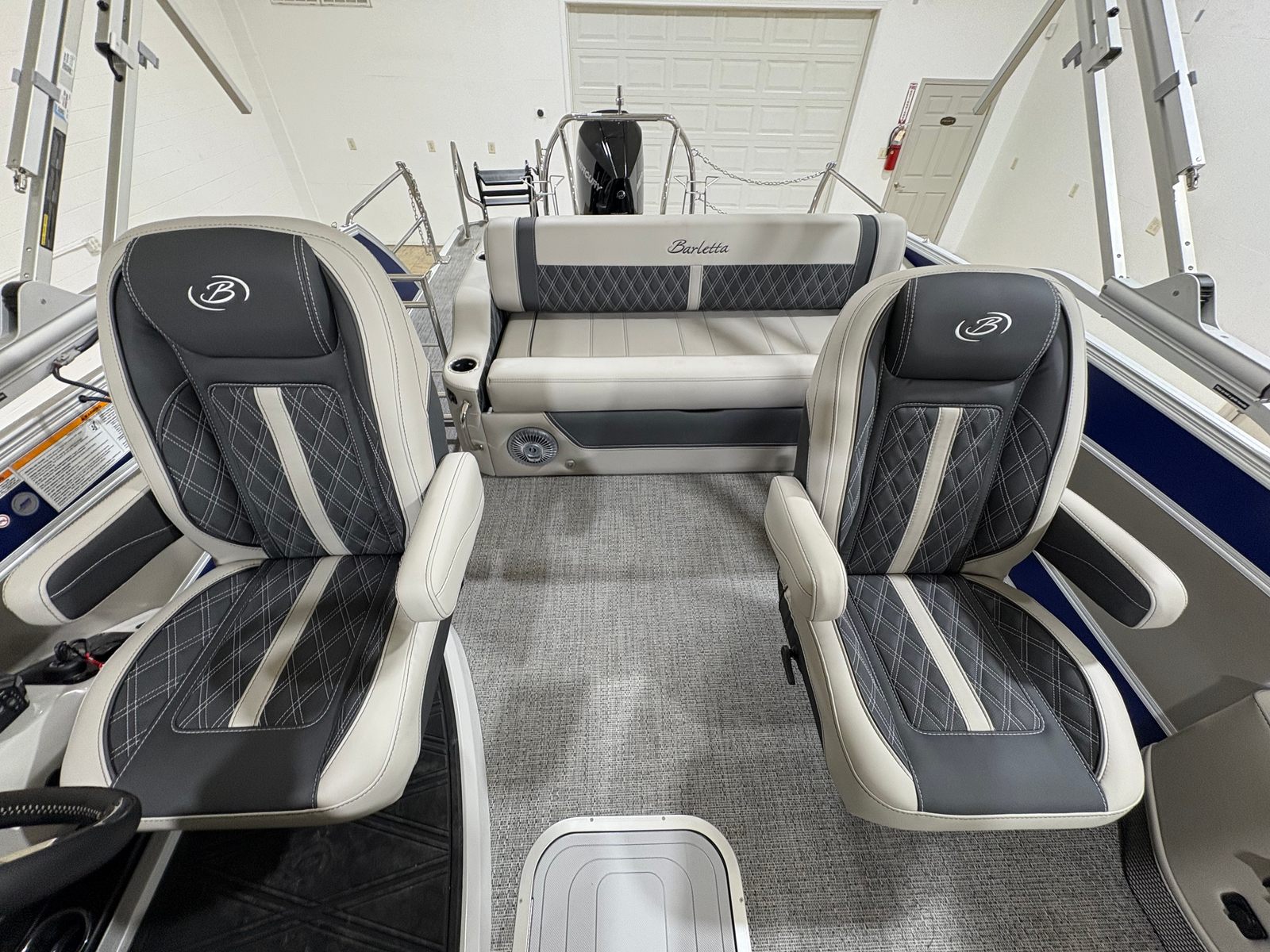 Practicality meets pleasure in the Barletta Lusso L23UC. The hydraulic and power assist steering simplifies docking and maneuvering, even for novice boaters. The digital gauges and Vessel Link system keep you informed and in control, while the on-board battery charger ensures your electronics are always ready for use. The sturdy stainless steel safety stanchions with chains provide peace of mind, especially when children or pets are on board.Storage solutions are integrated throughout the boat, making it easy to stow gear, snacks, and personal items without cluttering the deck. The durable flooring and high-quality furniture are designed to withstand the rigors of active use while maintaining their luxurious appearance. Fuel efficiency is enhanced by the advanced Mercury engine and stainless steel prop, allowing you to spend more time enjoying the water and less time refueling.