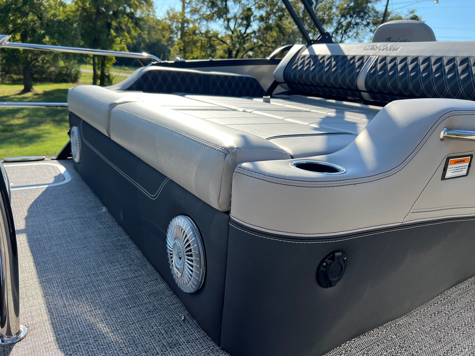 Powering the Lusso L23UC is a robust Mercury (D) 300L Verado V8 engine, delivering an impressive 300 horsepower. This single-engine setup is expertly rigged with a stainless steel prop, ensuring smooth acceleration and reliable performance. The Mercury Digital DTS Pre-Rig for VERADO engines with Vessel Link offers seamless digital control, while hydraulic and power assist steering make handling effortless, even in challenging conditions. Digital gauges provide precise, real-time feedback, allowing you to monitor your boat’s performance with confidence. Whether you’re cruising at a leisurely pace or opening up the throttle for some excitement, this Barletta pontoon boat offers a thrilling yet stable ride.