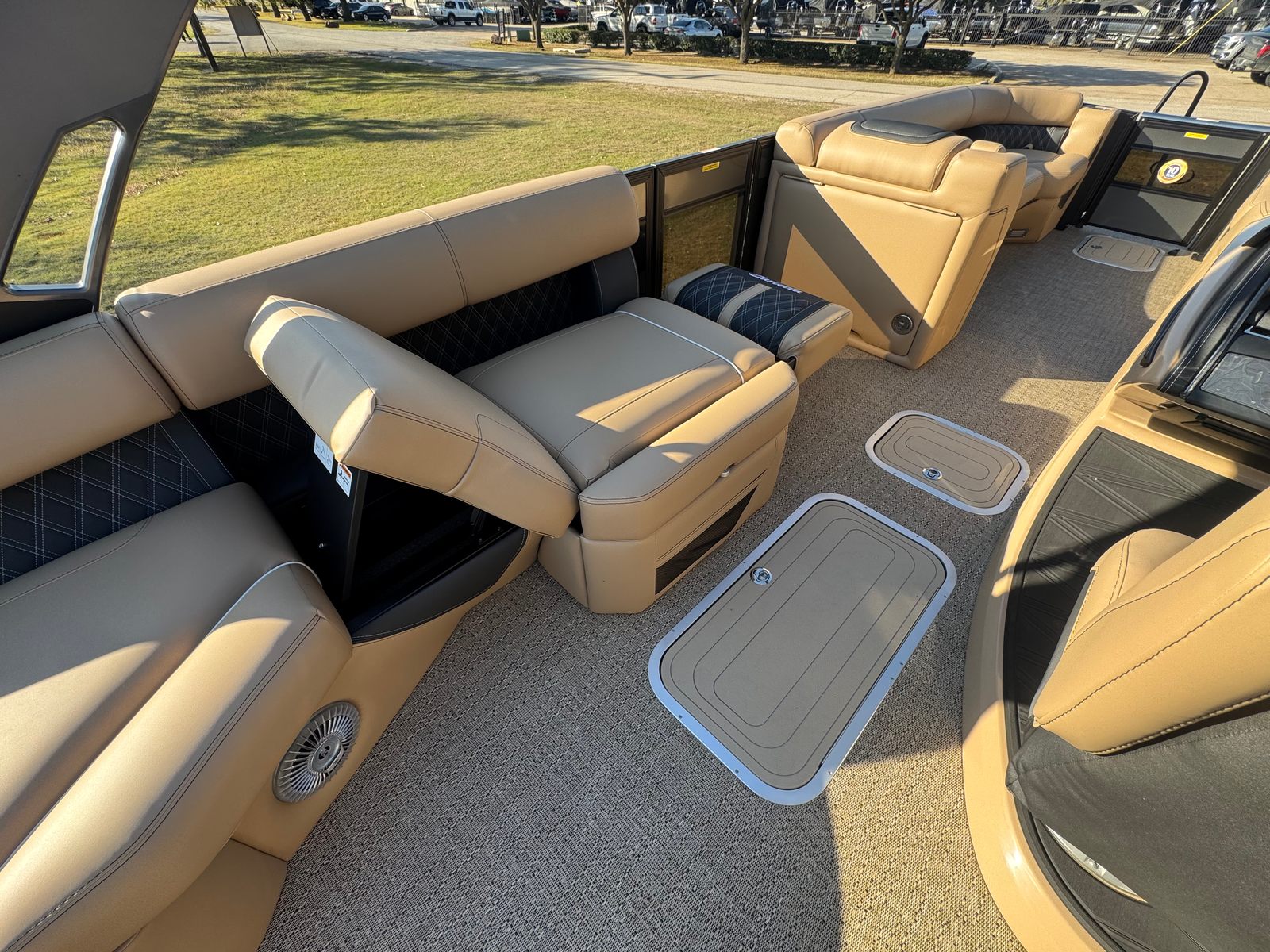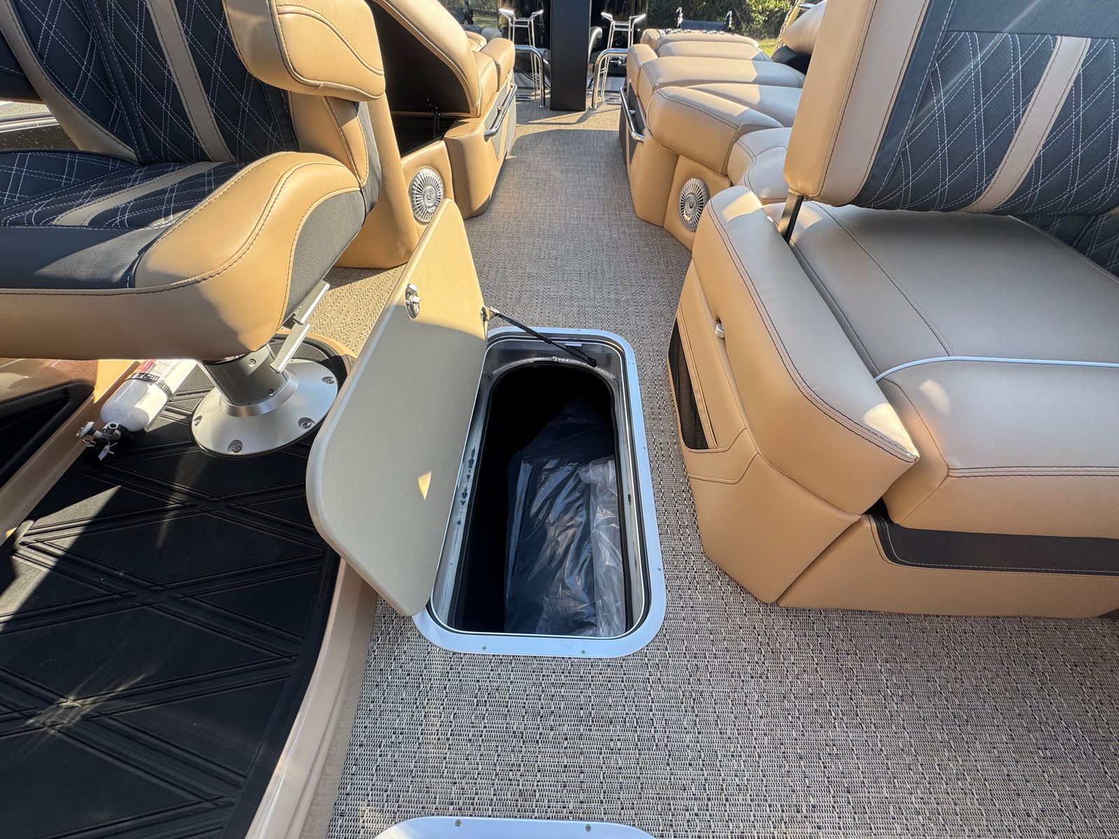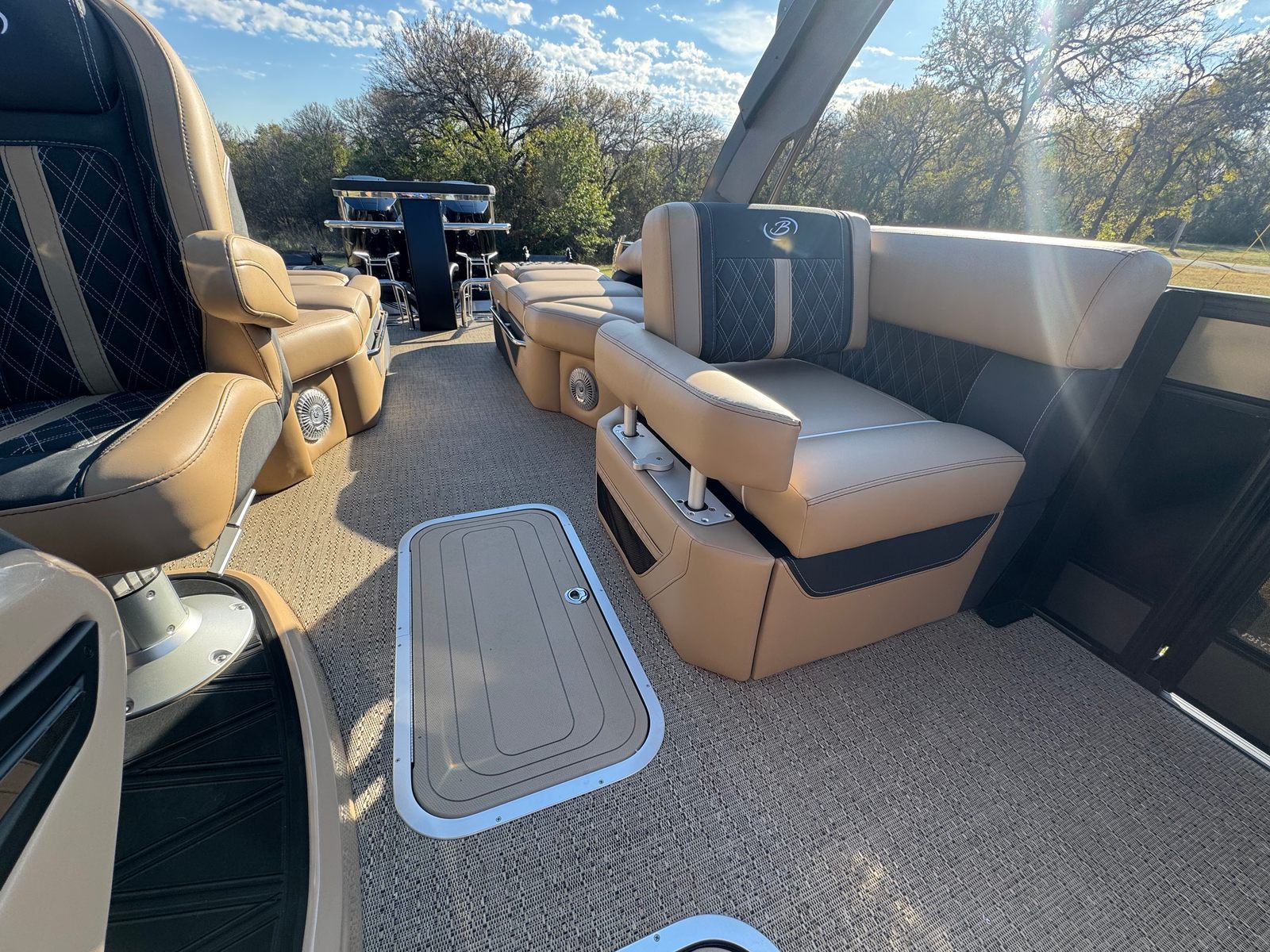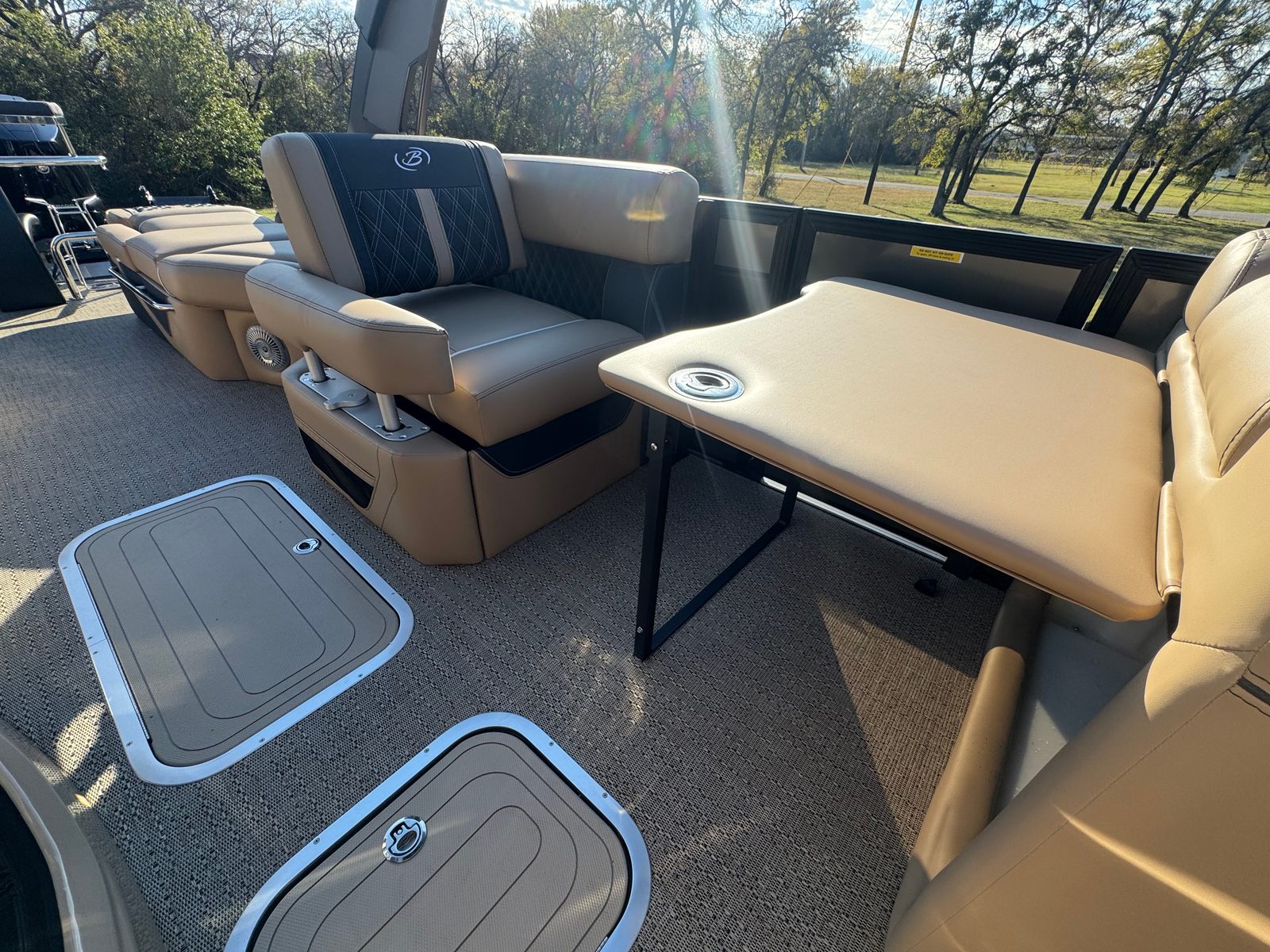 The Barletta Lusso L25MAT is designed to impress with its array of premium features and thoughtful details. The exterior showcases a sophisticated Sweep Color in Gray Moonstone, beautifully complemented by the Accent Color in Black Diamond. Step aboard and you are greeted by luxurious Carmella Tan with Onyx furniture, offering both comfort and elegance for you and your guests. The Amore Tan flooring adds a warm, inviting touch underfoot, creating a refined atmosphere throughout the deck.For those who appreciate ambiance, the Lusso L25MAT features white underdeck and underwater exterior lighting, enhancing the boat’s visual appeal during evening cruises and creating a magical setting for nighttime gatherings. Every element of this pontoon is crafted to elevate your on-water experience, from the plush seating to the stylish finishes.