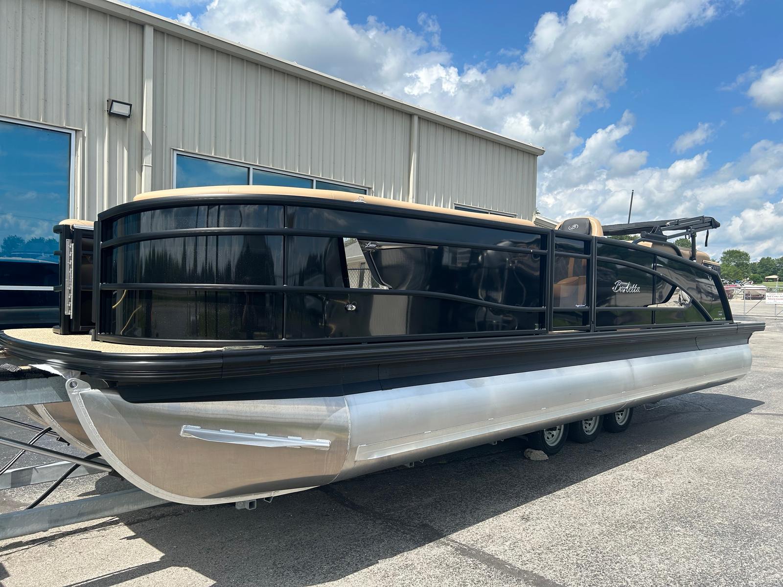 The Barletta Lusso L25QCSS is a brand-new pontoon boat, meticulously crafted for the 2026 season. Measuring an impressive 27.5 feet in length, this vessel offers ample space for entertaining, relaxing, and enjoying all that the water has to offer. The Lusso series is renowned for its attention to detail, and this model is no exception. With its sleek Black Diamond sweep color and accent, complemented by the Blackout Package Lusso railskin, the boat exudes modern elegance and sophistication. Whether docked at the marina or cruising across the lake, the Lusso L25QCSS commands attention with its striking presence and refined design.