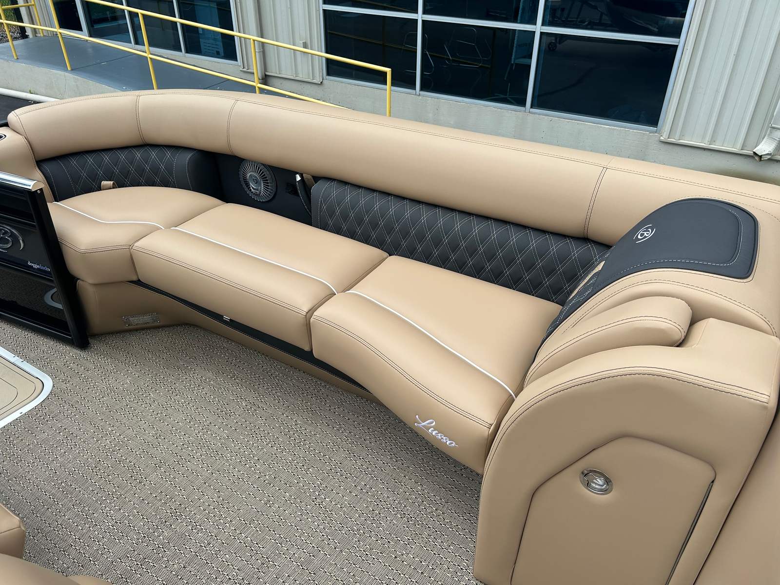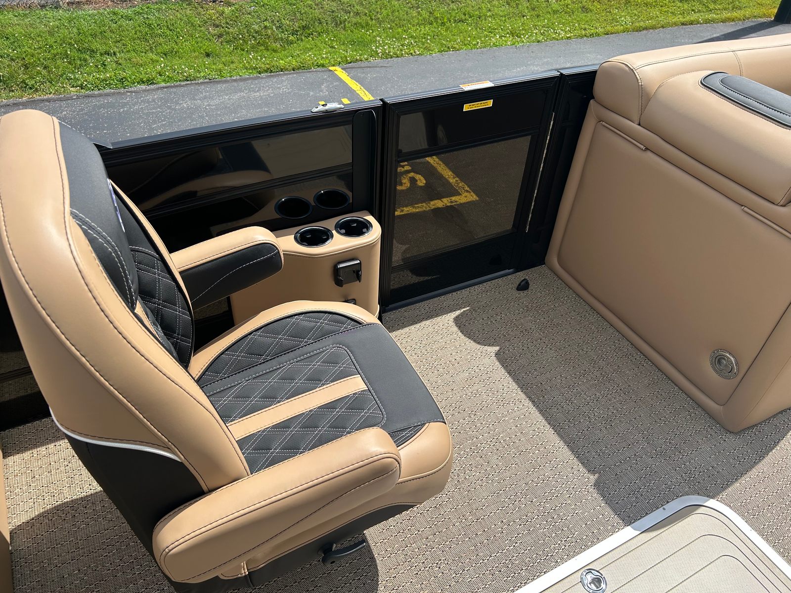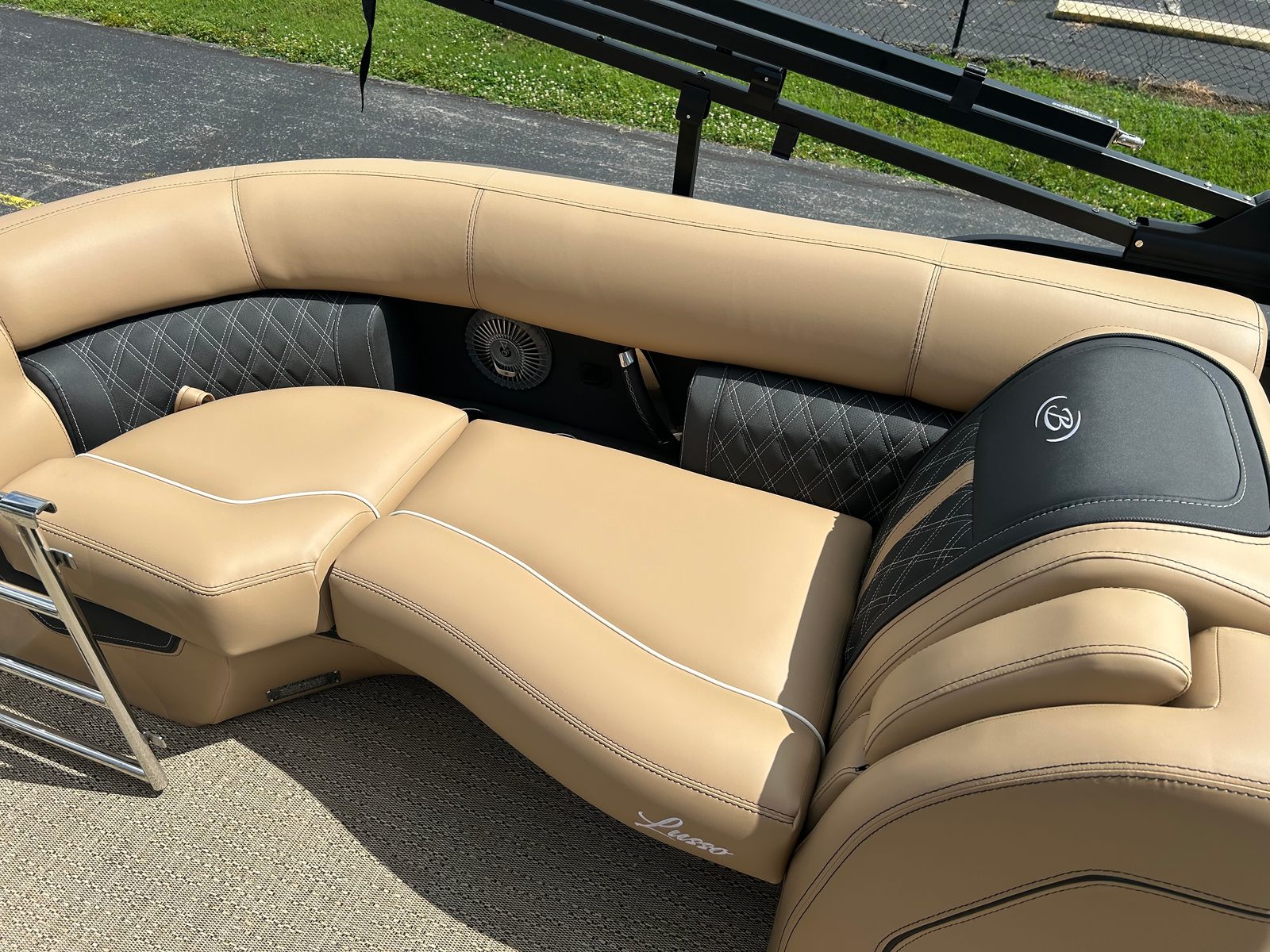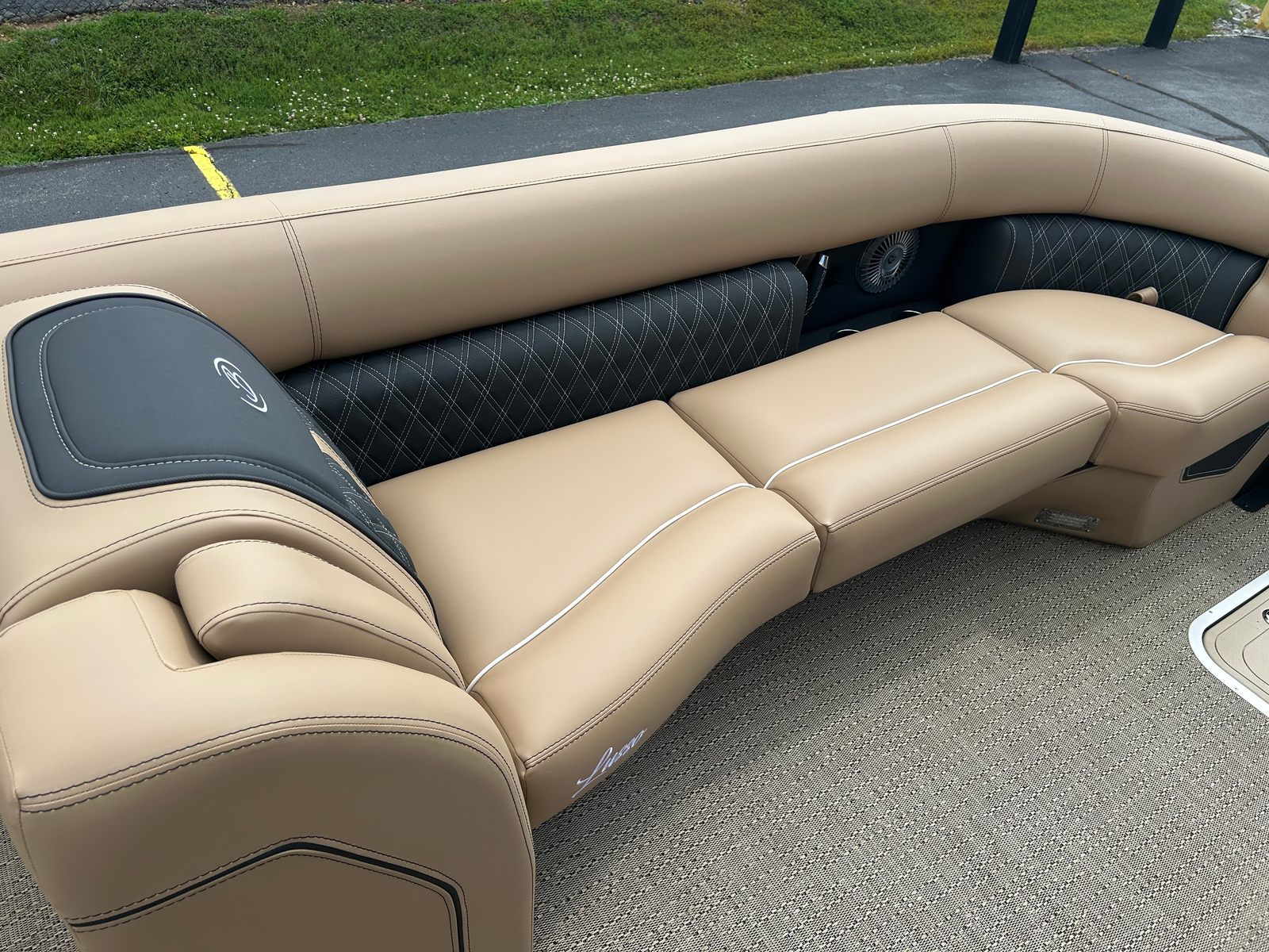 Step aboard the Barletta Lusso L25QCSS and discover a world of premium features designed to elevate your time on the water. The rig engine is equipped with a stainless steel prop, ensuring durability and optimal performance. Exterior lighting, including white underdeck and underwater illumination, creates a captivating ambiance for evening outings and enhances visibility for added safety. The flooring features Amore Tan, providing a comfortable and stylish foundation that complements the boat’s overall aesthetic.The railskin packages include the Blackout Package Lusso, adding a touch of sophistication and modern flair. The furniture is upholstered in Carmella Tan with Onyx accents, offering plush seating and a luxurious feel throughout the deck. Digital gauges provide clear, easy-to-read information at a glance, while the accent color in Black Diamond ties together the boat’s contemporary look. Every detail of the Lusso L25QCSS has been thoughtfully designed to deliver an exceptional boating experience.