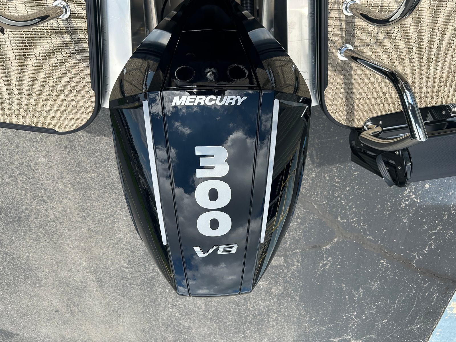 Powering this pontoon is a single Mercury (D) 300L Verado V8 engine, delivering an impressive 300 horsepower. This robust engine ensures smooth acceleration, responsive handling, and reliable performance, whether you’re gliding across calm waters or navigating through lively waves. The Mercury Digital DTS Pre-Rig for VERADO engines with Vessel Link enhances the driving experience, providing precise digital throttle and shift control for effortless maneuvering. Hydraulic and power assist steering further contribute to the boat’s agility, making it easy to handle even in challenging conditions. The Lusso L25QCSS is engineered for both leisurely cruises and exhilarating adventures, offering the perfect balance of power and efficiency.