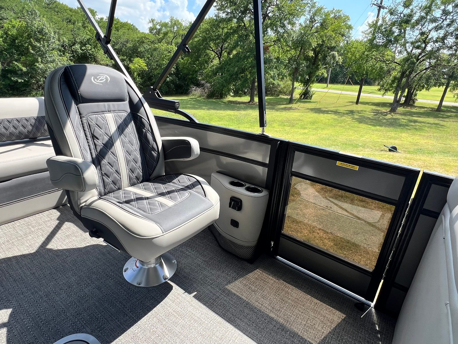 The 2025 Barletta Lusso L25UC is loaded with special features that enhance both comfort and convenience. Step inside and you will find a beautifully appointed interior, featuring a table with a pedestal and base, complete with Yeti-ready cupholders—perfect for keeping your favorite beverages secure while you relax or entertain. The furniture is finished in a sophisticated Marquesan Gray with Charcoal Accent, complemented by Amore Gray flooring that is both stylish and easy to maintain.For those who appreciate versatility and shade, the Lusso L25UC comes equipped with a double bimini, including an additional power bimini for effortless adjustment. The Blackout Package Lusso adds a bold, modern touch to the railskin, while the Metal Jacket Protectant on the exterior ensures your pontoon boat stays looking pristine season after season. The captain’s chair features an adjustable pedestal, providing customized comfort for long days on the water.