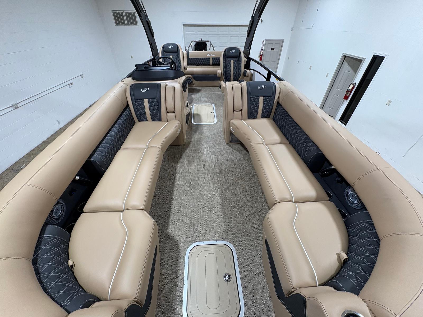 The 2026 Barletta Lusso L25UCA is a brand-new pontoon boat measuring an impressive 27.5 feet in length. Its sleek and modern profile is accentuated by the Winter White sweep and accent colors, creating a timeless and sophisticated look that will turn heads at any marina or lake. The Blackout Package Lusso railskin adds a bold touch, while the Carmella Tan with Onyx furniture and Amore Tan flooring provide a warm, inviting atmosphere for every passenger. As a new Barletta boat for sale, this Lusso L25UCA is designed to deliver both style and substance, making it an ideal choice for those who demand the best in recreational boating.
