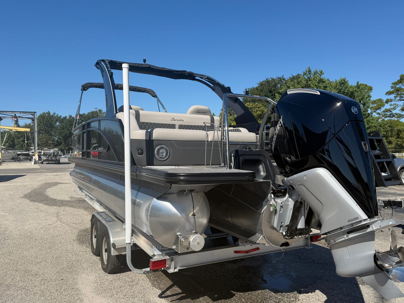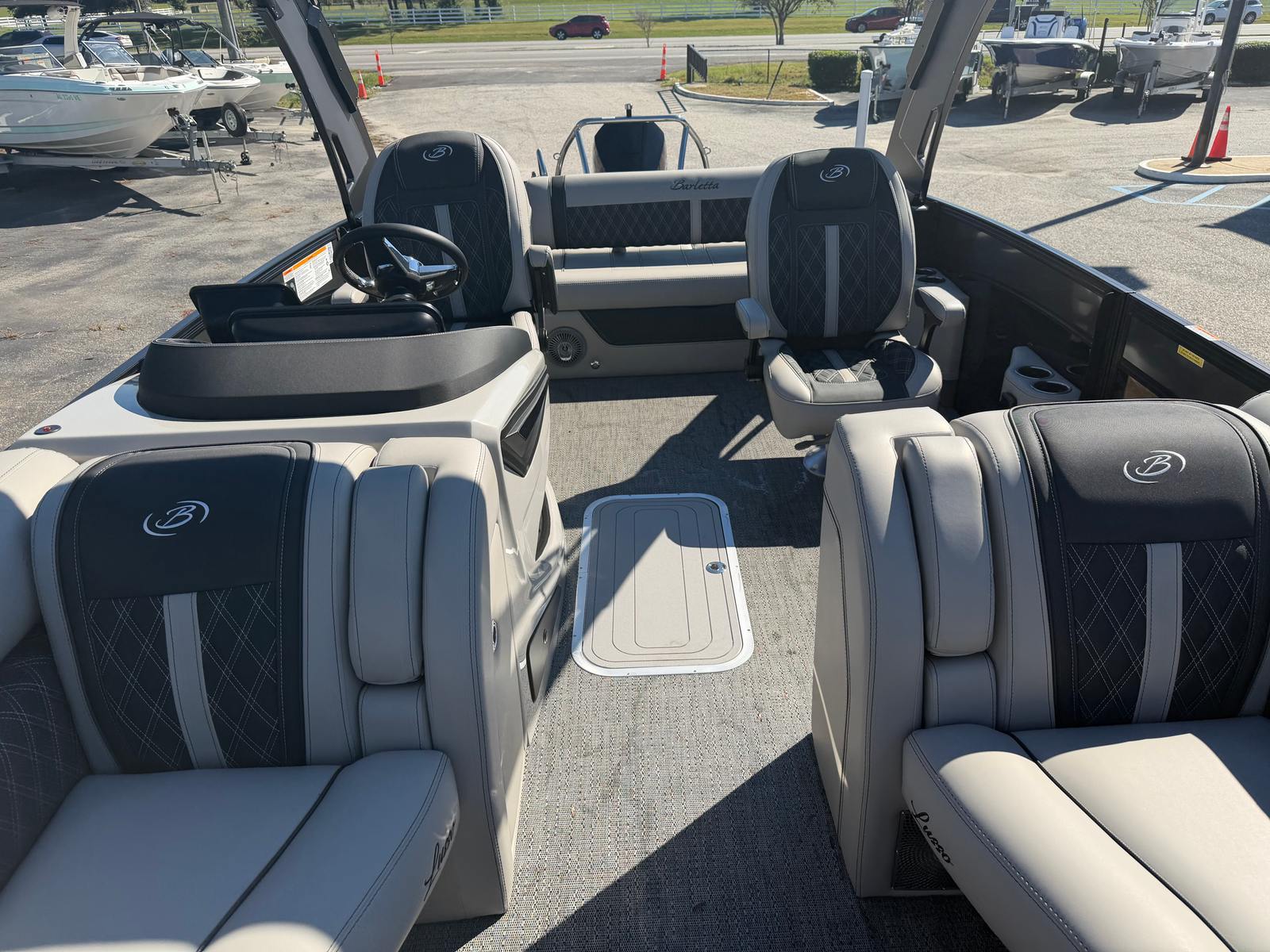 This Barletta boat for sale is packed with premium features designed to enhance your boating experience. The Double Bimini Arch Models offer versatile shade options, allowing you to enjoy the sun or relax in the cool comfort of the shade. The Coastal Edition Lusso brings added durability and style, perfect for both freshwater and coastal adventures. The Blackout Package Lusso, combined with the sleek railskin packages, gives the boat a bold, contemporary look that’s sure to impress. Inside, the Marquesan Gray with Onyx furniture provides plush seating and ample space for socializing, while the Amore Gray flooring is both stylish and easy to maintain. Digital gauges offer real-time information at your fingertips, and the Mercury Digital DTS Pre-Rig ensures your engine is ready for peak performance.