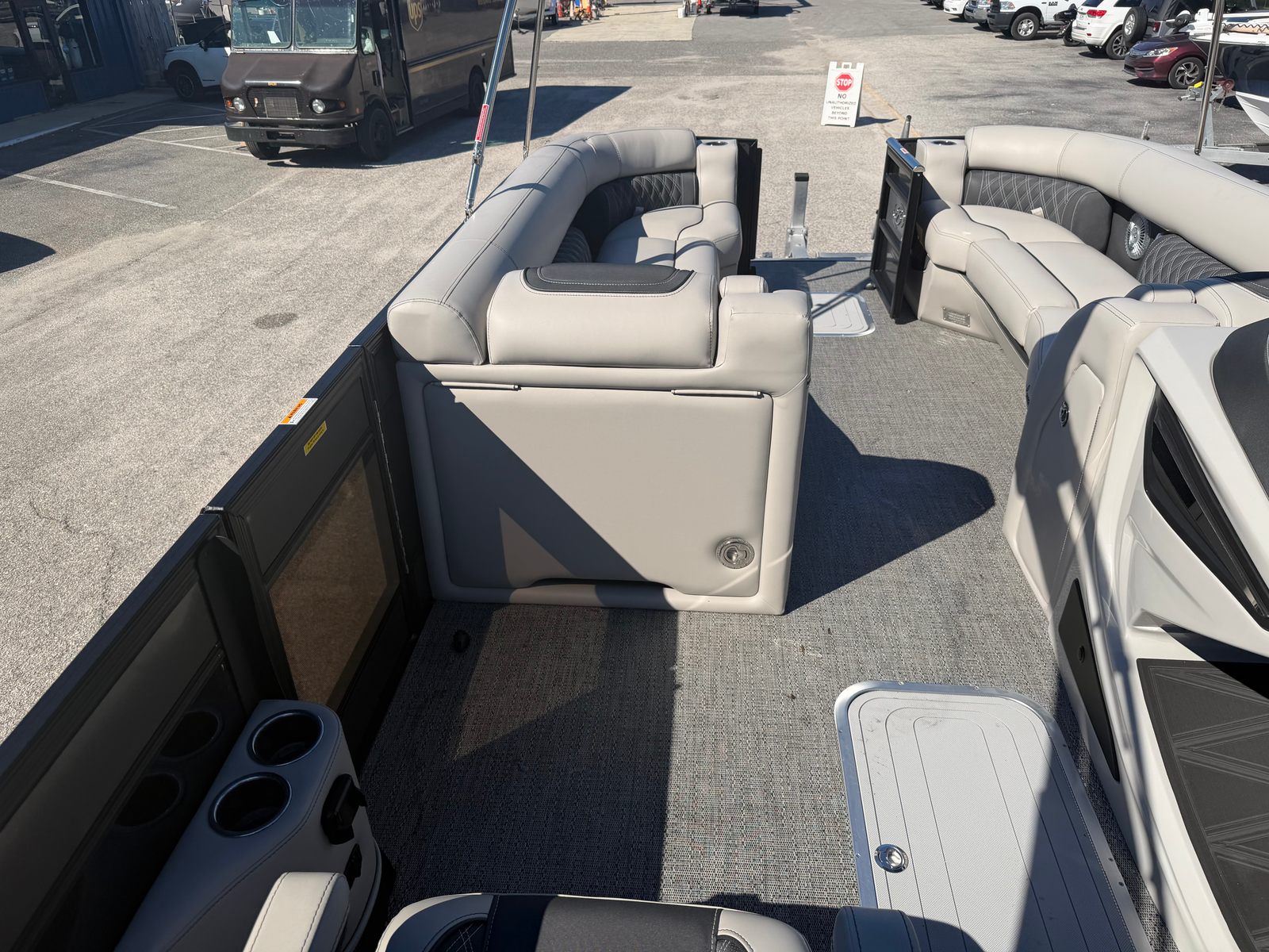 Step aboard the 2026 Barletta Lusso L25UCA and experience the next level of pontoon boating. Measuring an impressive 27.5 feet in length, this pontoon offers ample space for guests, gear, and activities. The Lusso series is renowned for its attention to detail, and the L25UCA model is no exception. Its contemporary styling, highlighted by the Gray Moonstone sweep color and Black Diamond accent, ensures you’ll turn heads at every marina and on every lake. The Blackout Package Lusso adds a touch of elegance and modern flair, while the Marquesan Gray with Onyx furniture and Amore Gray flooring create a comfortable and inviting atmosphere for all aboard.