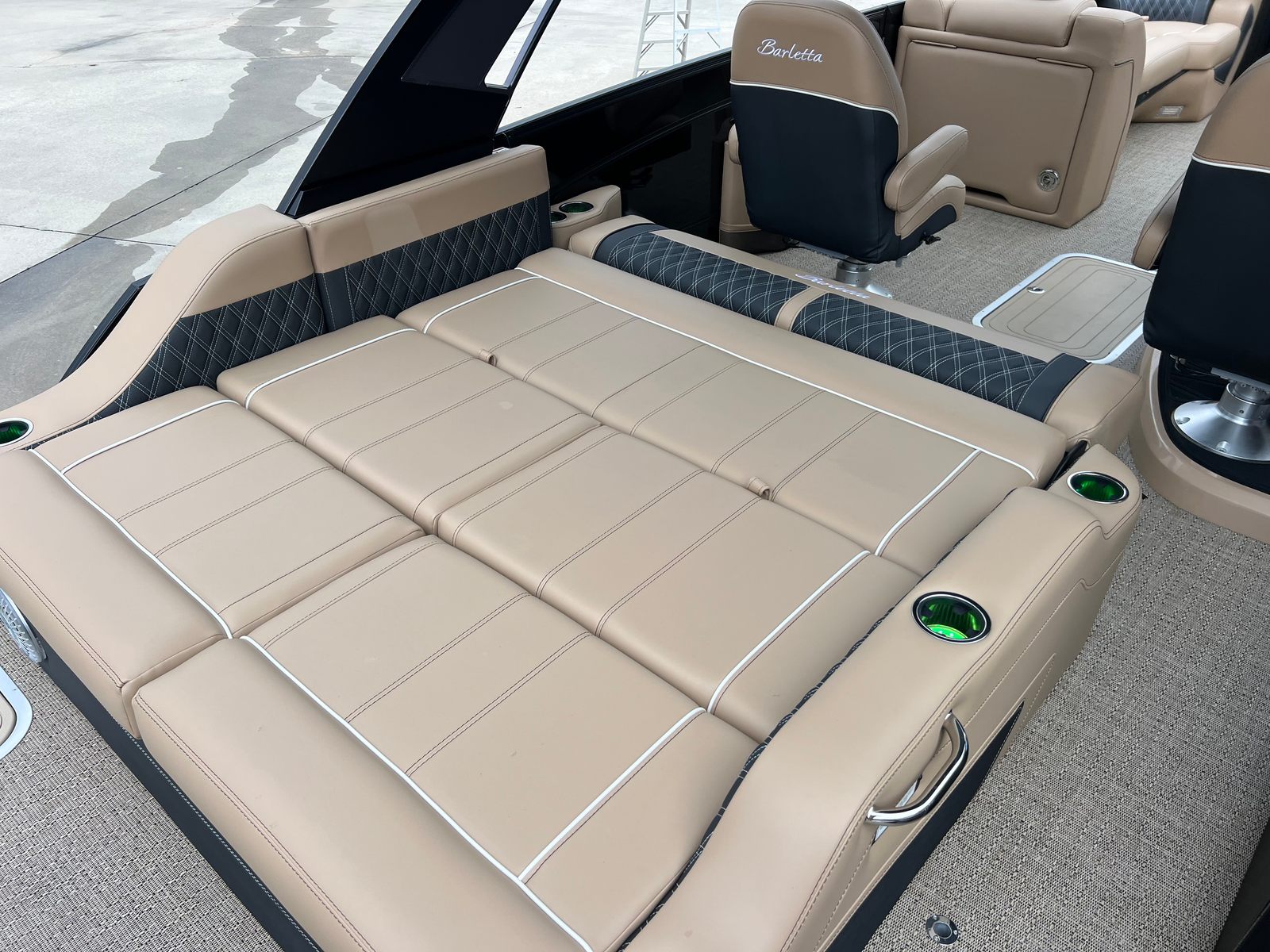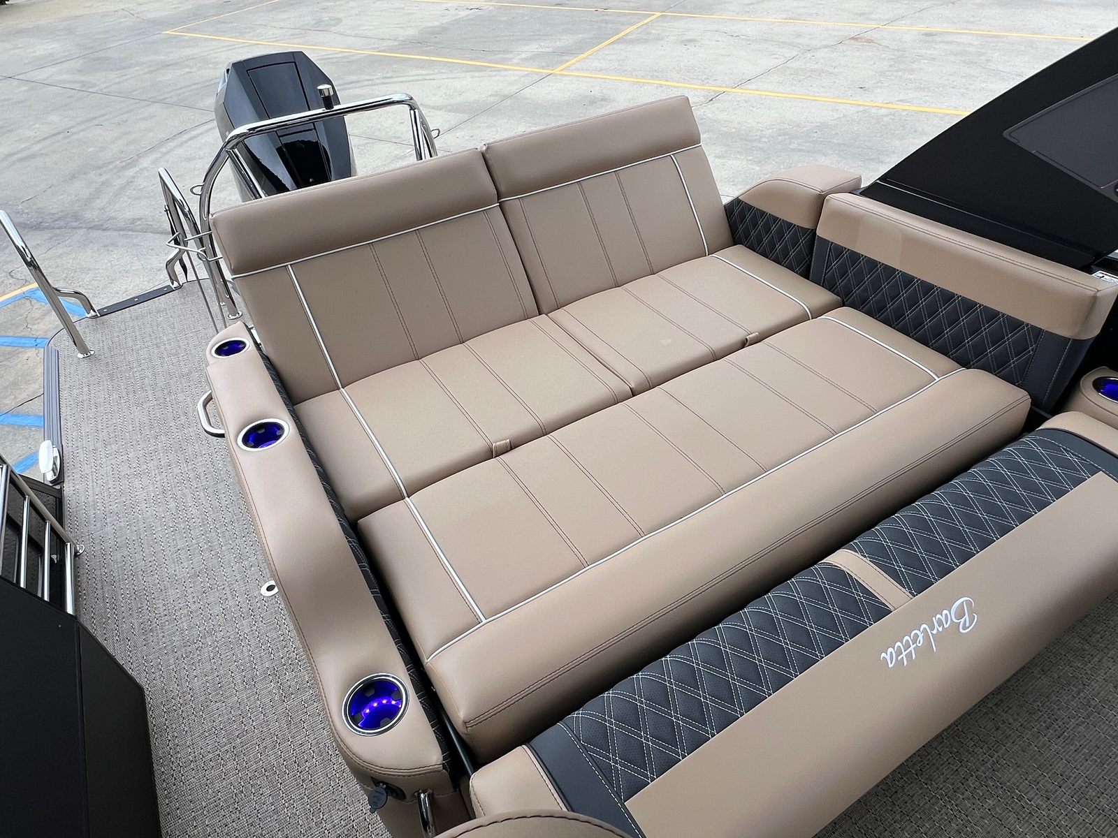 The 2026 Barletta Lusso L25UCA is packed with special features that enhance both comfort and convenience. The Blackout Package Lusso railskin adds a modern, sophisticated edge to the boat’s exterior, while the Black Diamond sweep and accent colors create a striking visual statement. Inside, the Carmella Tan with Onyx furniture offers plush seating and a refined look, perfectly complemented by the Amore Tan flooring for a cohesive and stylish interior.This pontoon boat is also equipped with an on-board battery charger for two batteries, ensuring you have reliable power for all your electronics and accessories. The Metal Jacket Protectant provides an extra layer of durability, helping to keep your boat looking pristine season after season. Every detail of the Lusso L25UCA is designed to provide a premium boating experience, making it a standout choice for those seeking a Barletta boat for sale.