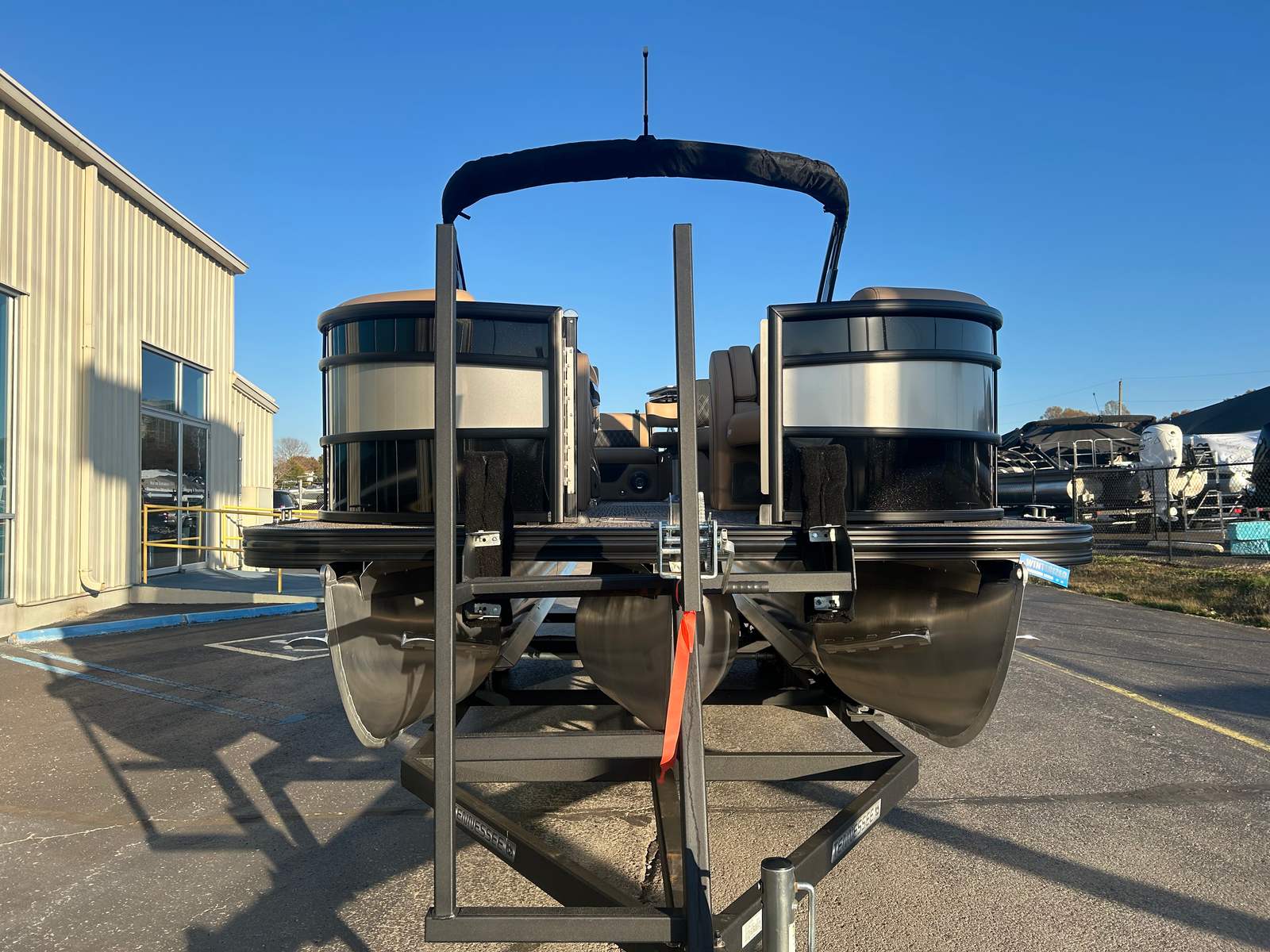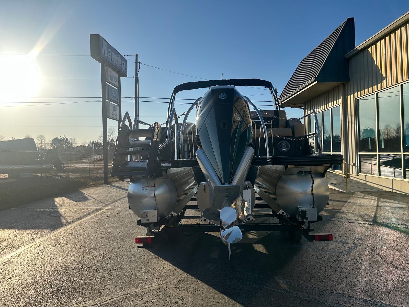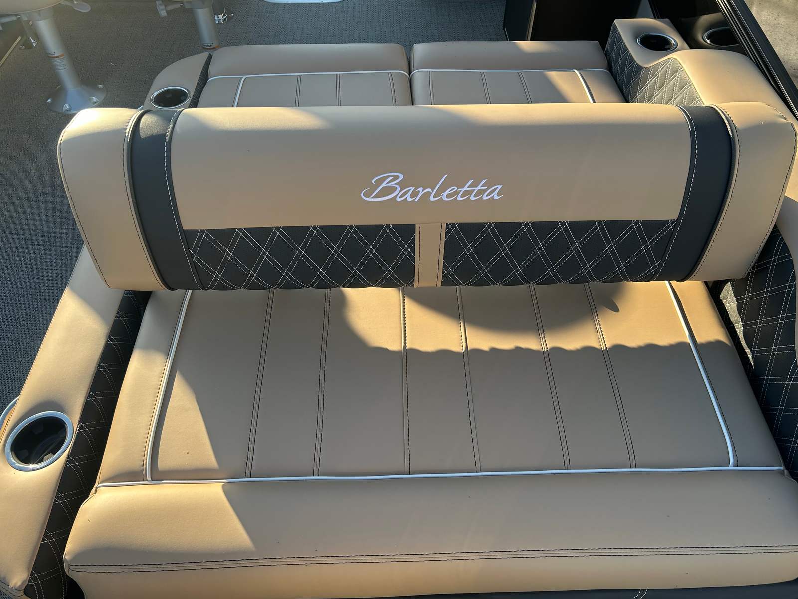 The 2026 Barletta Lusso L25UE is loaded with features that enhance both comfort and convenience. The Blackout Package Lusso railskin adds a bold, modern touch to the exterior, while the Carmella Tan with Onyx furniture offers plush seating for all your guests. The Amore Tan flooring is not only stylish but also easy to maintain, making it ideal for active days on the water. The Sport Bimini, installed in place of the standard bimini, provides ample shade and protection from the sun, ensuring comfort during long afternoons afloat. An onboard battery charger with two batteries ensures you have reliable power for all your electronic needs, keeping your adventures uninterrupted.
