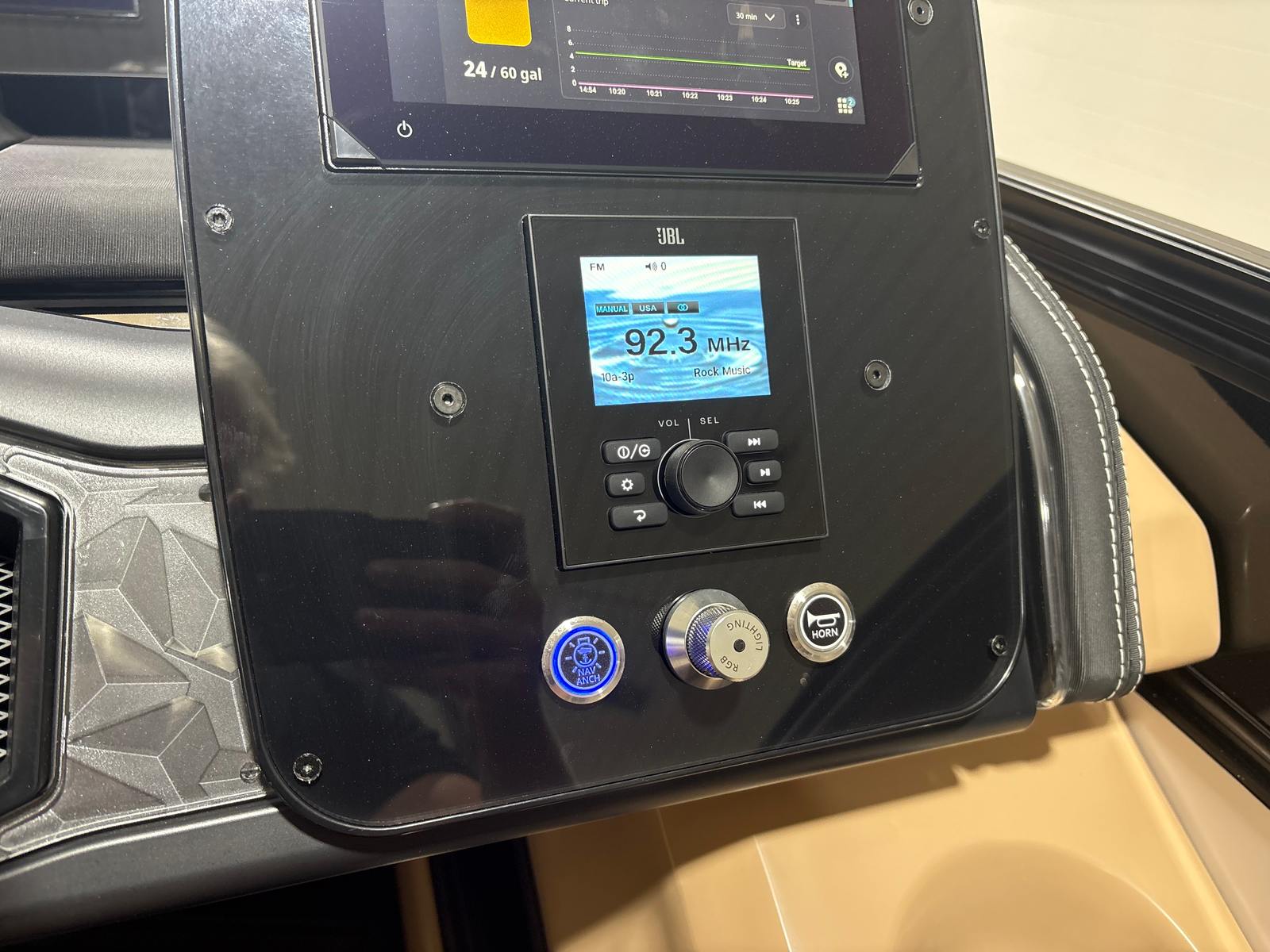 The 2026 Barletta Lusso L25UE is loaded with premium features designed to enhance your time on the water. The Blackout Package Lusso railskin adds a bold, modern touch to the exterior, while the Metal Jacket Protectant ensures long-lasting durability and protection against the elements. The Carmella Tan with Onyx furniture offers plush, ergonomic seating for you and your guests, and the Amore Tan flooring provides a comfortable, slip-resistant surface underfoot.For added convenience and safety, the Lusso L25UE is equipped with Mercury Digital DTS Pre-Rig for VERADO engines with Vessel Link, allowing for advanced digital controls and monitoring. The hydraulic and power assist steering system makes docking and navigating tight spaces a breeze, and the digital gauges keep you informed of all critical engine data at a glance. The rigged engine with a stainless steel prop ensures optimal performance and longevity, while the exterior lighting package—including white underdeck and underwater lights—creates a captivating ambiance for evening cruises and nighttime gatherings.