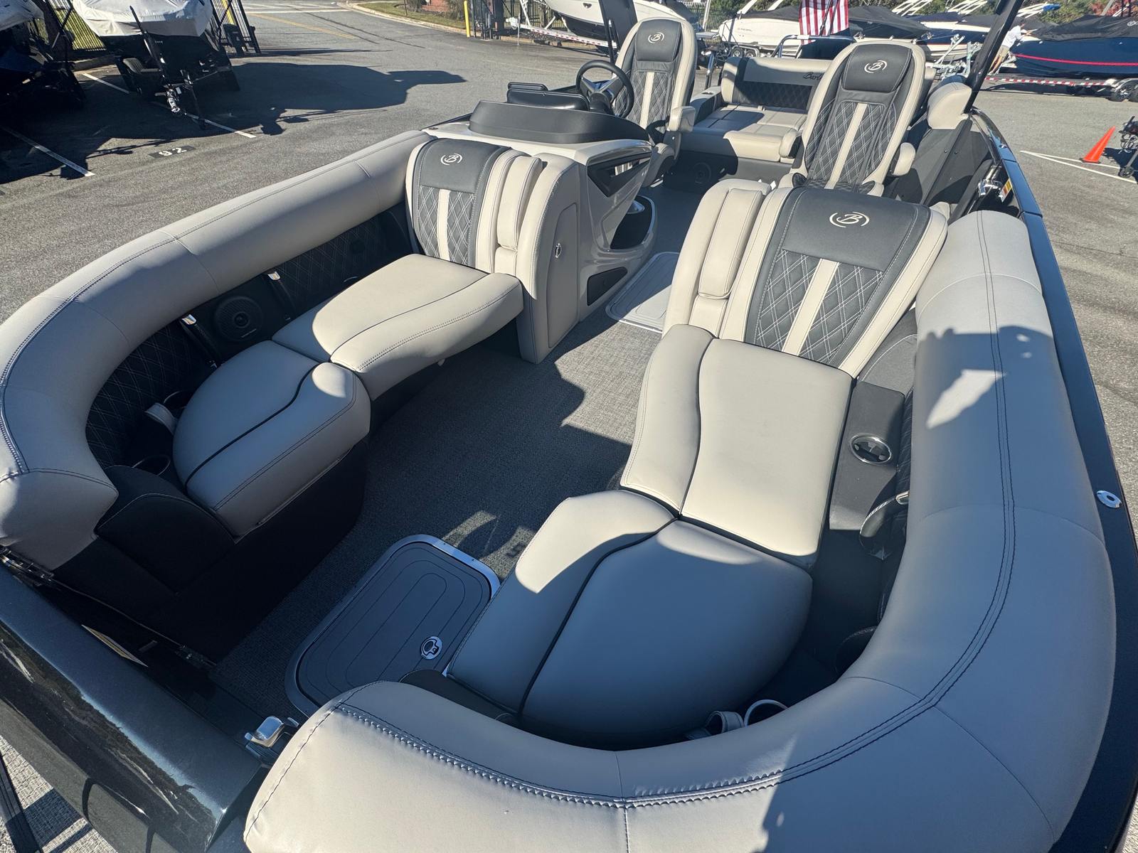 The 2026 Barletta Reserve Leggera 23UCA stands out as a premier pontoon boat, measuring an impressive 25.5 feet in length. This new model is meticulously crafted to offer ample space, comfort, and versatility, making it ideal for a wide range of recreational activities. The sleek all-black exterior exudes elegance, while the Marquesan Gray with Onyx furniture and Amore Gray flooring create a modern and inviting atmosphere. Whether you’re cruising along the shoreline or anchored for a day of fun, this pontoon boat is designed to be the centerpiece of your aquatic adventures.