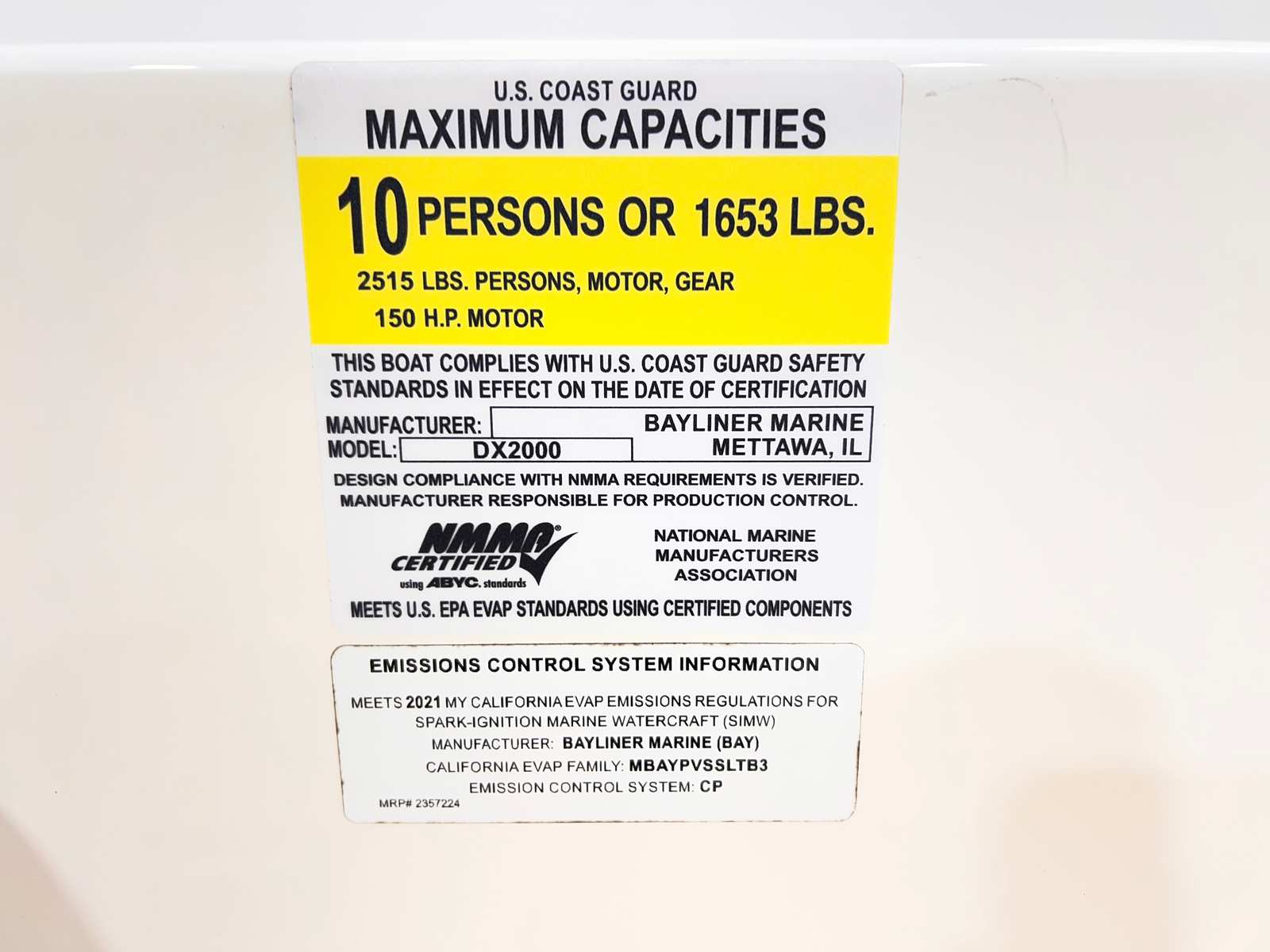The 2021 Bayliner DX2000 is a 20-foot deckboat that captures the spirit of fun and freedom on the water. With its sleek lines and contemporary styling, this used Bayliner boat for sale offers a spacious layout that maximizes every inch of its length. The DX2000 is engineered to provide ample room for socializing, sunbathing, and enjoying water sports, making it an ideal vessel for those who value both function and flair. Its 20-foot length strikes the perfect balance between maneuverability and space, allowing you to explore a variety of waterways with ease and confidence.