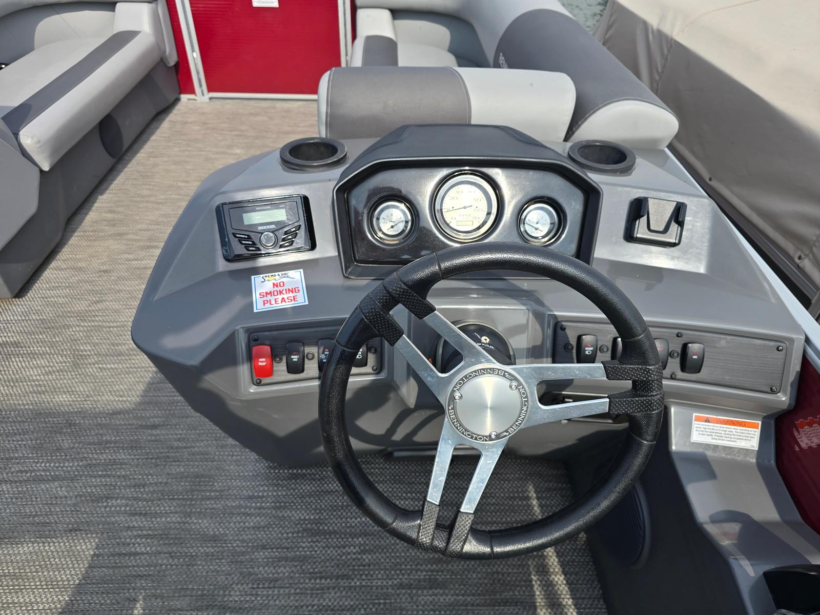 This Bennington pontoon boat is packed with features designed to maximize comfort, style, and functionality. The Shadow Grey and Anthracite color scheme, paired with the bold Rossa Red canvas and panel, creates a visually stunning appearance that stands out in any marina. The Base Furniture with Simtex Upholstery offers plush seating and durability, ensuring you and your guests can relax in style. The Dimensional Brushed Logo adds a premium touch, while the Extended Aft Deck STD Trim S SPS provides additional space for lounging, swimming, or preparing for water sports. The Ski Tow Black EAD S makes it easy to enjoy tubing, wakeboarding, or skiing, adding an extra layer of excitement to your boating experience.