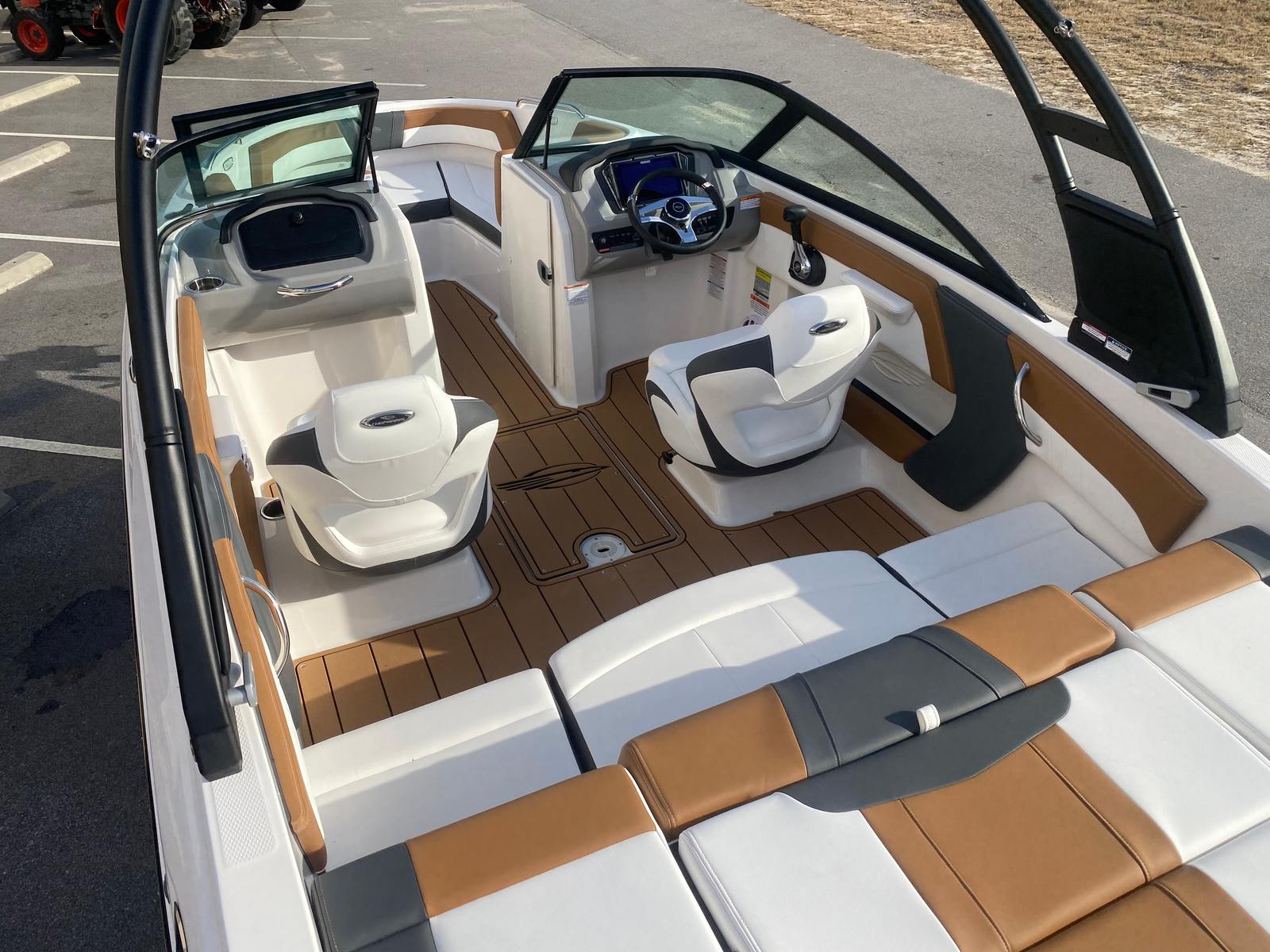 Step aboard the Chaparral 21 SSI and discover a world of premium features designed to enhance your boating experience. The deluxe package includes a digital depth gauge, allowing you to navigate with confidence and precision. The bimini top with boot or tower top canvas offers shade and protection from the elements, ensuring comfort during sunny days or unexpected showers. The ultra comfort pedestal seat with flip-up bolster for both helm and passenger provides ergonomic support and flexibility, making long journeys a pleasure.Storage is made easy with the port console storage door, perfect for stowing away gear, snacks, or personal items. Deluxe badging adds a touch of elegance, while the snap-in Seadek cockpit flooring in Cayenne and the Seadek swim platform mat in Cayenne White offer both style and safety, providing a non-slip surface for all your activities. The mooring cover keeps your boat protected when not in use, preserving its pristine condition for years to come.