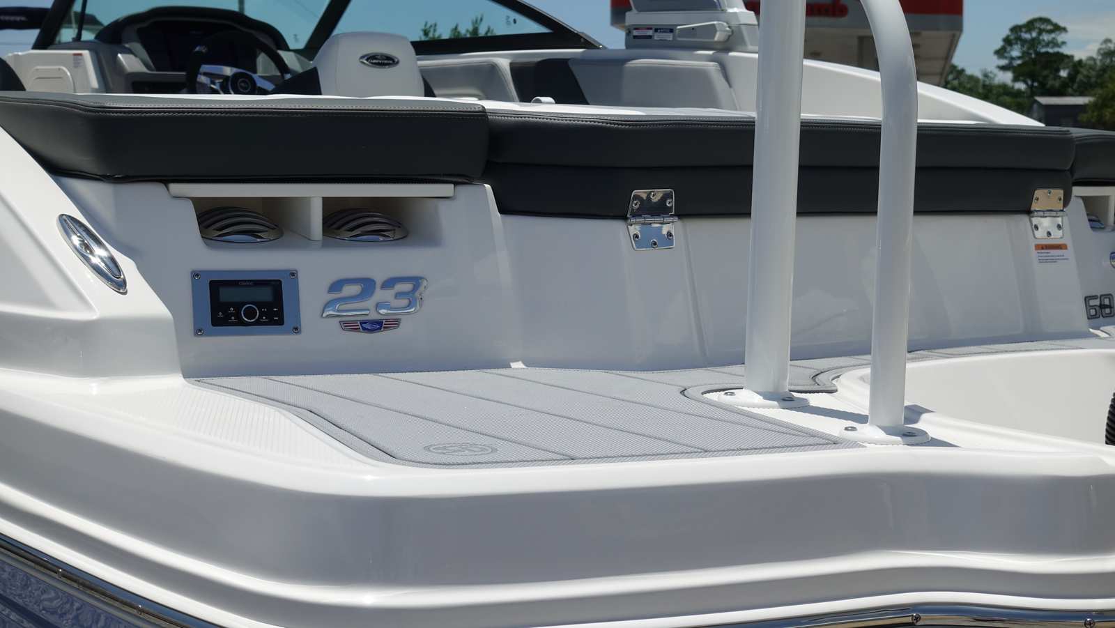 Step aboard the Chaparral 23 SSI OB and discover a host of premium features designed to enhance your boating experience. The Cockpit Interior in Sterling offers a luxurious and inviting atmosphere, while the Deluxe Package adds a digital depth gauge, Bimini Top with Boot or Tower Top Canvas, Ultra Comfort Pedestal Seats with flip-up bolsters for both helm and passenger, Port Console Storage Door, and Deluxe Badging. The custom-painted Yamaha engine in white not only delivers powerful performance but also adds a touch of elegance to the boat’s overall aesthetic.Enjoy the convenience of the dual battery setup with a crossover switch, ensuring reliable power management for all your onboard electronics. The Standard Canvas in Steel Blue complements the hull side gelcoat, creating a cohesive and stylish appearance. For water sports enthusiasts, the white powder-coated ski tow provides a sturdy and attractive solution for towing activities. The Clarion transom remote allows you to control your music from the swim platform, keeping the party going wherever you are on the boat.Practicality meets style with the galvanized anchor, offering secure mooring options, and the aluminum tandem axle trailer with brakes and galvanized wheels, making transportation and storage a breeze. Every detail of the Chaparral 23 SSI OB has been thoughtfully designed to maximize comfort, convenience, and enjoyment.