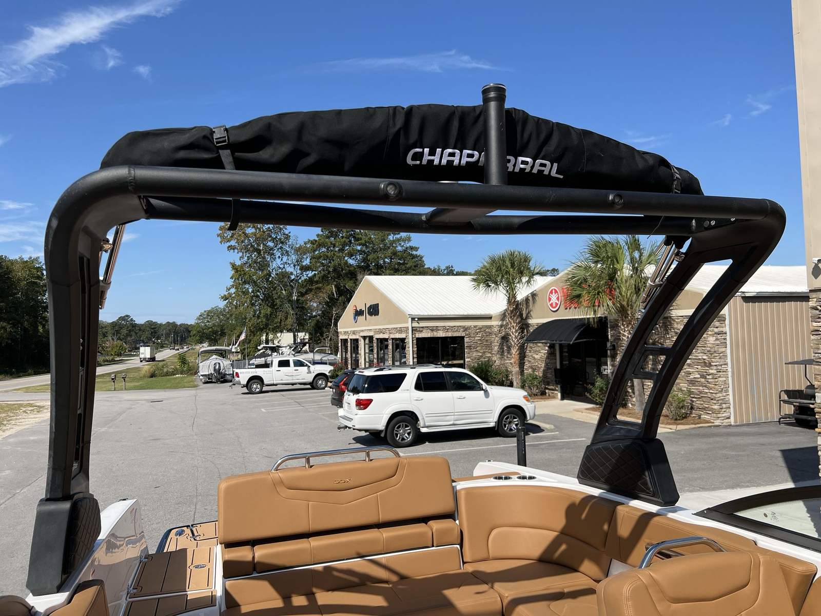 This Chaparral boat for sale is loaded with premium features designed to enhance your boating experience. The Standard Canvas in Black offers protection from the elements, while the Premium Package adds a suite of thoughtful upgrades, including a Bow Scuff Plate, Transom Stereo Remote, Transom Tilt Switch, four Fender Holders, and an Air Pump for added convenience. The JL Audio Sound System Upgrade transforms the cockpit into an entertainment hub, delivering crystal-clear sound for your favorite playlists. Snap-In Seadek Cockpit Flooring in Cayenne provides comfort underfoot and easy maintenance, while the docking lights ensure safe and stress-free arrivals at any marina. Every detail is crafted to elevate your time on the water, from the stylish graphics to the functional enhancements.