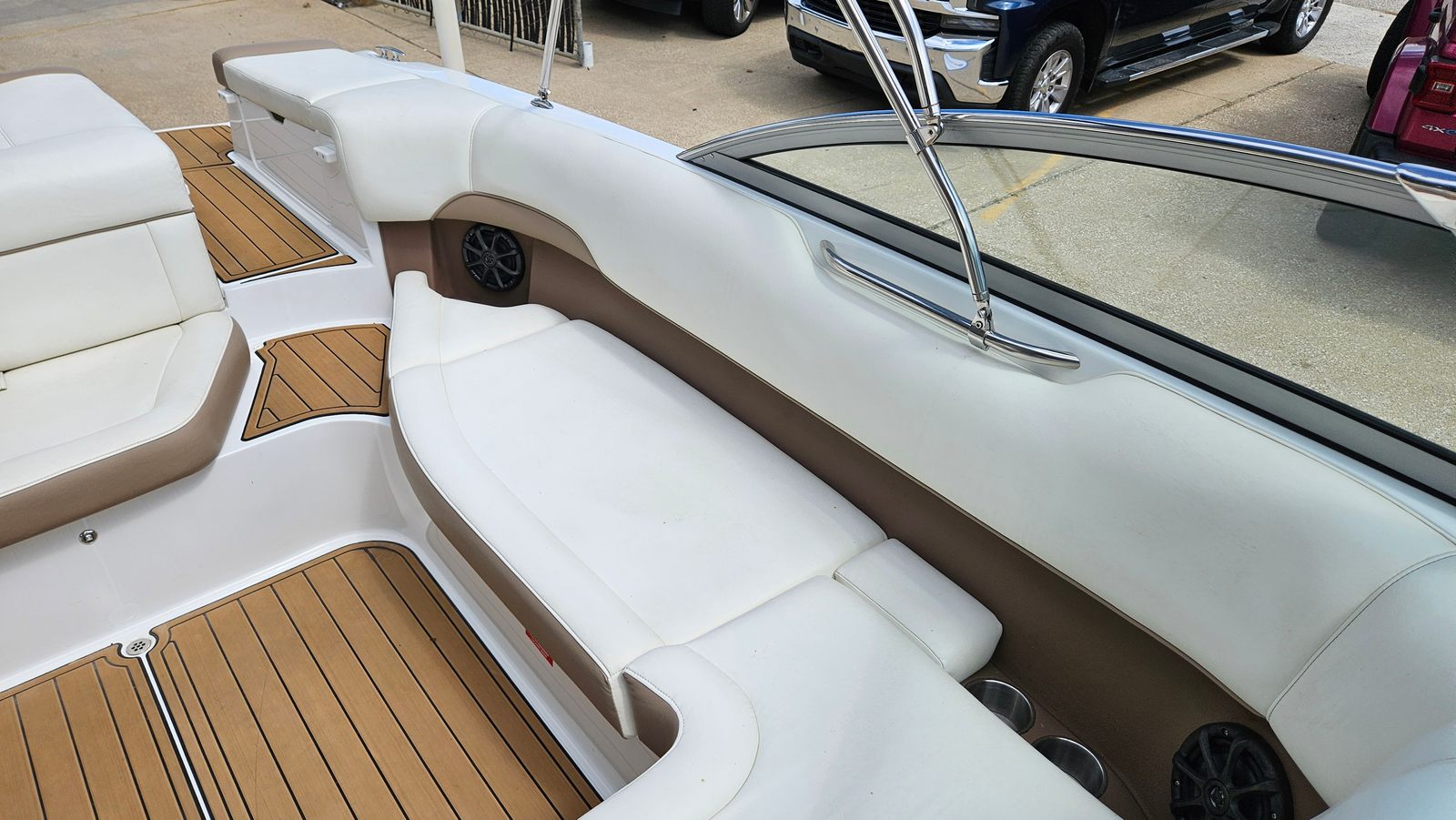 The 2013 Cobalt 220 is as practical as it is fun. The tandem axle trailer simplifies launching, retrieving, and storing the boat, making it convenient for owners who want to explore different waterways or store their boat off-season. The efficient Volvo engine offers a balance of power and fuel economy, helping you make the most of every outing without breaking the bank. The Sea Deck flooring is easy to clean and maintain, ensuring your boat stays looking great with minimal effort. The counter rotating props provide added confidence when docking or maneuvering in tight spaces, making this bowrider boat for sale a smart choice for both new and experienced boaters.