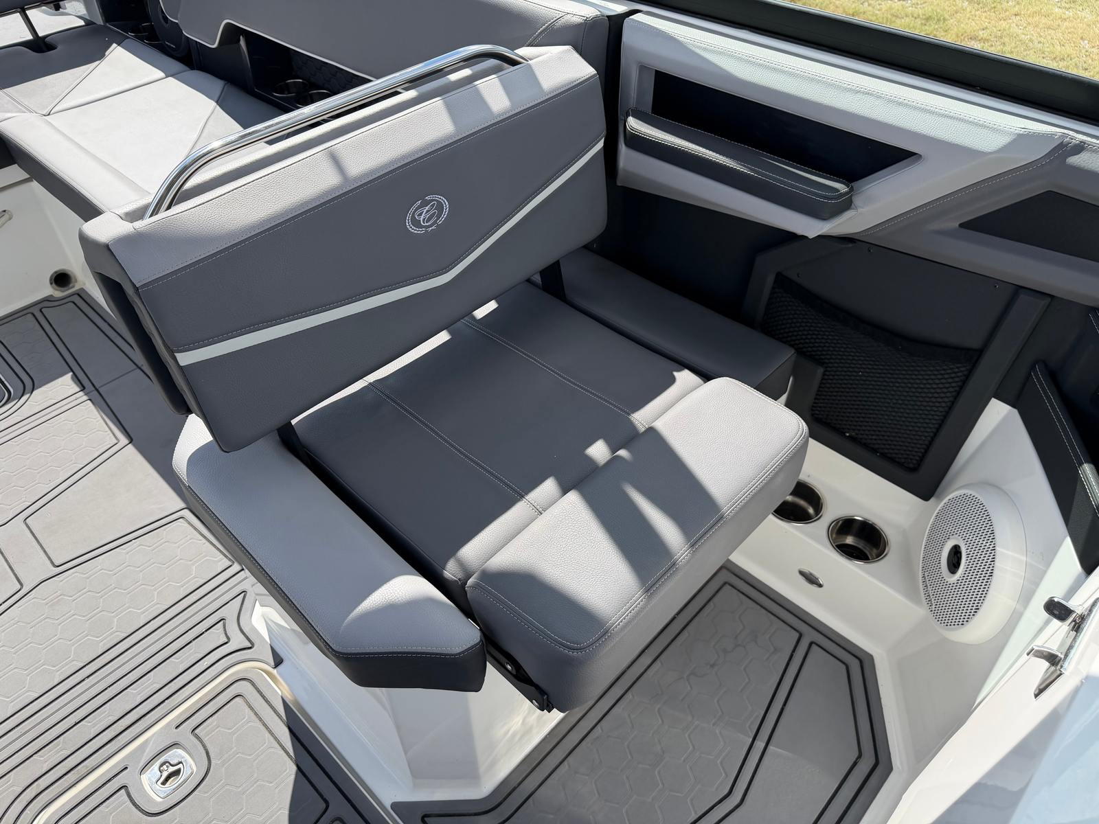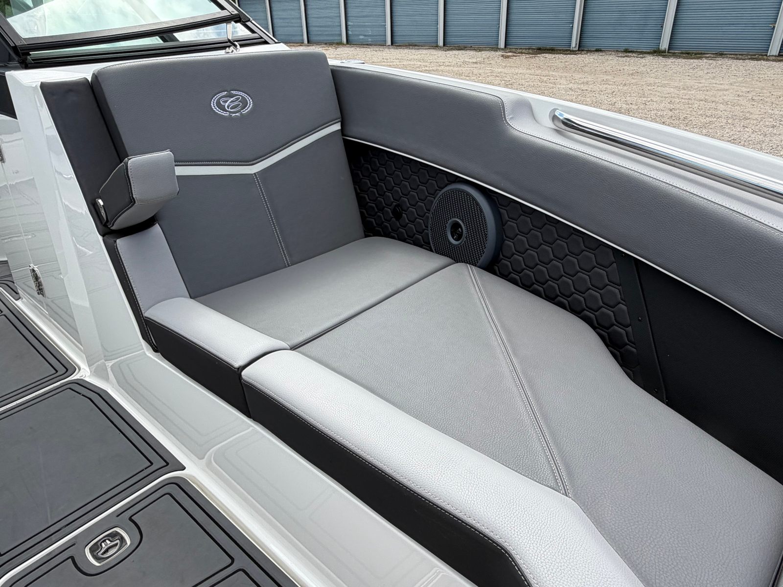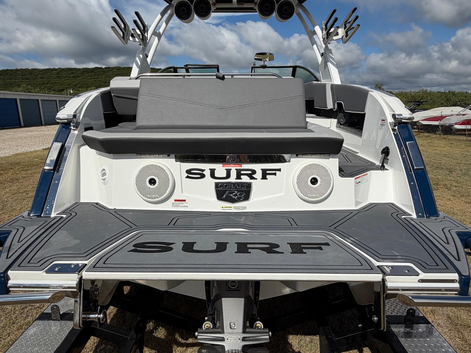 The Cobalt R8 Surf is packed with features that enhance both its functionality and enjoyment. As a bowrider, it offers an open and inviting layout, perfect for socializing and soaking up the sun. The spacious bow seating area provides a comfortable spot for passengers to relax, while the cockpit is designed for both convenience and luxury. High-quality materials and attention to detail are evident throughout, reflecting Cobalt’s commitment to craftsmanship and durability.This model’s surf capabilities set it apart from other bowriders. The R8 Surf is engineered for water sports enthusiasts, offering a smooth and customizable wake for surfing, wakeboarding, and more. The intuitive controls make it easy to adjust the wake to suit different skill levels, ensuring everyone can have a great time on the water. The boat’s length of just over 27 feet provides ample space for gear, coolers, and all the essentials needed for a day of fun.