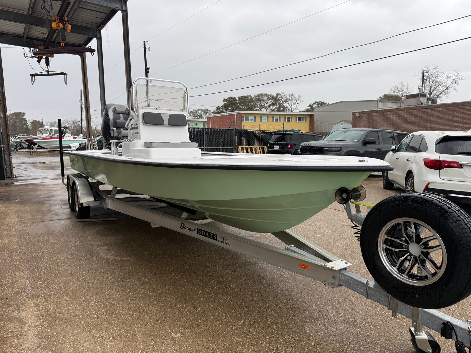 The Dargel Kuda 250 Center Console comes loaded with premium features that set it apart from the competition. The racing seat upgrade offers superior comfort and support, perfect for long days chasing the horizon or battling the big catch. Custom front cushions add a touch of luxury and relaxation, inviting you and your guests to unwind in style. The matte black upgrade and custom hull color not only enhance the boat’s visual appeal but also reflect a commitment to quality and attention to detail. Transporting your boat is a breeze with the included 250 Kuda trailer, designed for durability and ease of use. Every element, from the blinker jack plate switch to the upgraded shaft, is engineered to deliver a seamless and enjoyable boating experience.