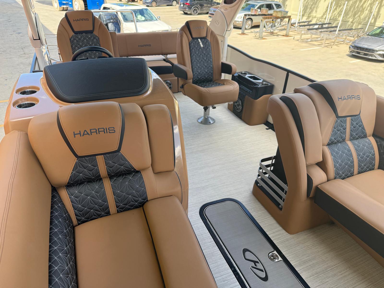 New to the market (9/2025), this 2024 Harris Grand Mariner 250 does not disappoint!! She is powered by a Mercury 350L V10 Verado with only 38 HOURS. She has a Collapsible Tower with Power Lift...press of a button at the Helm. Her Chestnut Brown upholstery with ONYX accents is stunning. She has double Captains Chairs with U-Lux (Hiback) and elevated Helm. Operating this GEM is extremely smooth with her Mercury Power Assist Steering.