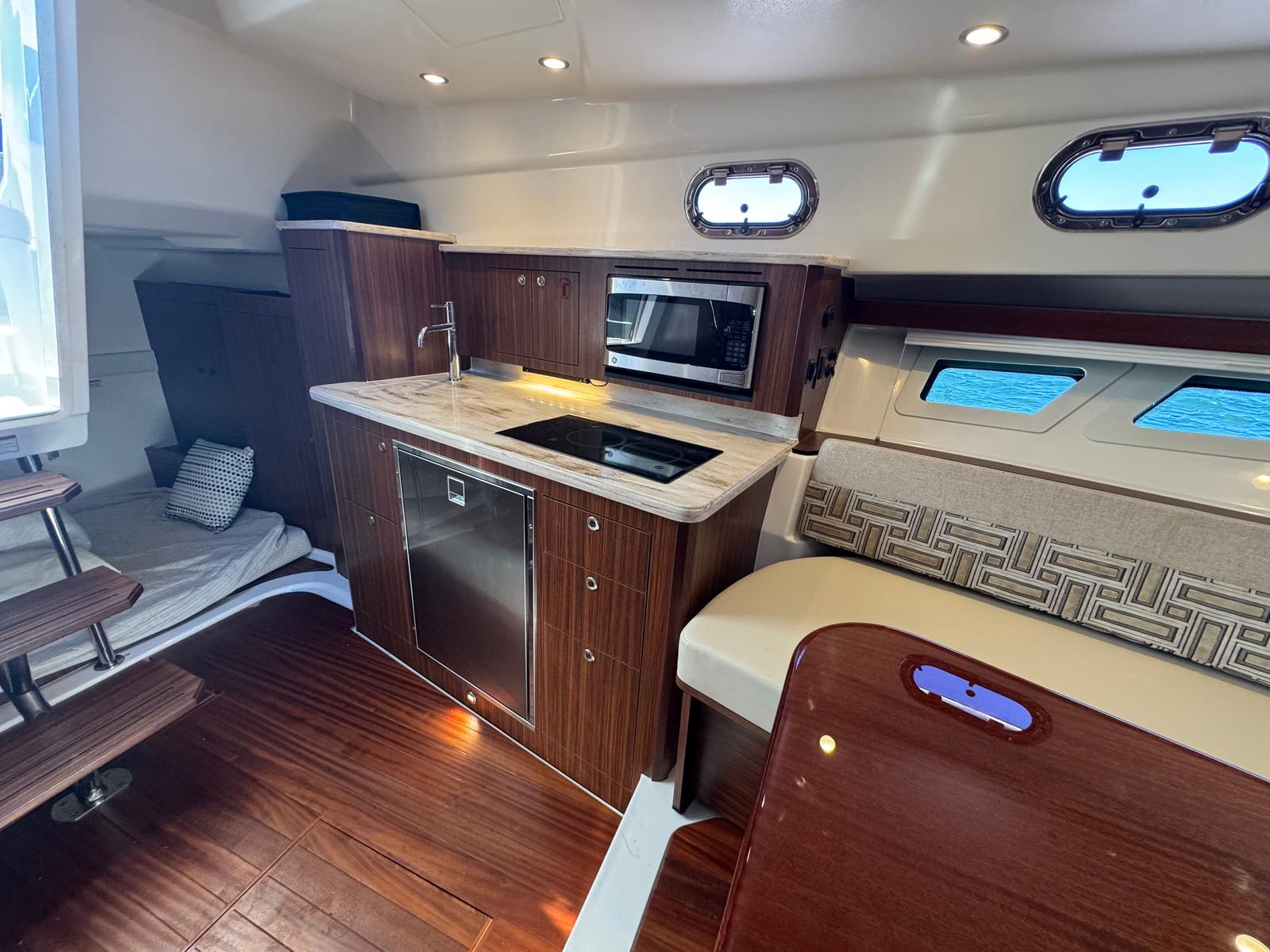 The Pursuit OS 355 Cruiser is designed with both functionality and luxury in mind. Its spacious layout allows for comfortable seating, generous deck space, and easy movement throughout the boat. The 37.92-foot length ensures that you have plenty of room for guests, gear, and activities, making it a versatile platform for everything from family outings to entertaining friends. Pursuit’s attention to detail is evident in the quality of materials, the thoughtful design of the cabin and cockpit, and the overall fit and finish of the boat.Special features of the Pursuit OS 355 include its triple-engine configuration, which not only enhances performance but also provides added reliability and safety. The engines’ combined 900 horsepower allows for swift acceleration and smooth cruising, while the low engine hours mean you can enjoy peace of mind knowing the boat is in excellent condition. The used status of this Pursuit boat for sale offers a fantastic opportunity to own a nearly new vessel at a competitive price, making it a smart investment for boating enthusiasts.
