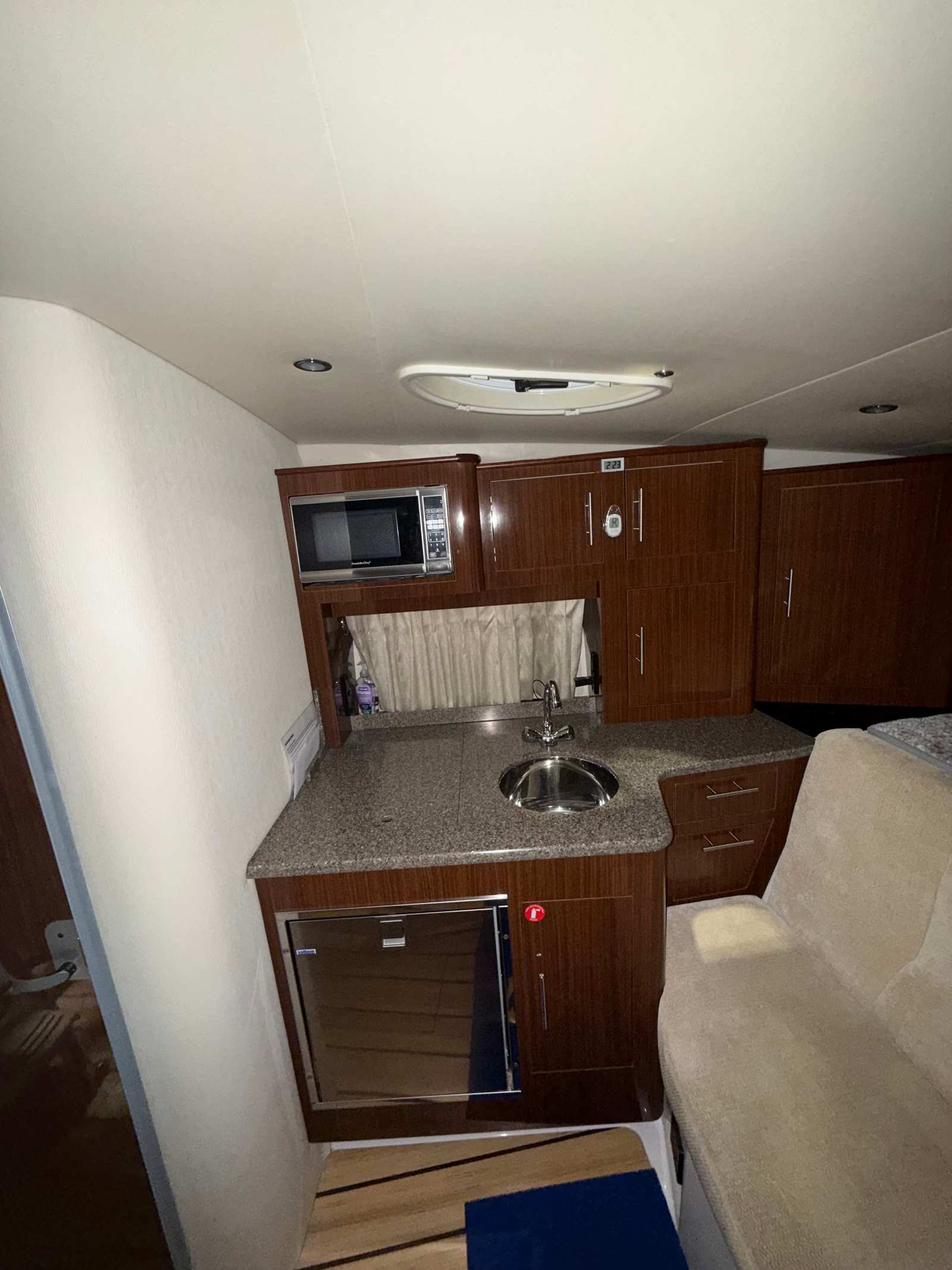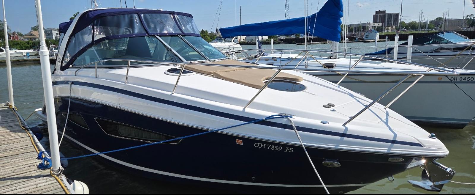 This cruiser boat for sale is equipped with a range of special features that enhance both comfort and convenience. The four onboard batteries ensure reliable power for all your electronics and amenities, while the battery charger keeps everything running smoothly during extended trips. The aft bench seat and aft cabin stateroom provide versatile seating and sleeping options, making it easy to accommodate family and friends for overnight stays or day cruises. Elegant cabinetry adds a touch of sophistication to the interior, offering practical storage solutions for your gear and personal items.The camper enclosure, featuring navy canvas that is only three years old, offers protection from the elements and extends your boating season. The cockpit carpet adds a layer of comfort underfoot, while the ample cockpit storage keeps your space organized and clutter-free. These features combine to create a welcoming environment that’s perfect for entertaining, relaxing, or simply enjoying the beauty of the water.