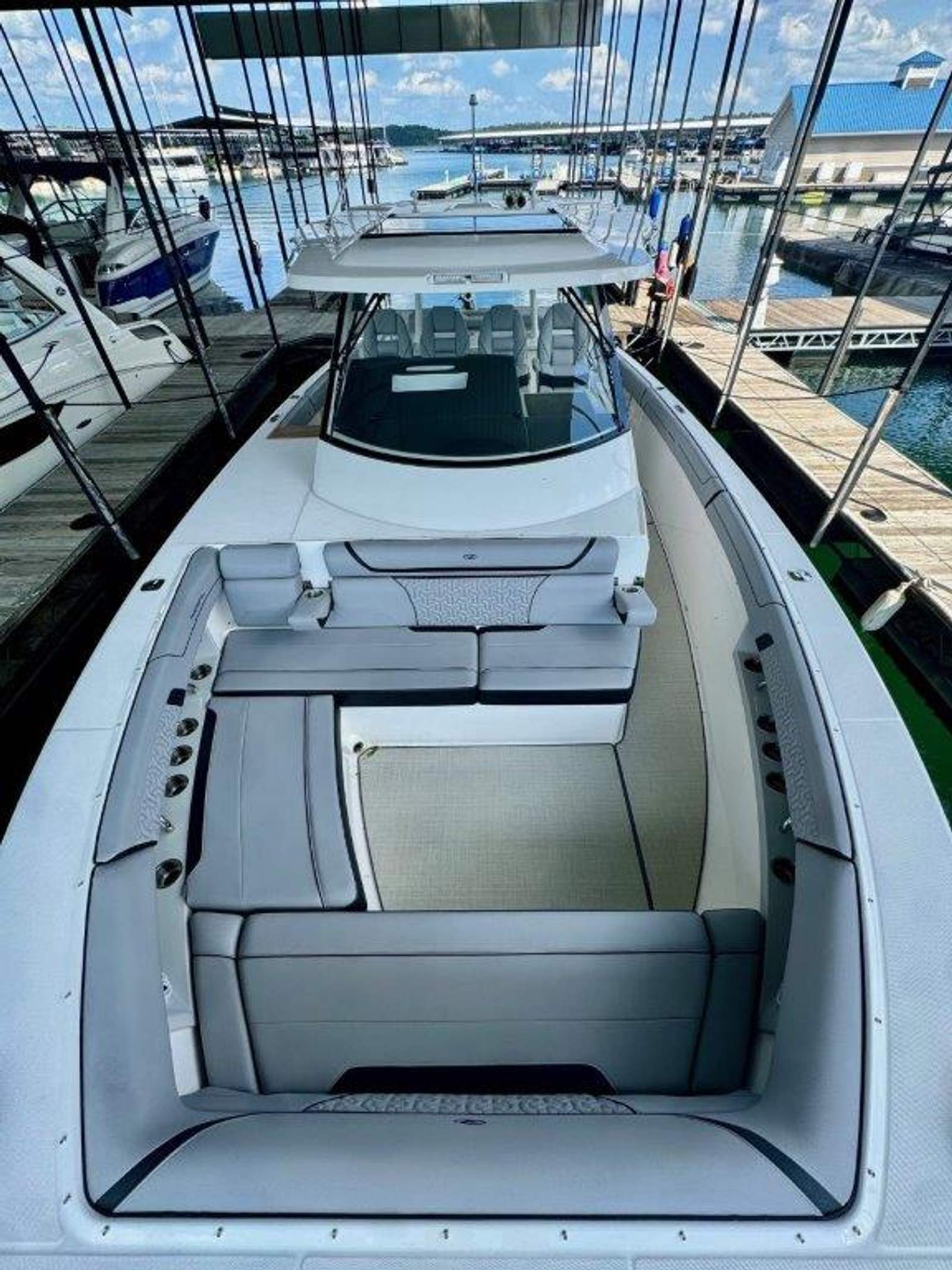 This particular 38 Surf is equipped with a wide range of upgrades designed for comfort, entertainment, and time on the water. Highlights include digital switching, cockpit and cabin A/C and heat, bow thruster, electric aft shade, cockpit TV, cockpit grill, dual cockpit refrigerators, and the Ultimate JL Audio package with satellite tuner and antenna. Additional features include the Ultimate RGBW underwater lighting package, underwater power platform with ReFLEX swim platform, windlass with rope and chain, Garmin VHF radio, cockpit Seagrass flooring, stainless steel upgrade package, bow and seat covers, toasted oak salon flooring, and mosaic countertops.